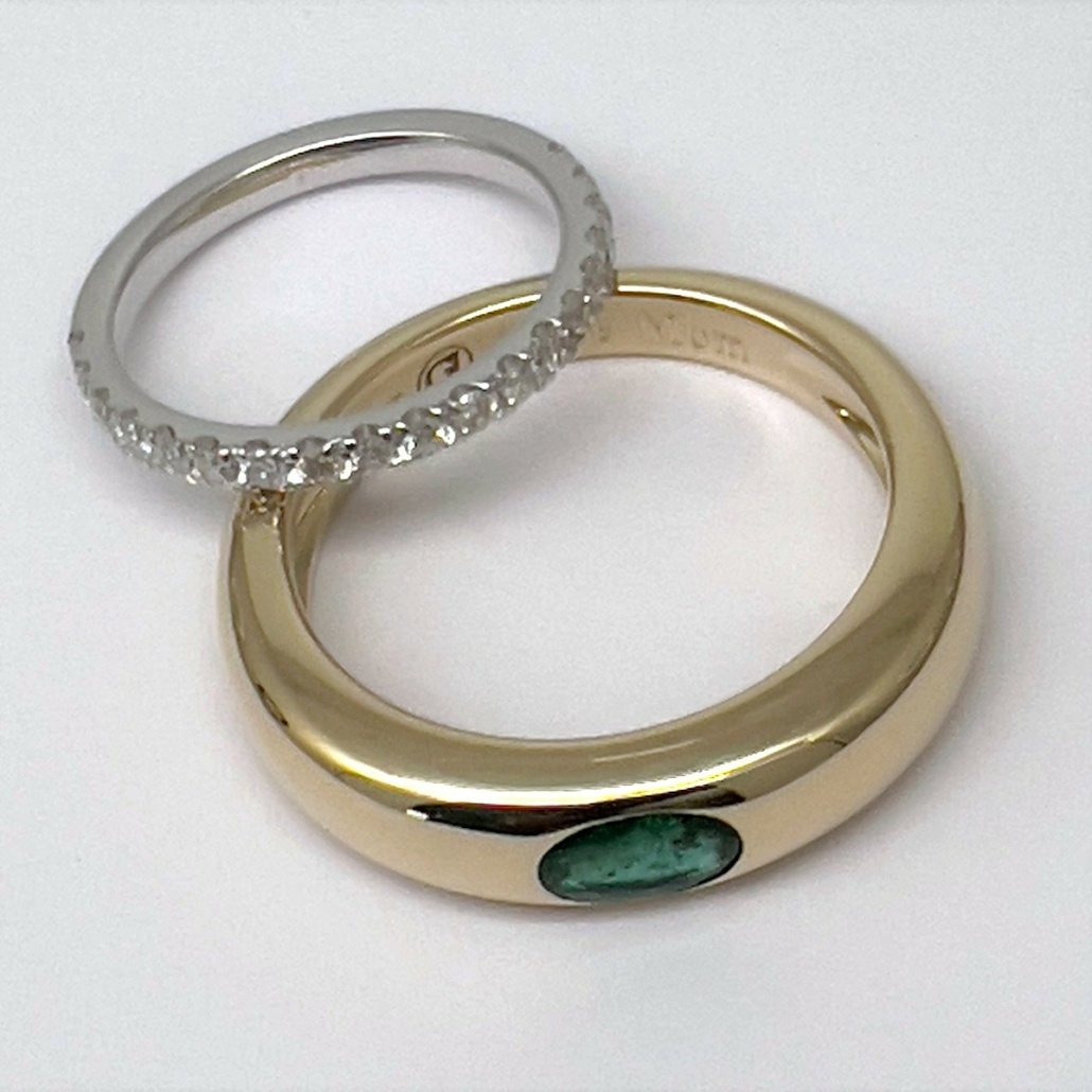 I carefully removed the stones, valued the gold and proceeded to make two rings for Laura. We also added “Love, Mom” to the inside of the emerald ring. She was thrilled with the results and now has two pieces she can wear daily to look at and remember her beloved mom.