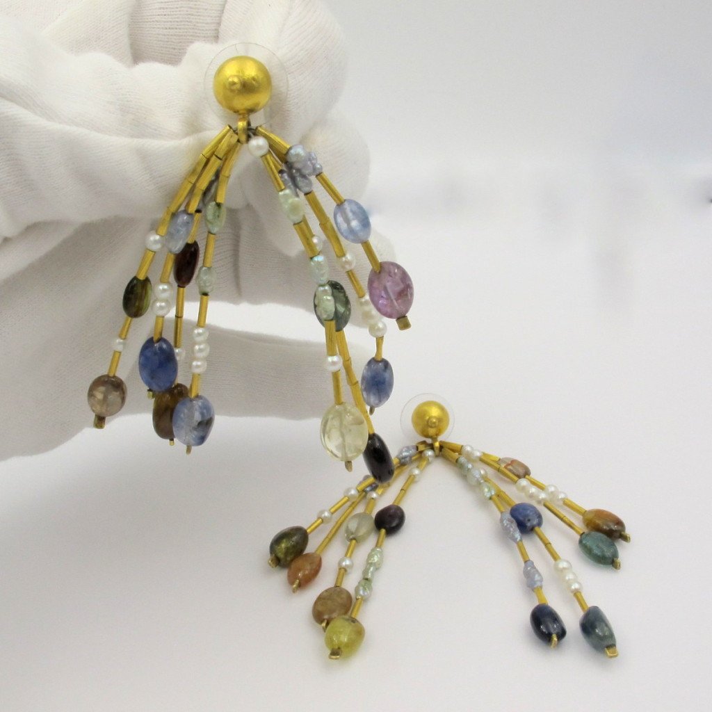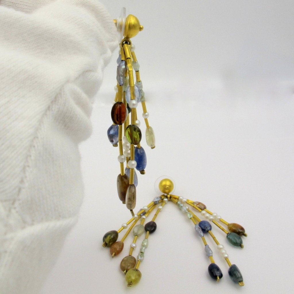 Tags 24k Gold, 24k Gold Earrings, 24k Gold Jewelry, 24k Yellow Gold, Hand-Strung, Multi-Colored, Pearl Earrings, Pearls, Sapphire, Sapphire Earrings, Sapphire Jewelry, Sapphire Pearls