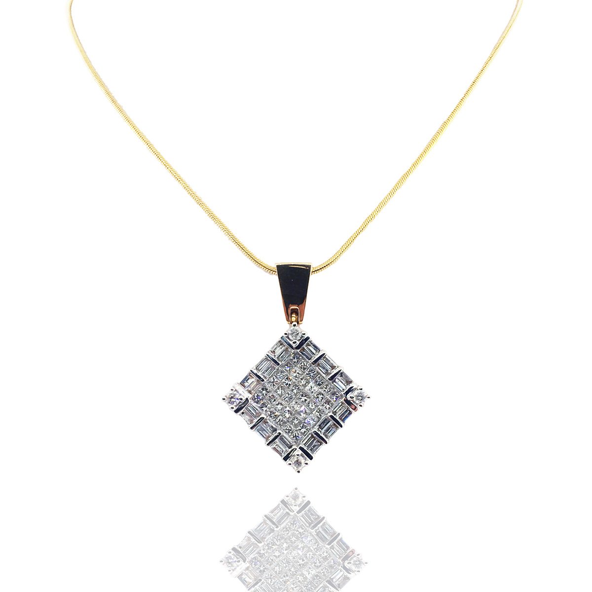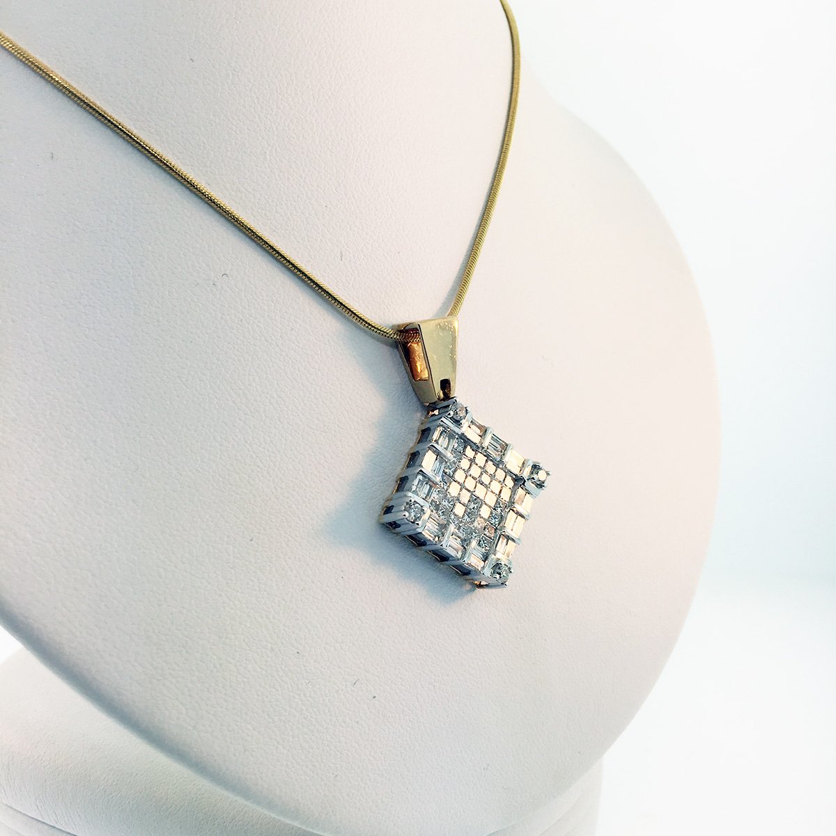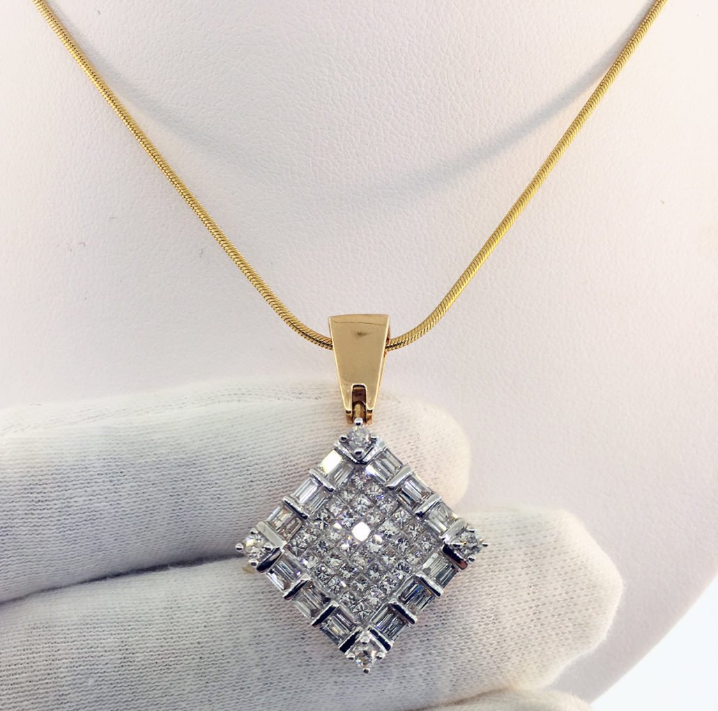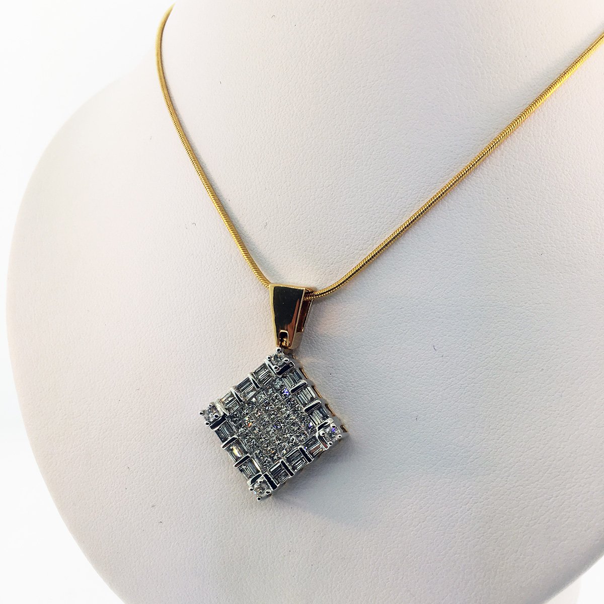 This pendant is made of 14k yellow and white gold. The diamonds are 24 straight baguettes, 36 princess cut and 4 round diamonds set to create a cluster square. And a 14k yellow gold rope chain.