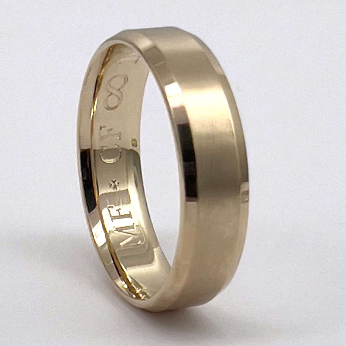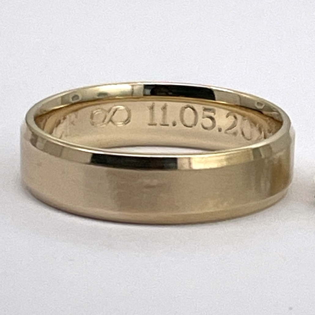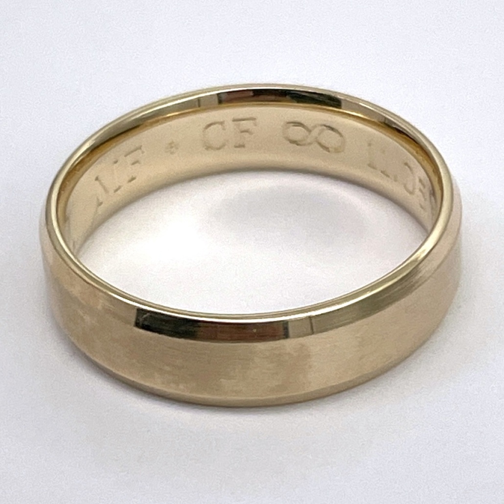 Traditional wedding band made with 14k yellow gold.