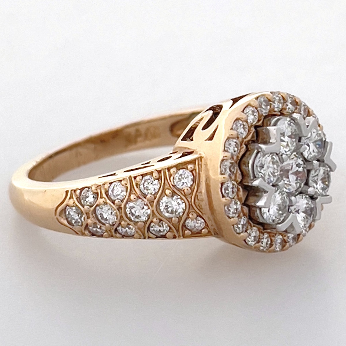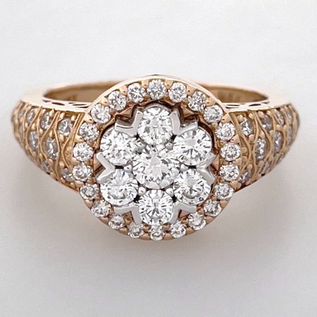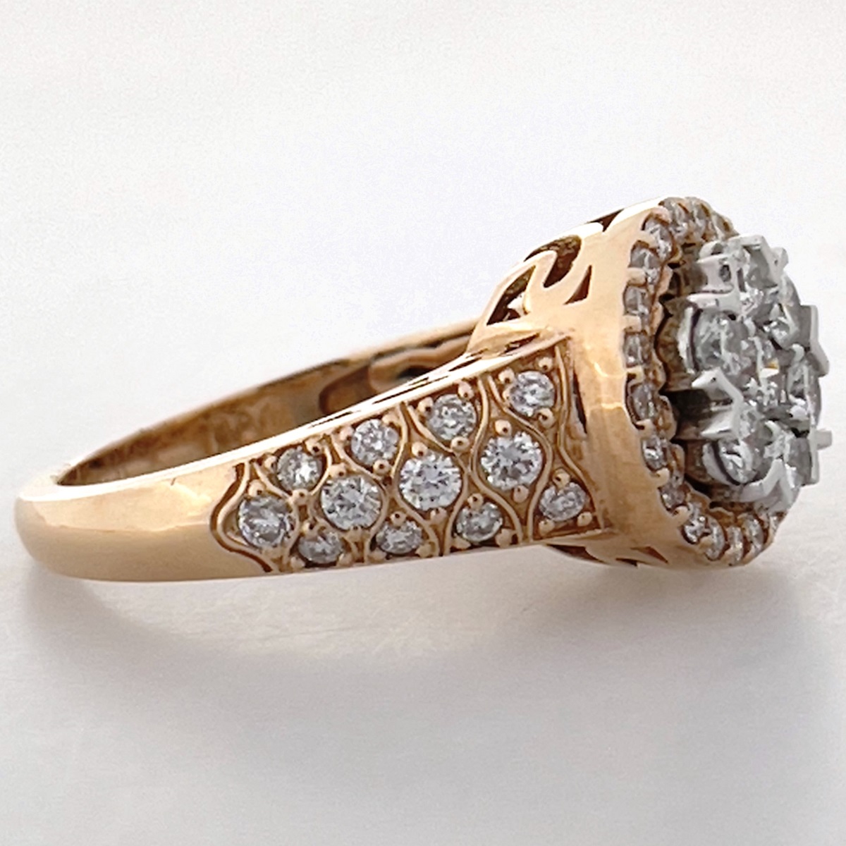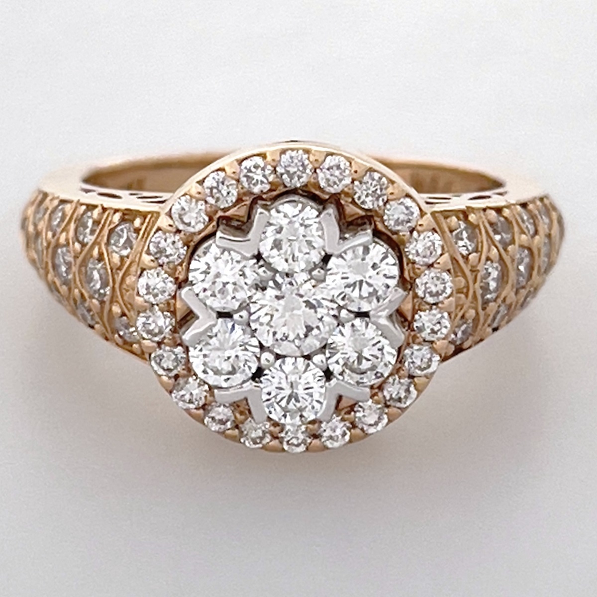 This cocktail ring is made with 14k pink gold and natural round brilliant diamonds. Center of the ring is a cluster of diamonds set within a diameter of the ring top and surrounded by a halo of smaller diamonds. The ring shoulders are also adorned with custom prong set diamonds. The ring has a beautiful airline gallery. The diamonds on this ring are custom prong set.