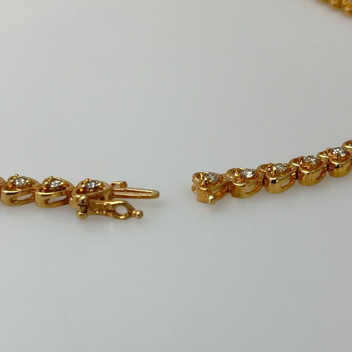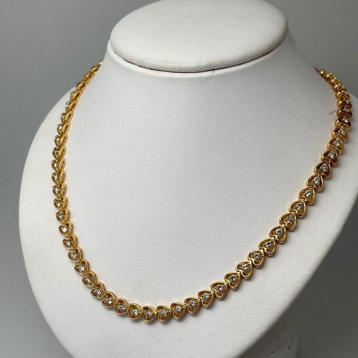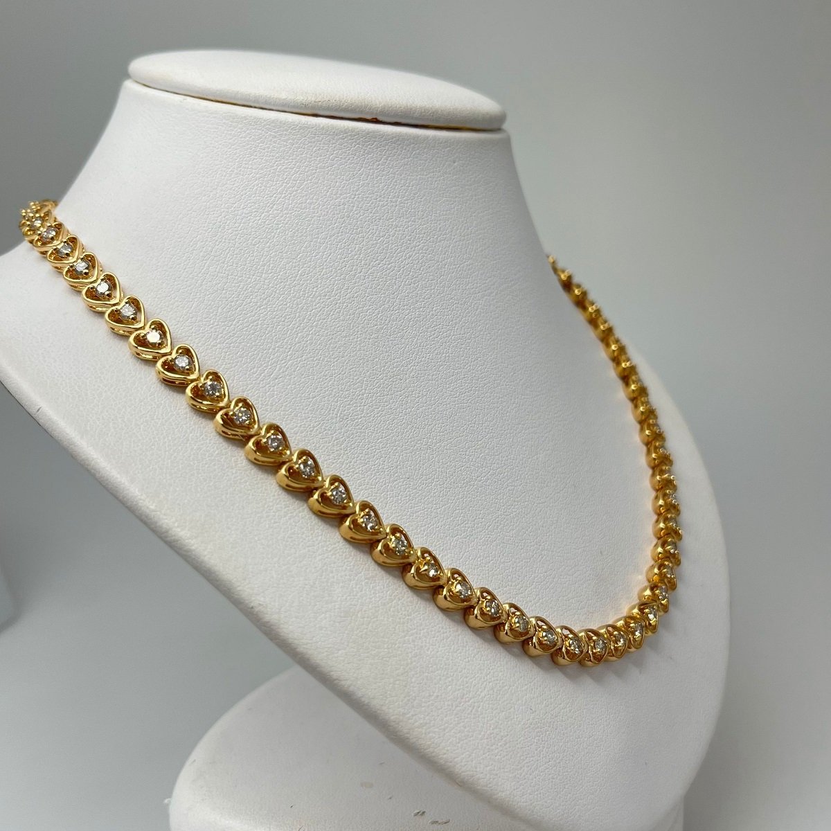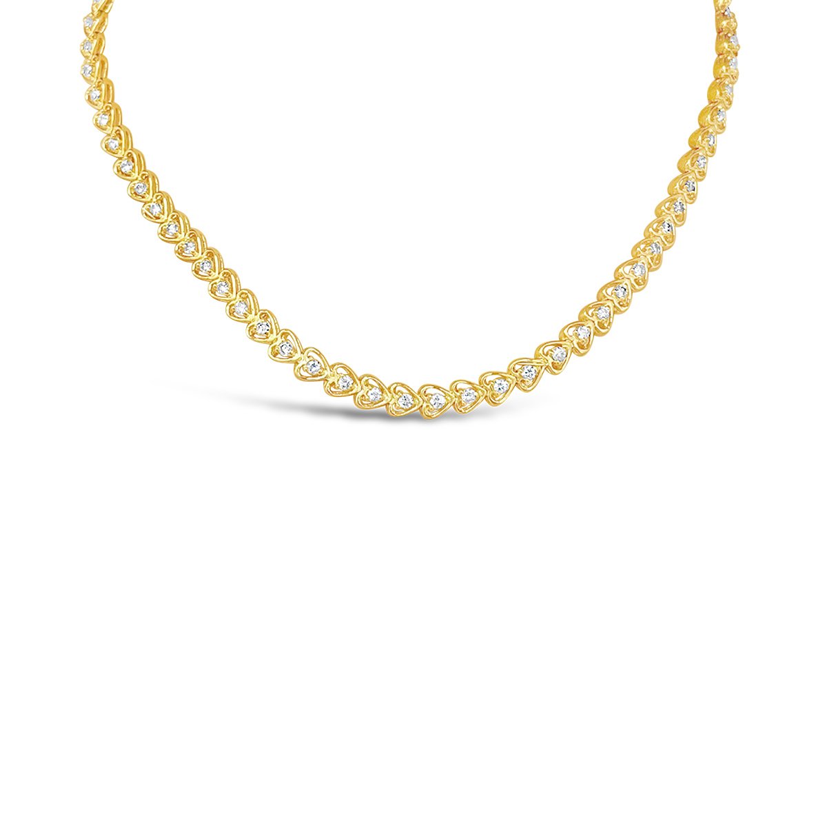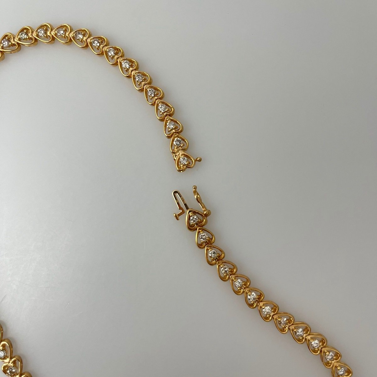 Seventy fluid open heart shaped links joined end to end, with a natural round brilliant diamond in the center of each heart.