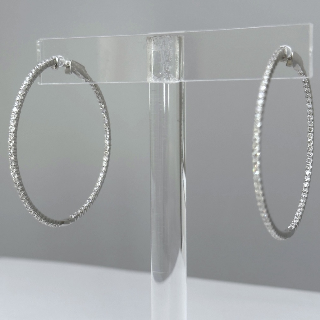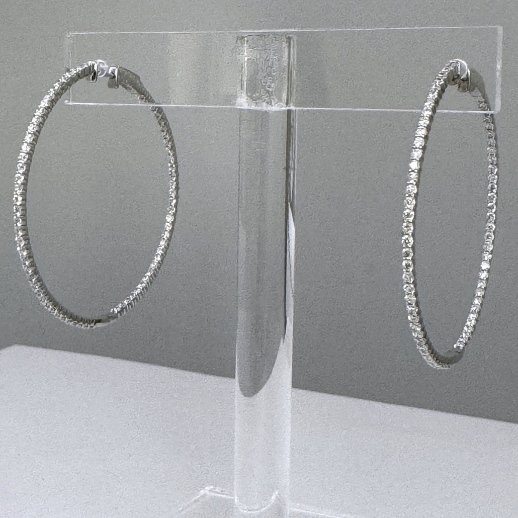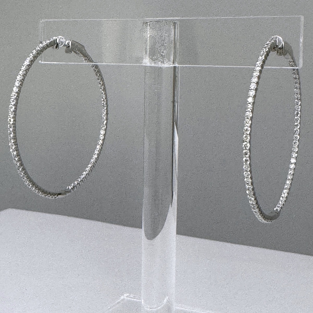 These hoop earrings are made with 14k white gold and natural round brilliant diamonds that are prong set.