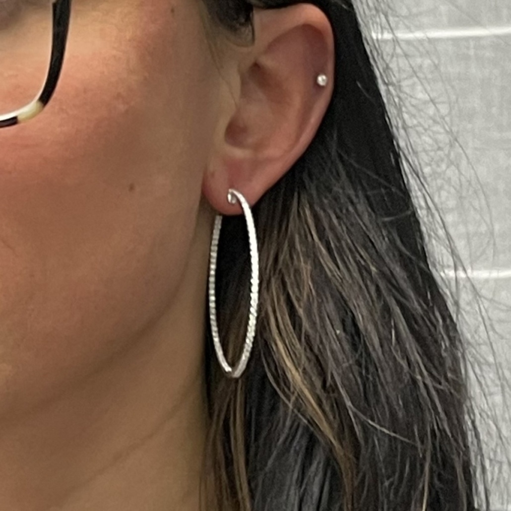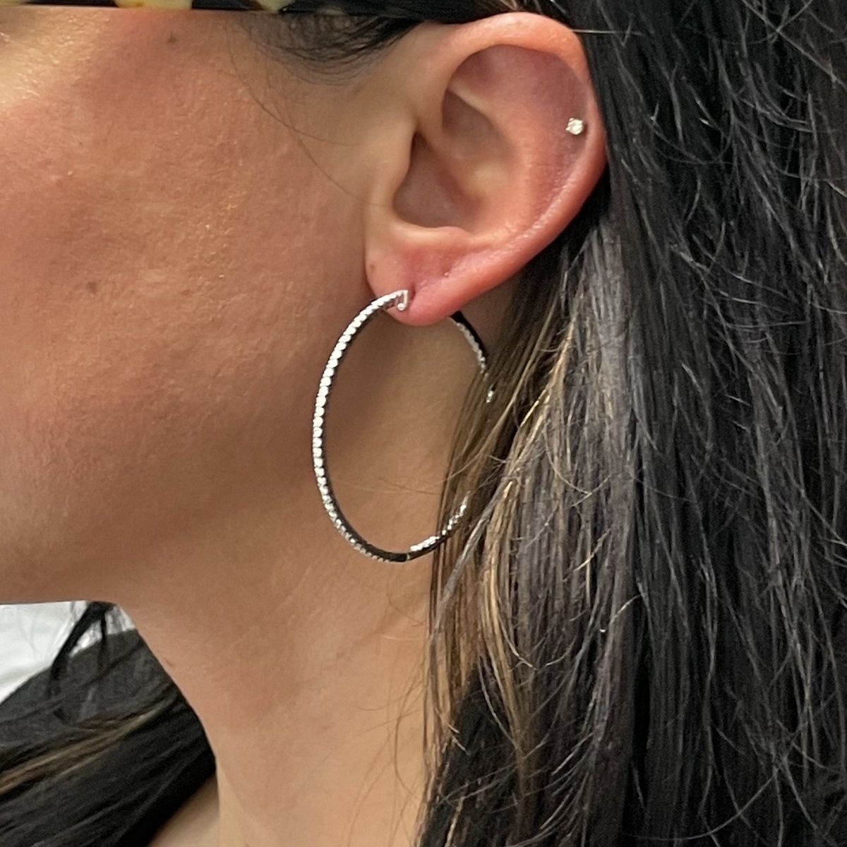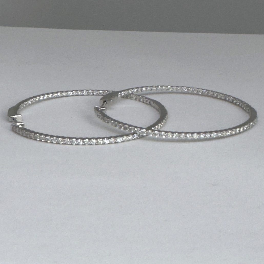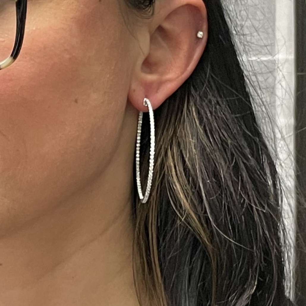 These hoop earrings are made with 14k white gold and natural round brilliant diamonds that are prong set.