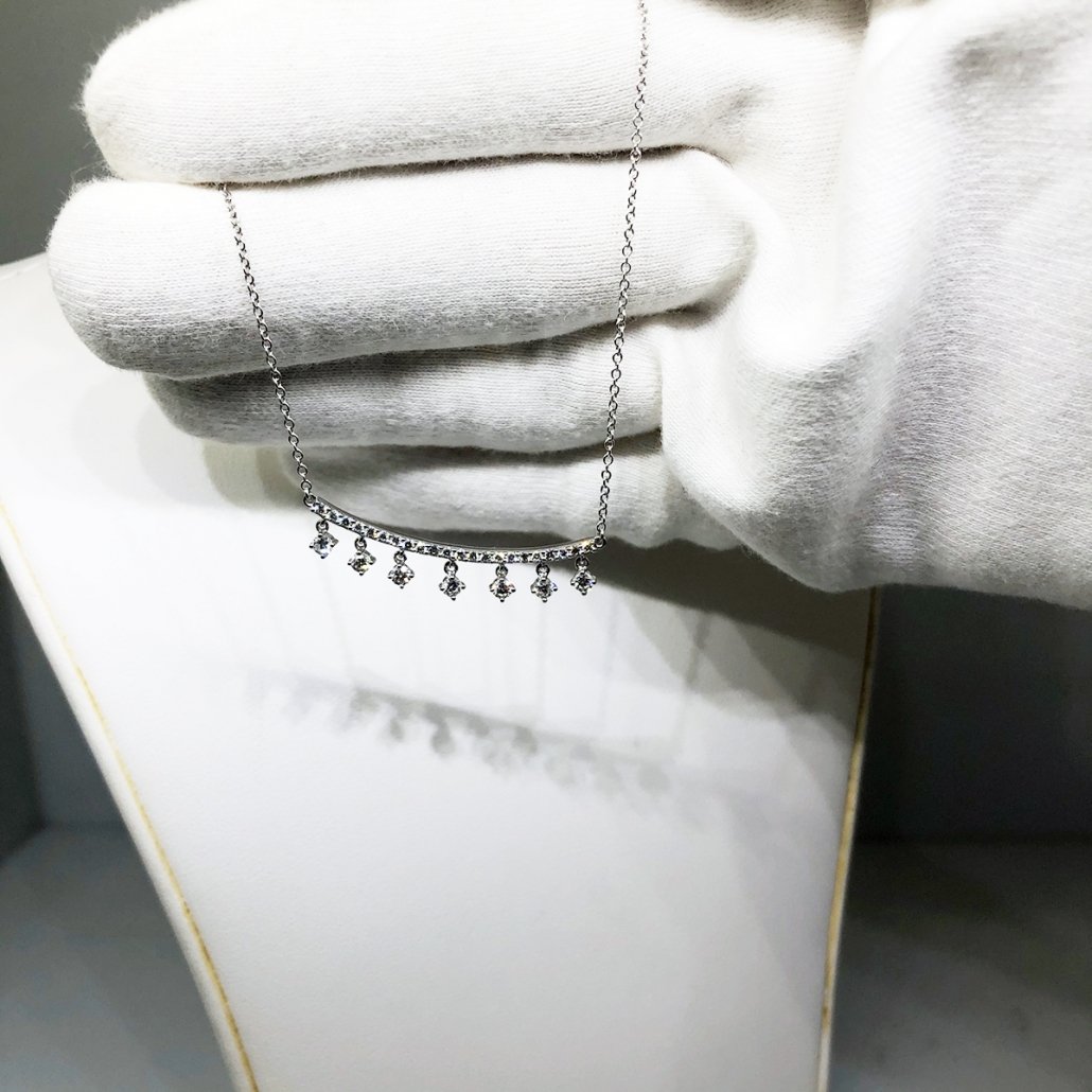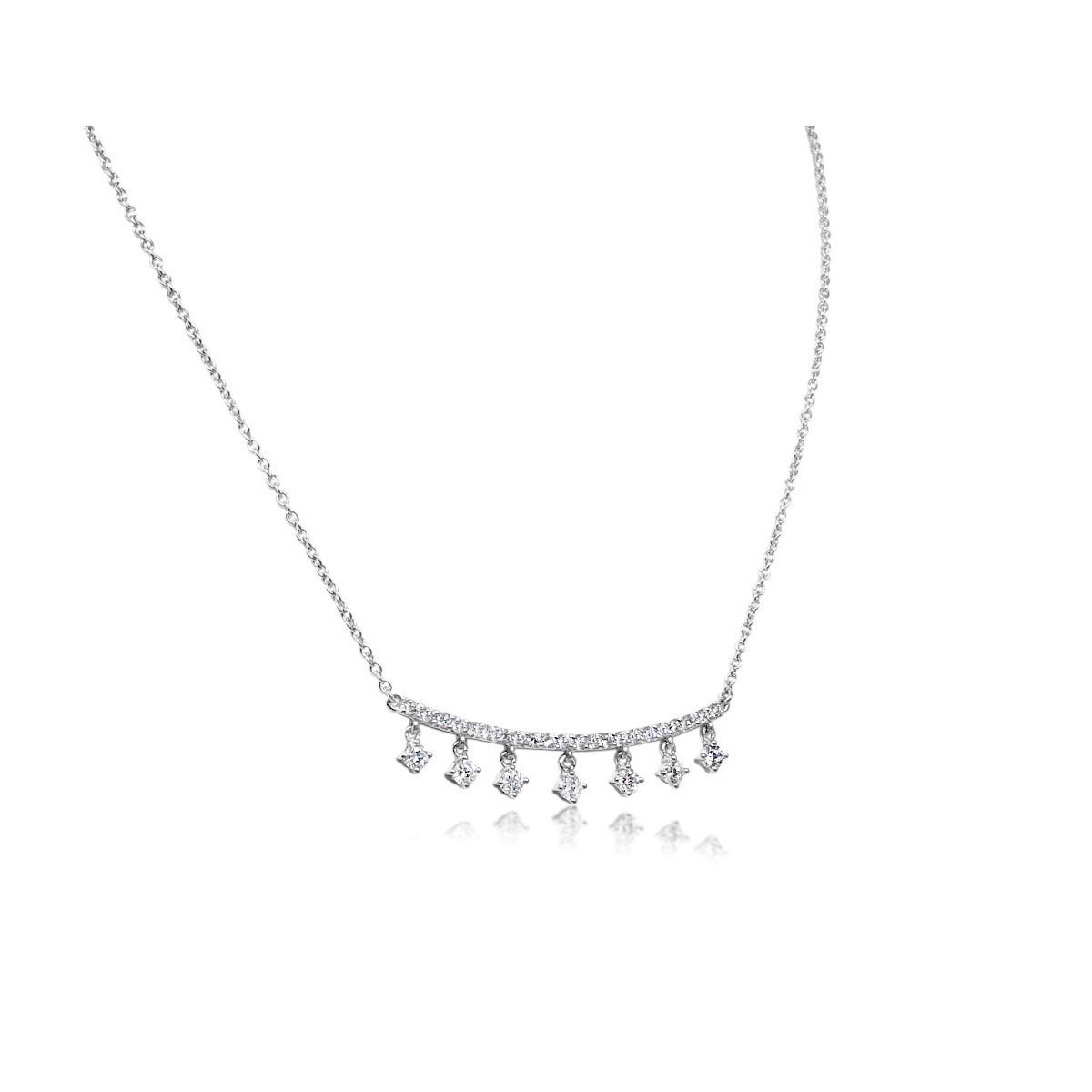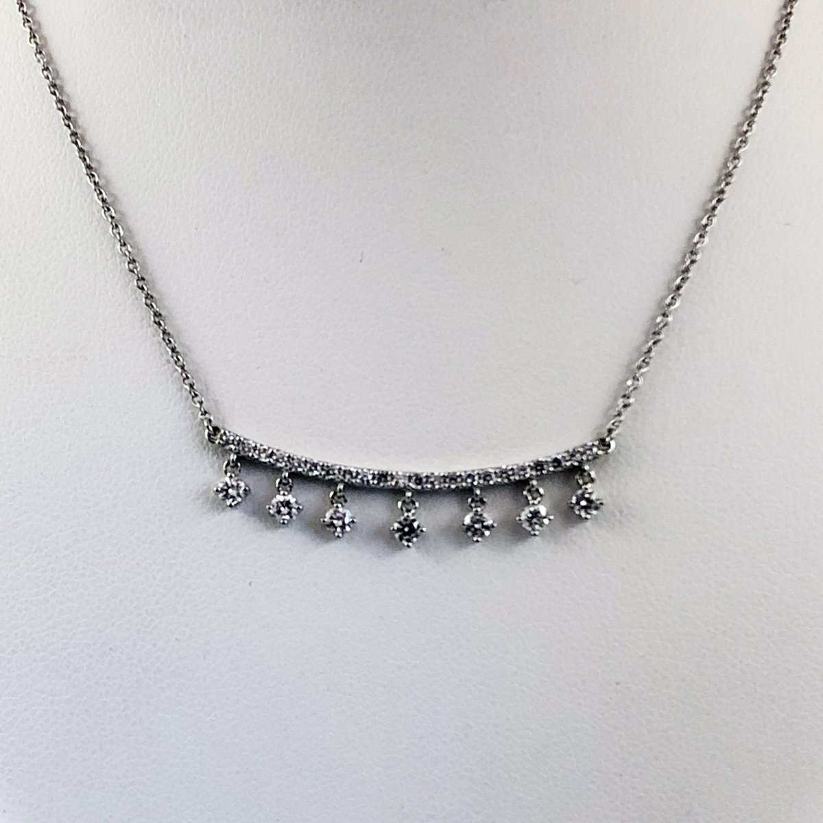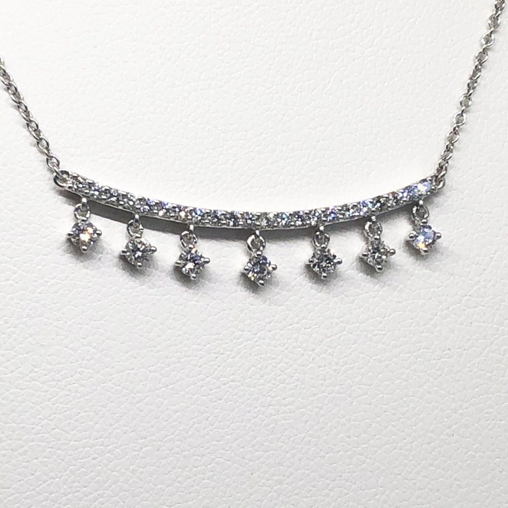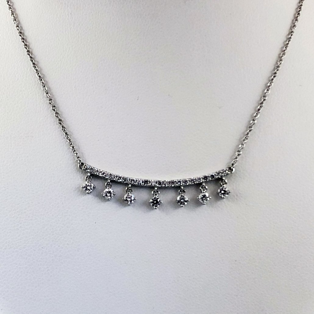 14K White Gold and Diamond Curved Bar Necklace with Dangling Diamonds