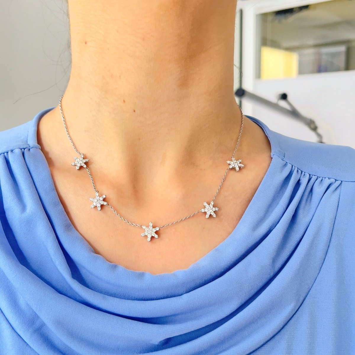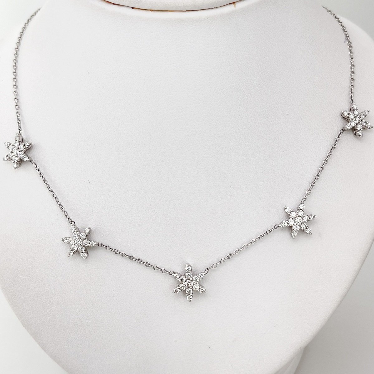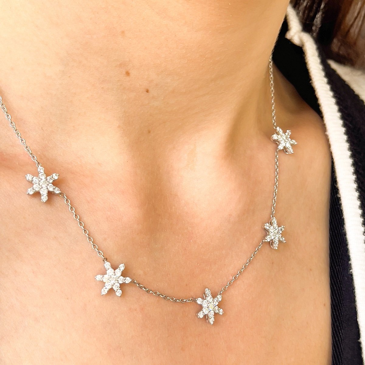 The stars are out tonight! This necklace will shine like stars against a midnight sky. Five diamond stars are evenly spaced around the front half of the necklace.
