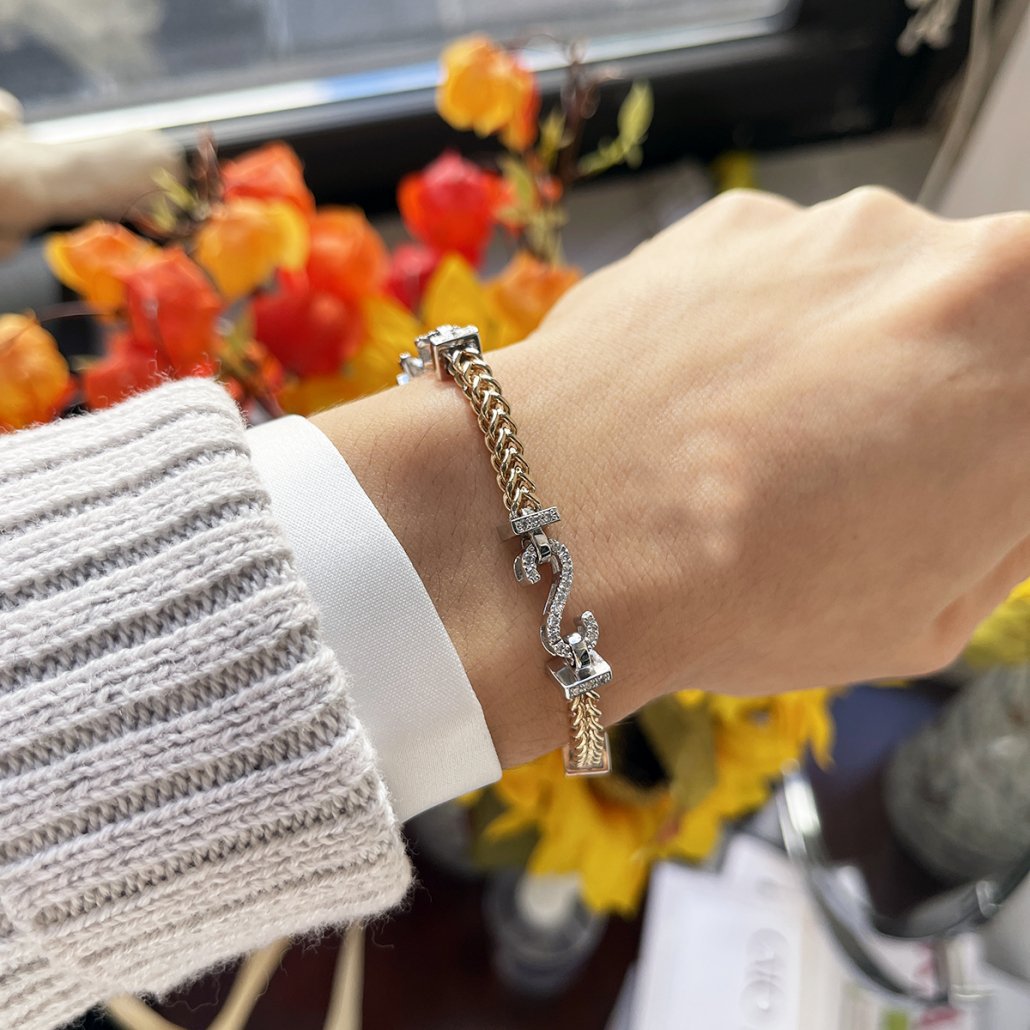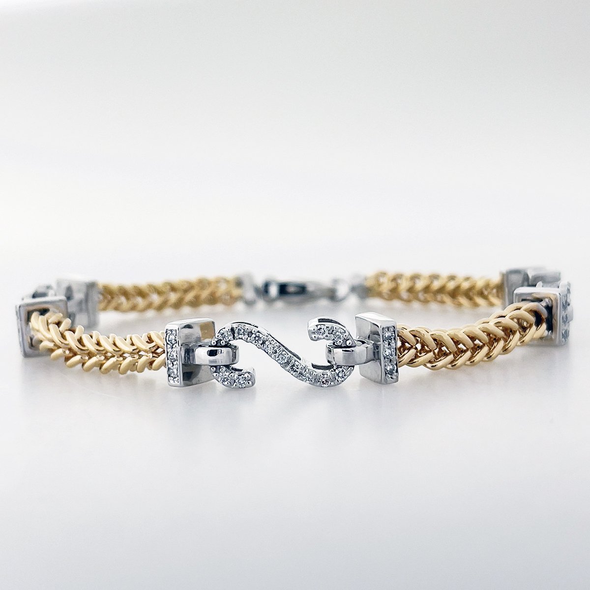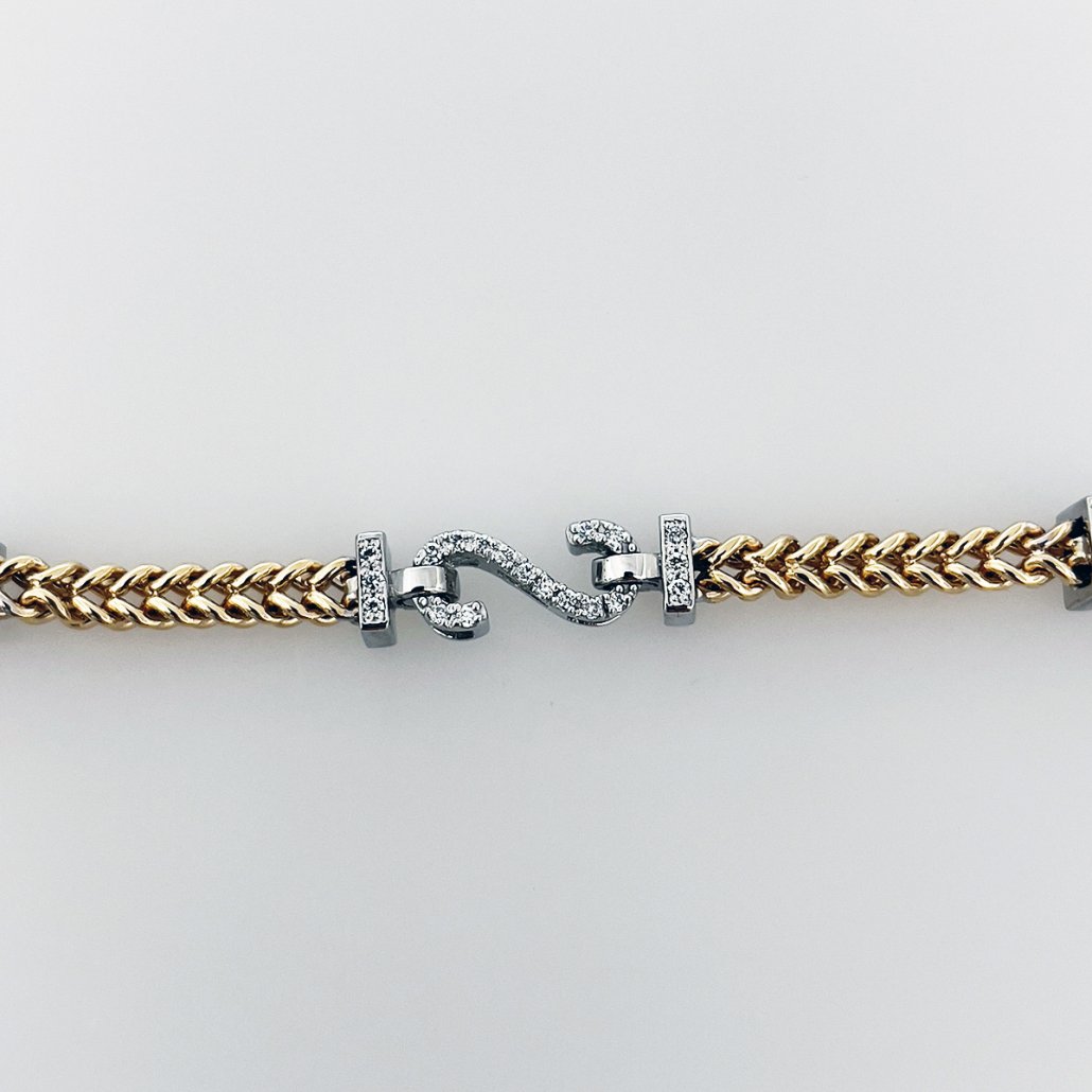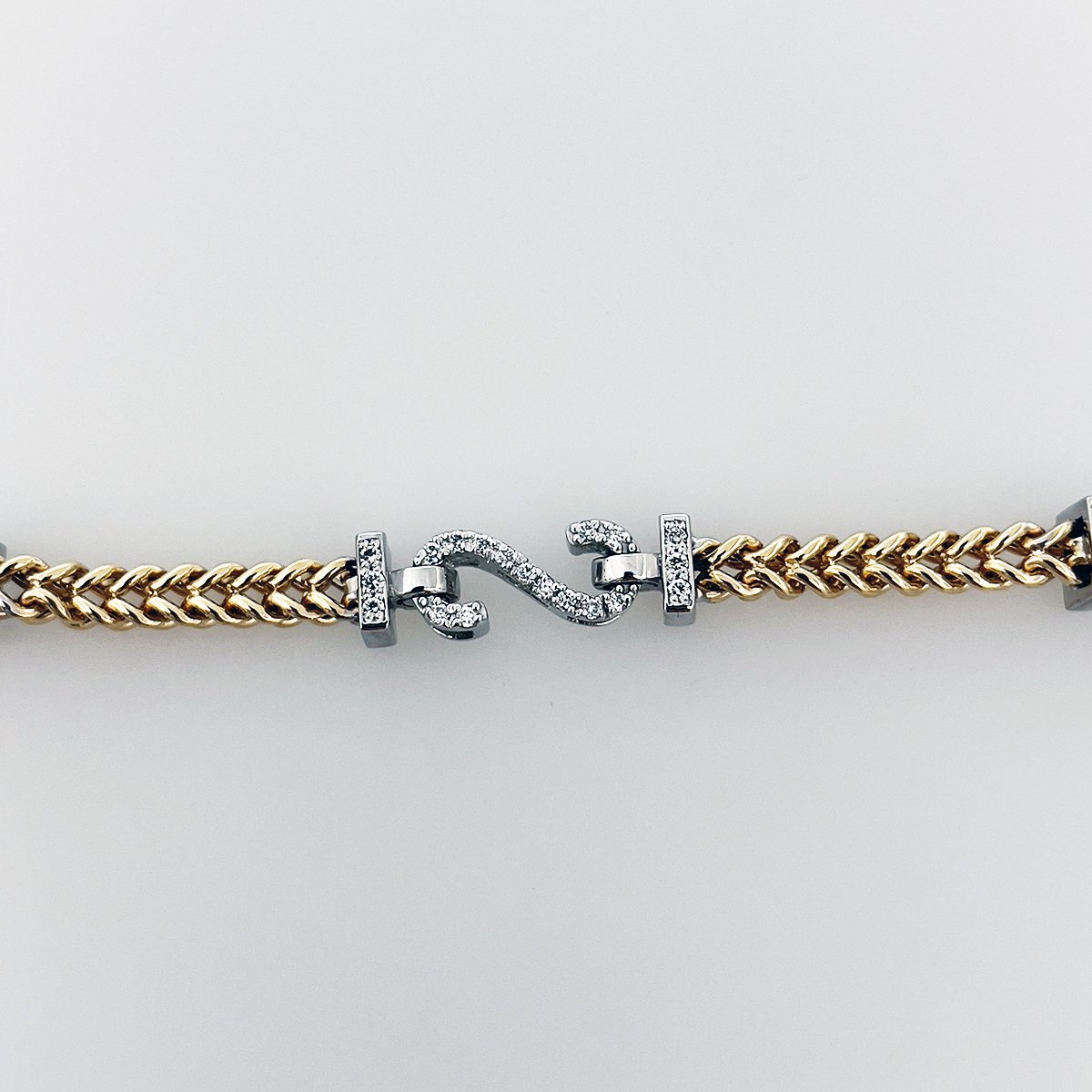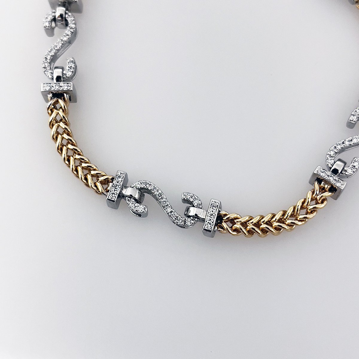 57 Natural Mined Diamonds form S Links, joining the warm yellow gold links.  White gold is used for the clasp and to join the diamond S shape to the yellow. This significant bracelet is meaningful, and will bring strength to the woman who wears it.