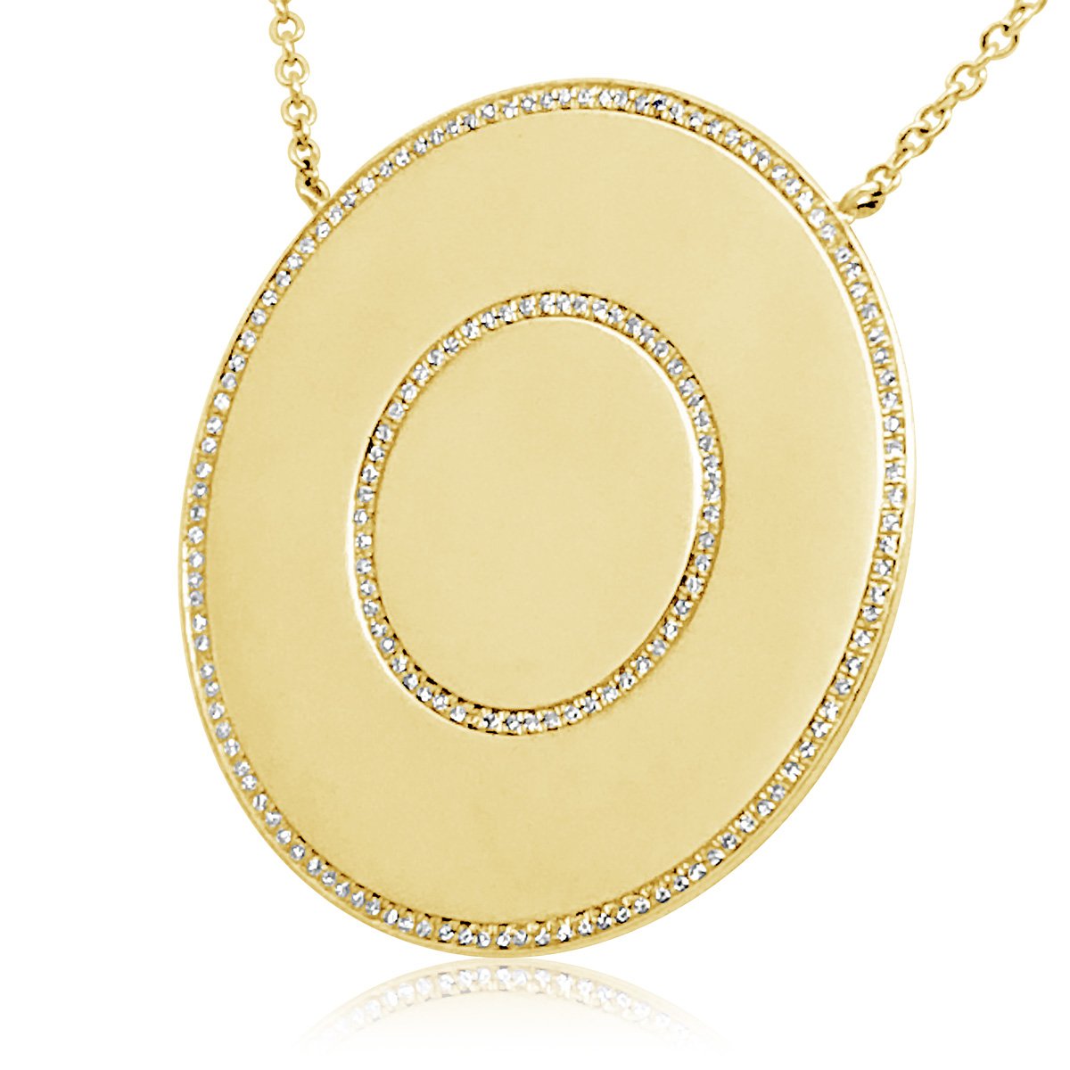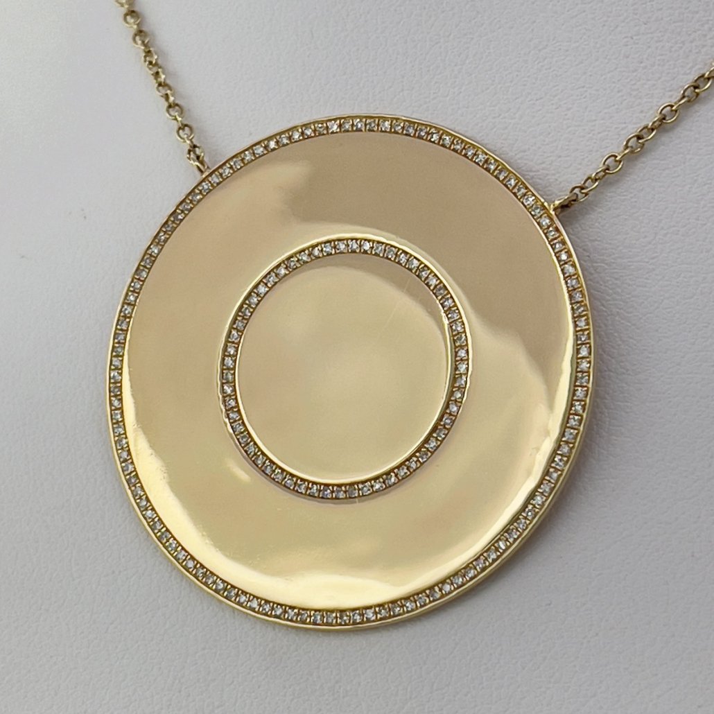 An irresistibly elegant simple design, a disc pendant with two concentric circles of prong set diamonds suspended on an 18″ cable chain of 14k yellow gold.
