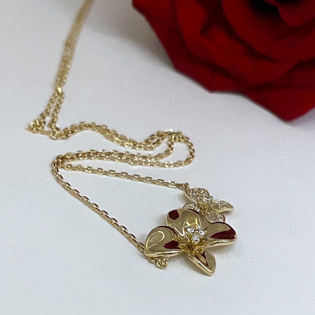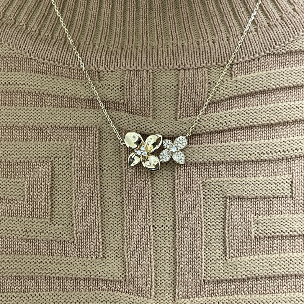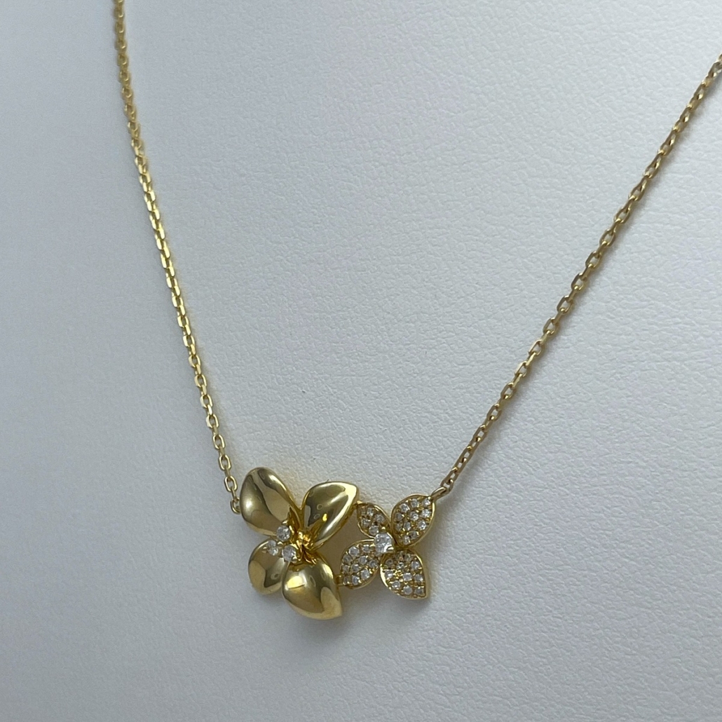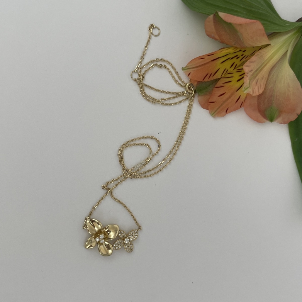 This necklace is made with 14k yellow gold and set with diamonds.
