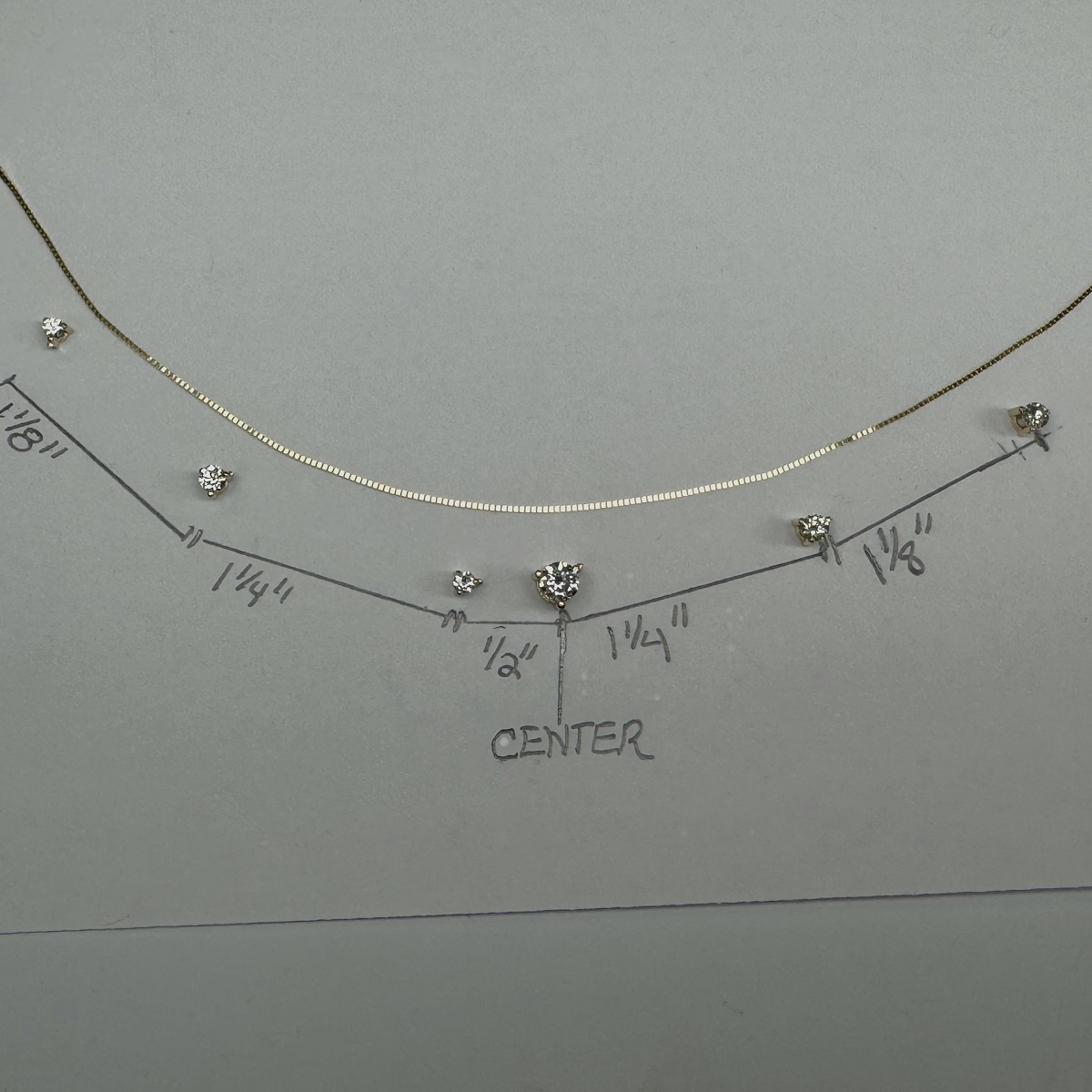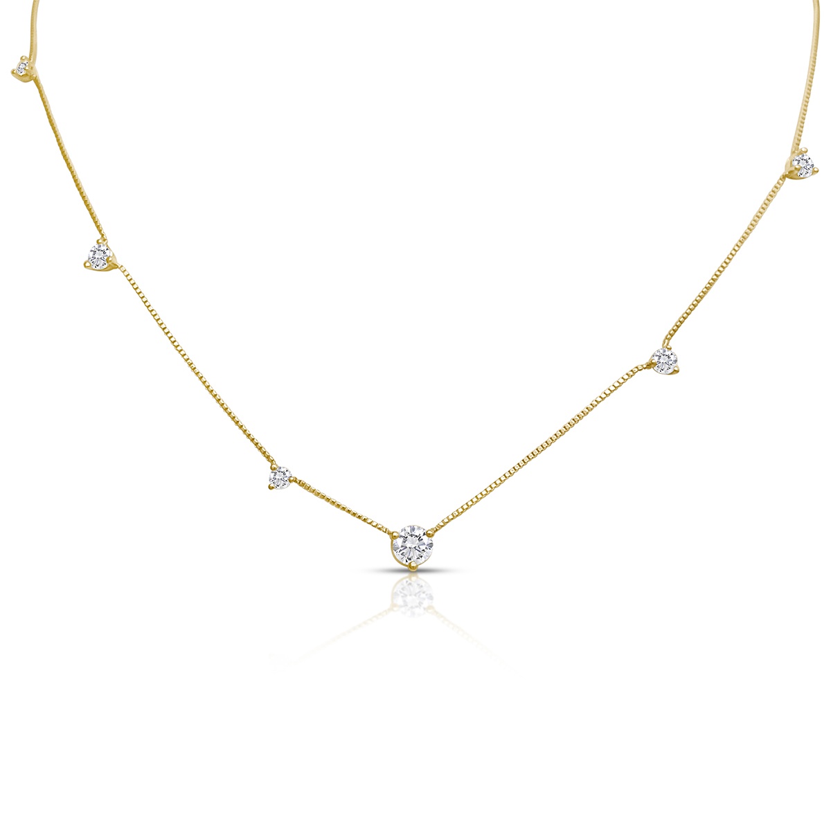 This necklace is made with 14k yellow gold and prong set with natural round brilliant diamonds.