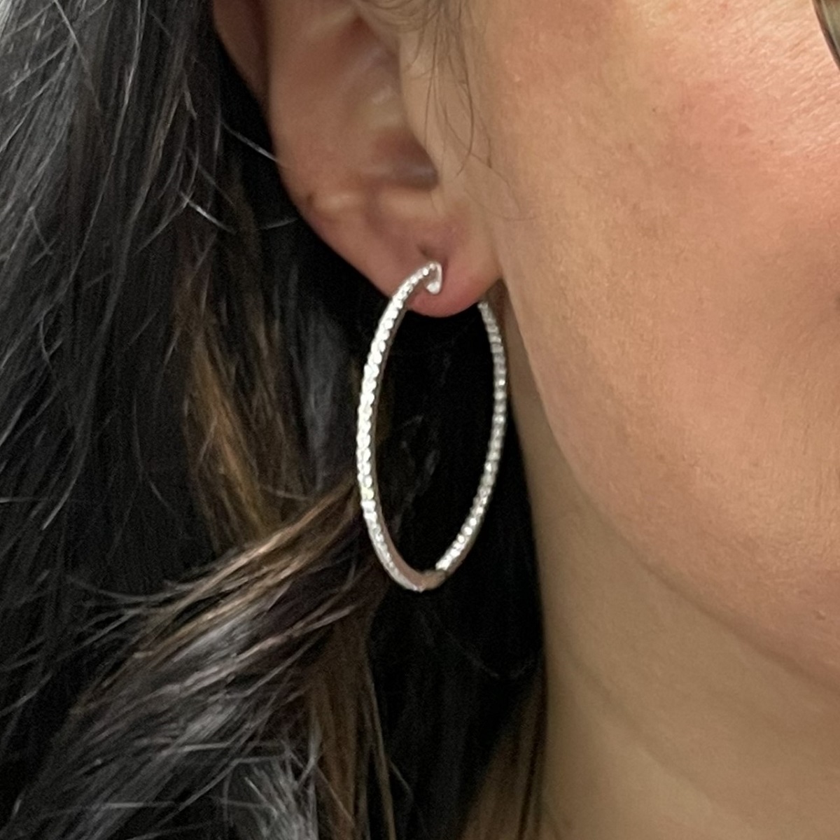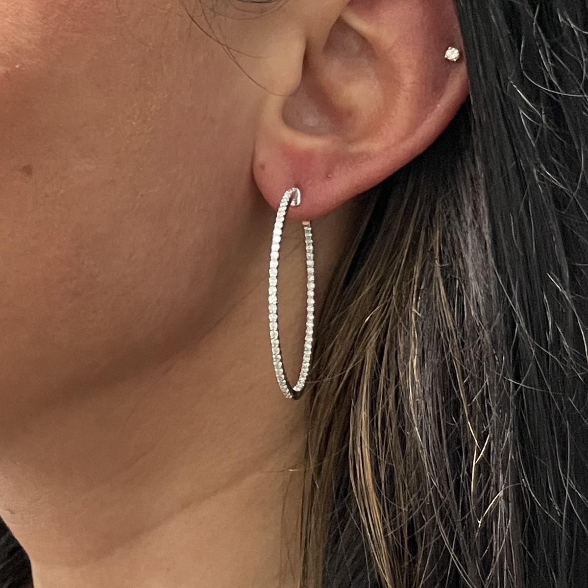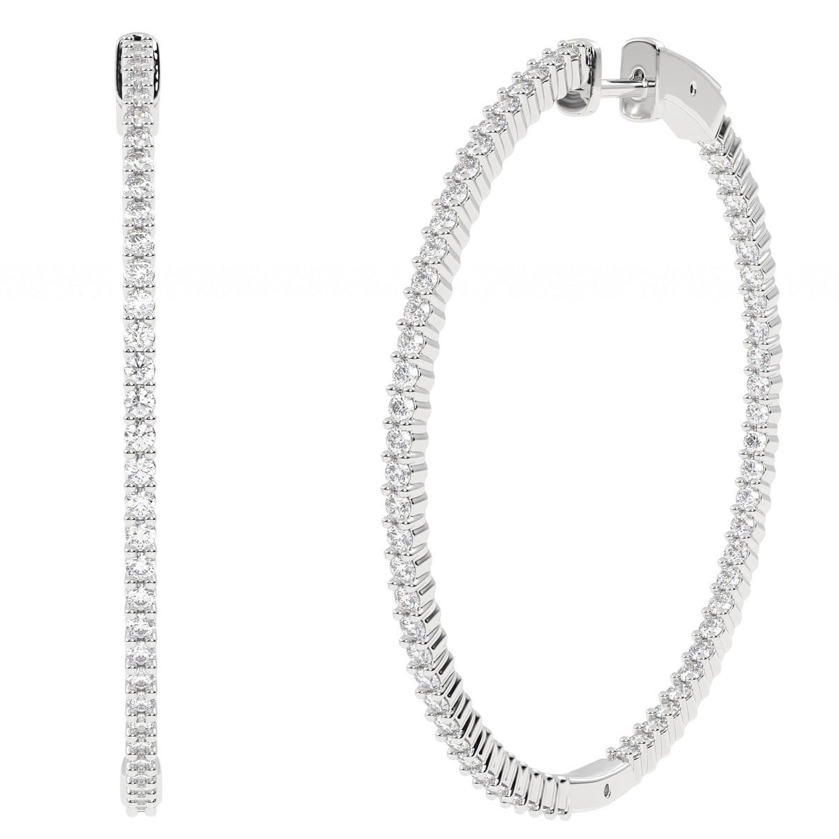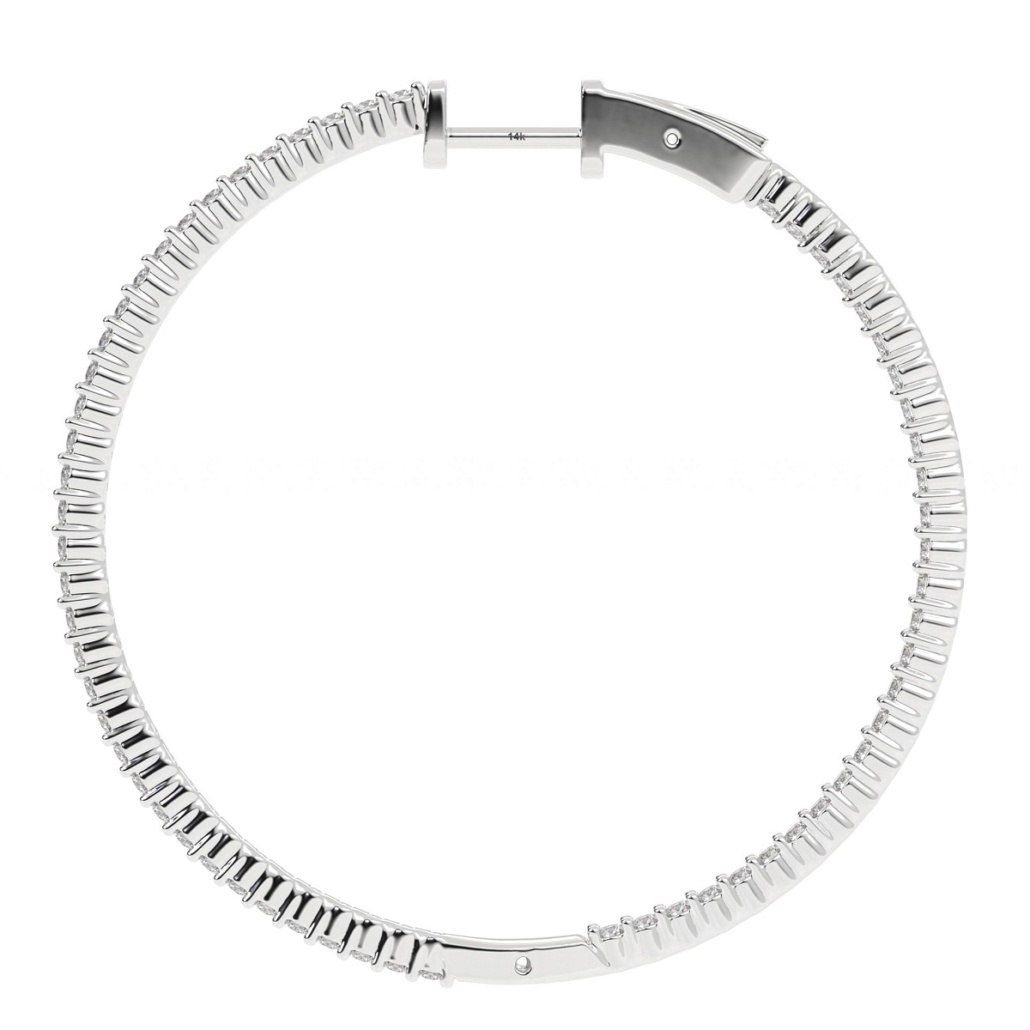 These earrings are made with 14k white gold. The diamonds are four set both on the outside and inside to be facing forward.