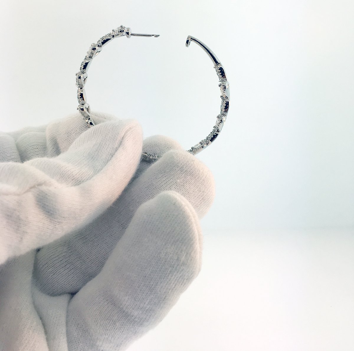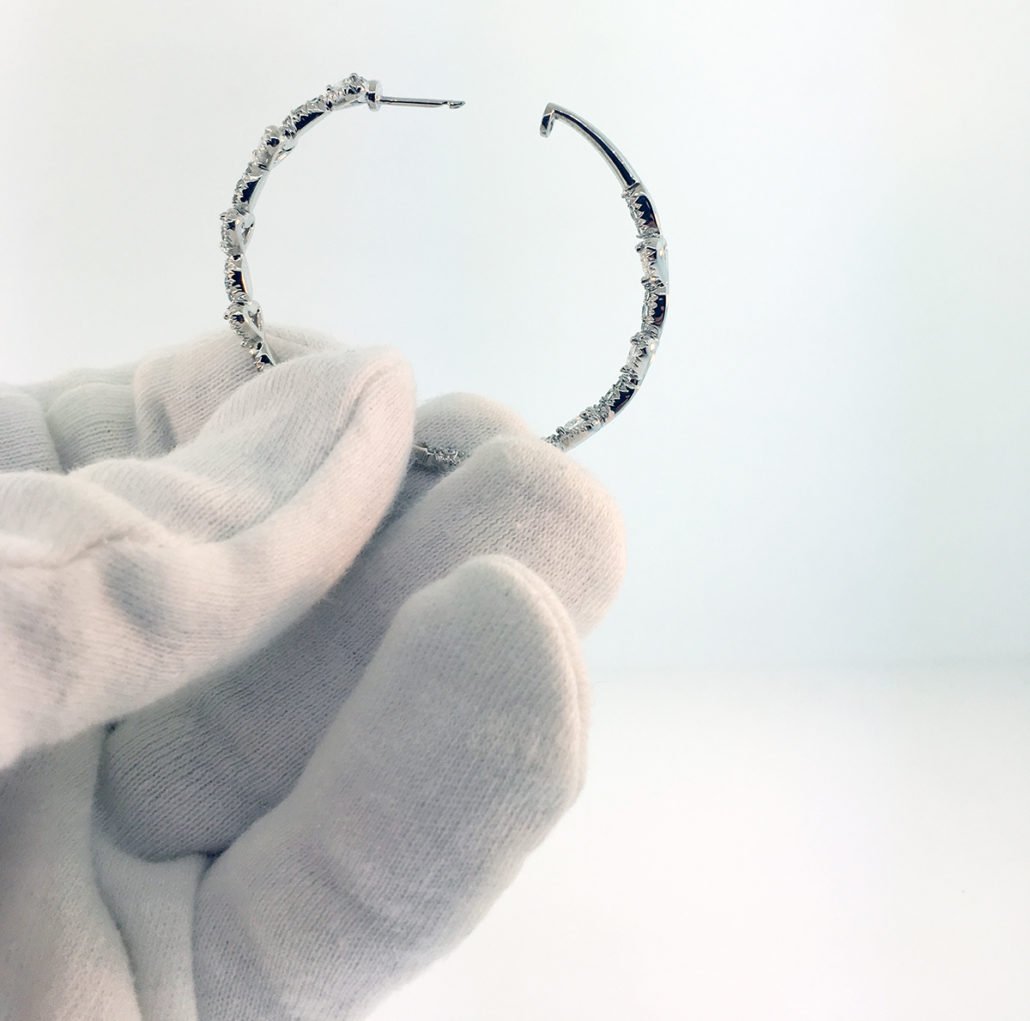 These 14k white gold circular hoops with custom heart shape design. Set With natural diamonds