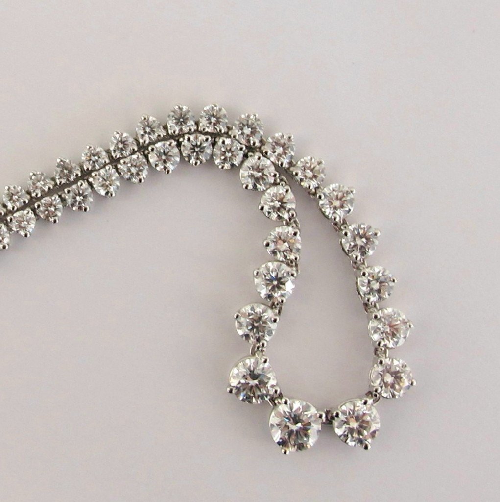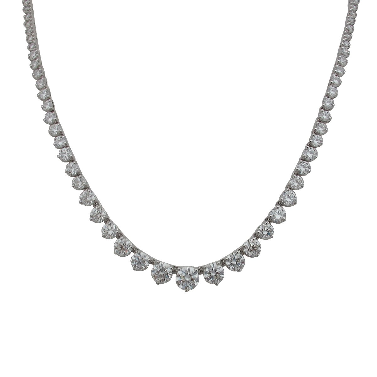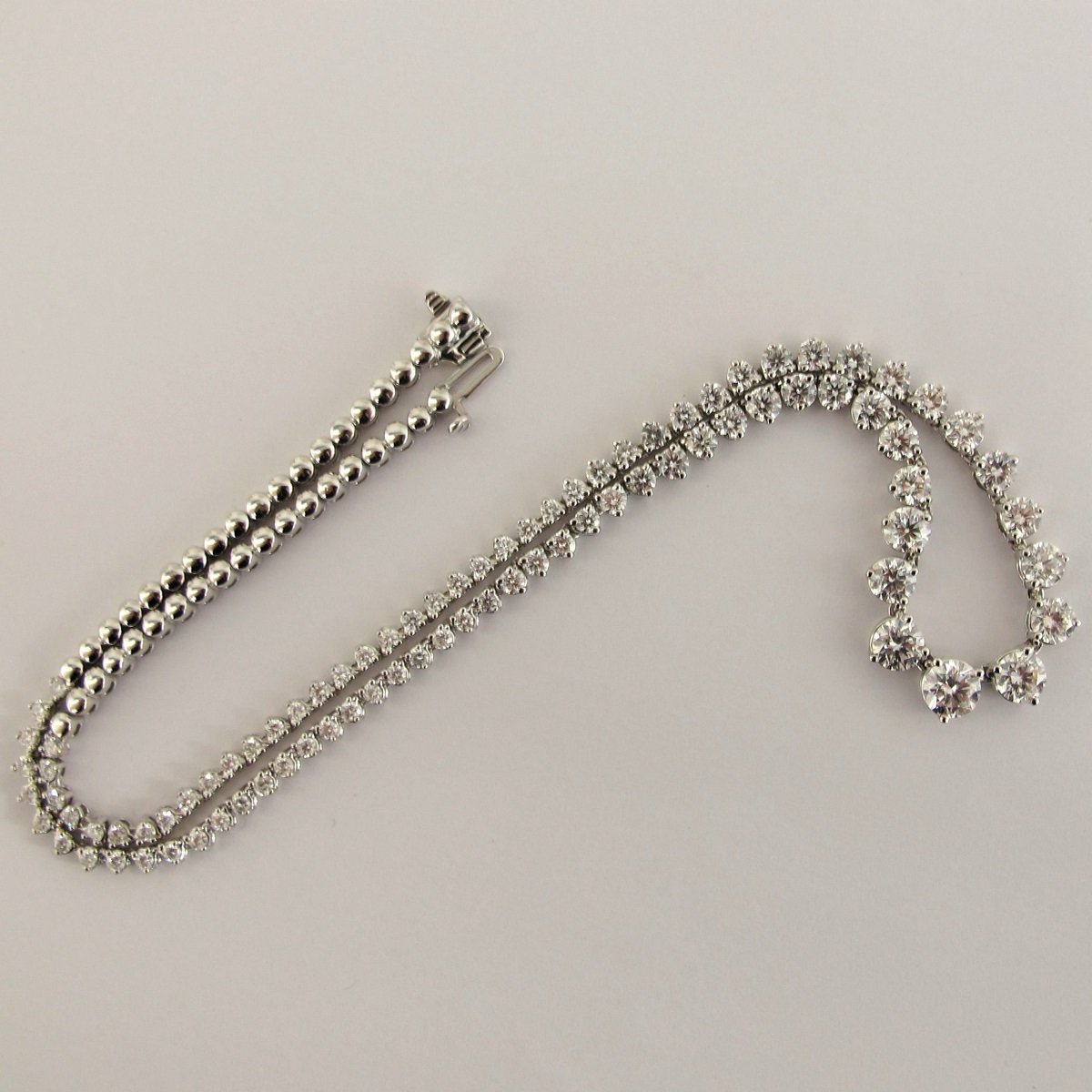 The necklace is plumb 18k white gold and weighs 22 grams. There are seventy five natural round brilliant diamonds that total 9.08carats. They graduate from 0.71carats as the largest to .035 as the smallest. Â The diamonds are GIA graded color FG and clarity VS2-SI1.