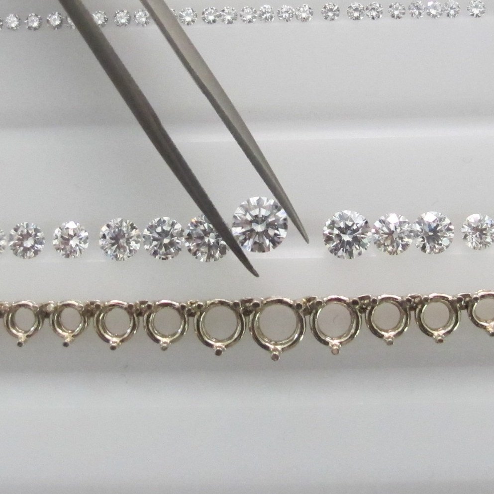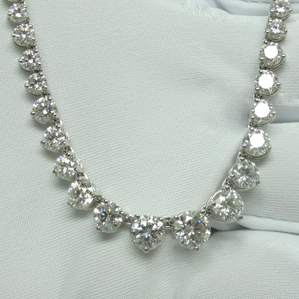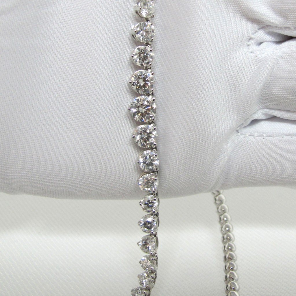 The necklace is plumb 18k white gold and weighs 22 grams. There are seventy five natural round brilliant diamonds that total 9.08carats. They graduate from 0.71carats as the largest to .035 as the smallest. Â The diamonds are GIA graded color FG and clarity VS2-SI1.