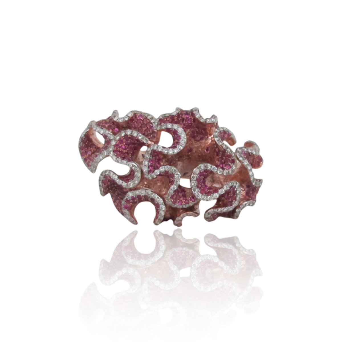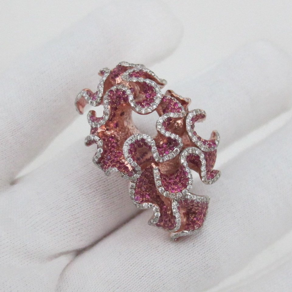 18k pink gold ruby and diamond coral reef party ring. The ring is an original and handmade piece.