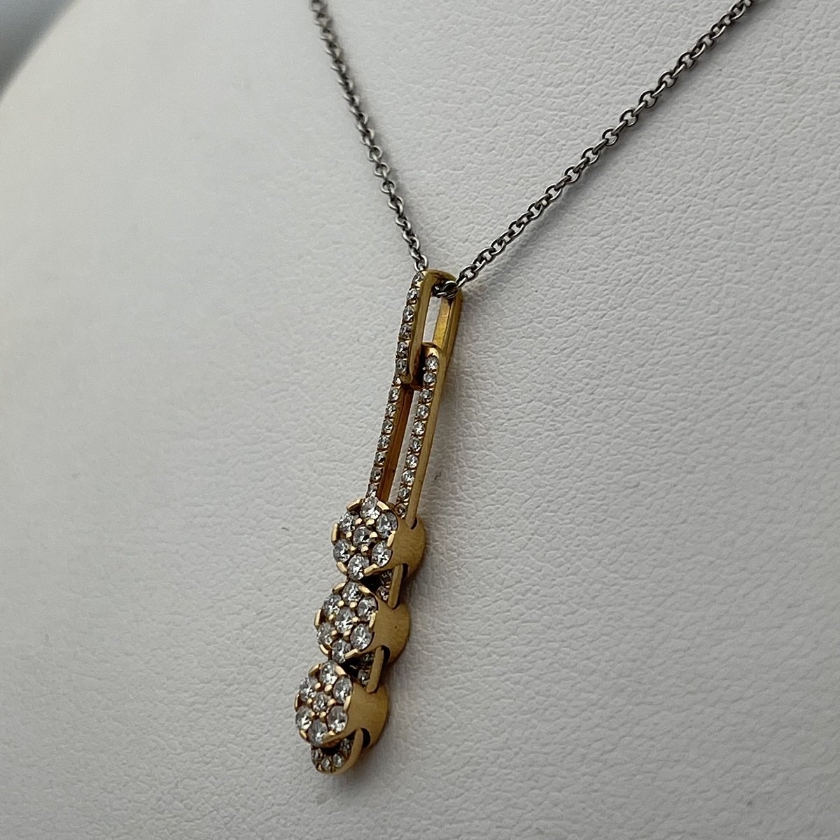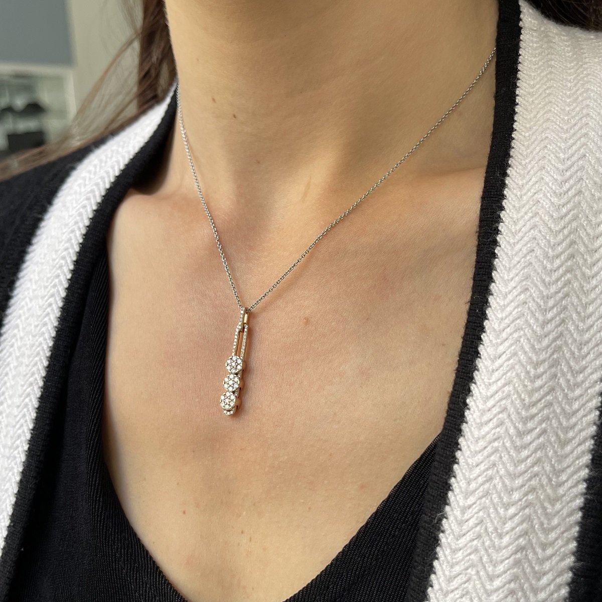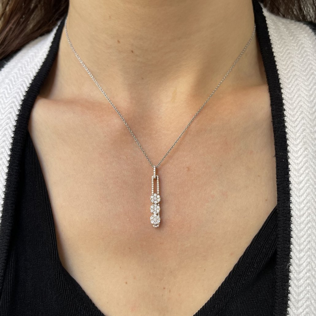 Three delicate diamond rosettes slide freely in an elongated oval diamond edged pendant, with a diamond encrusted bail.