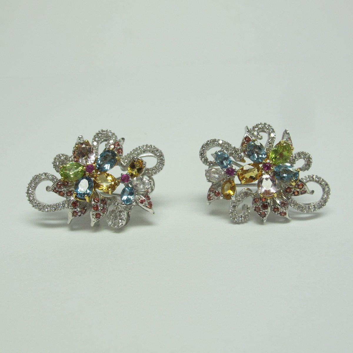 This floral earrings are made with 18k white gold and set with sapphires, garnets, topazes and diamonds. The stones are set in shared prongs.