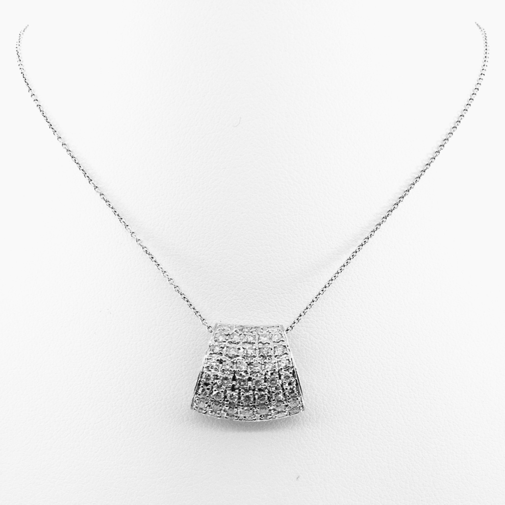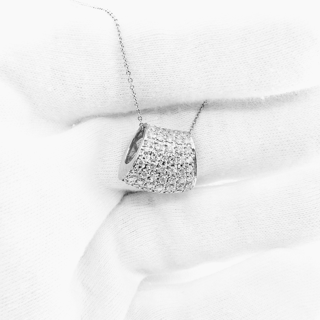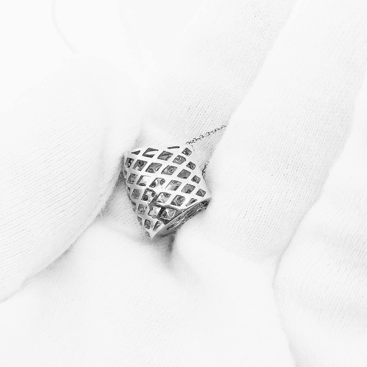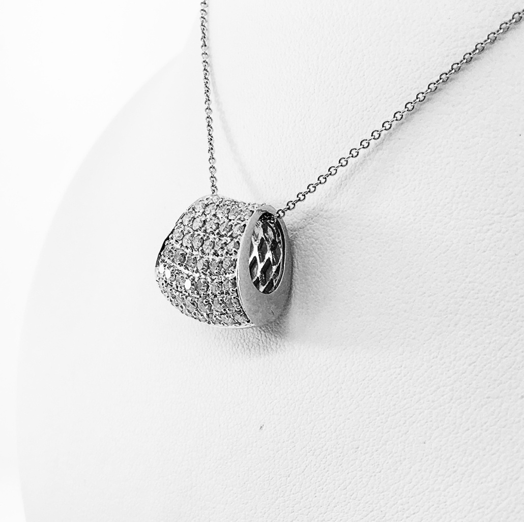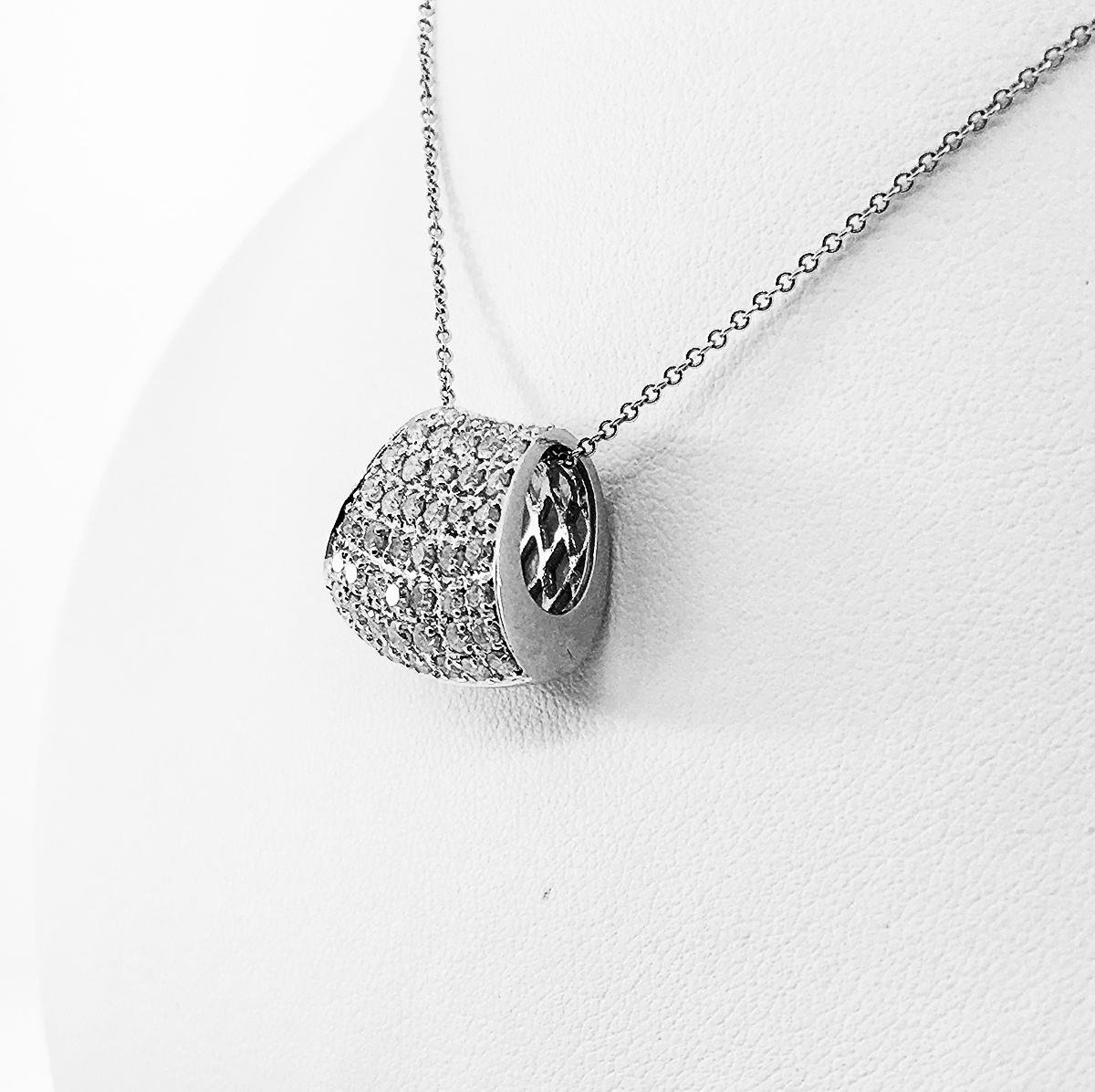 This 18k white gold pendant is an abstract open design shaped like a purse – wider at the bottom than the top. The front of the pendant is completely diamond encrusted, and the back features a lattice-work design in white gold. The pendant slides freely on a chain.