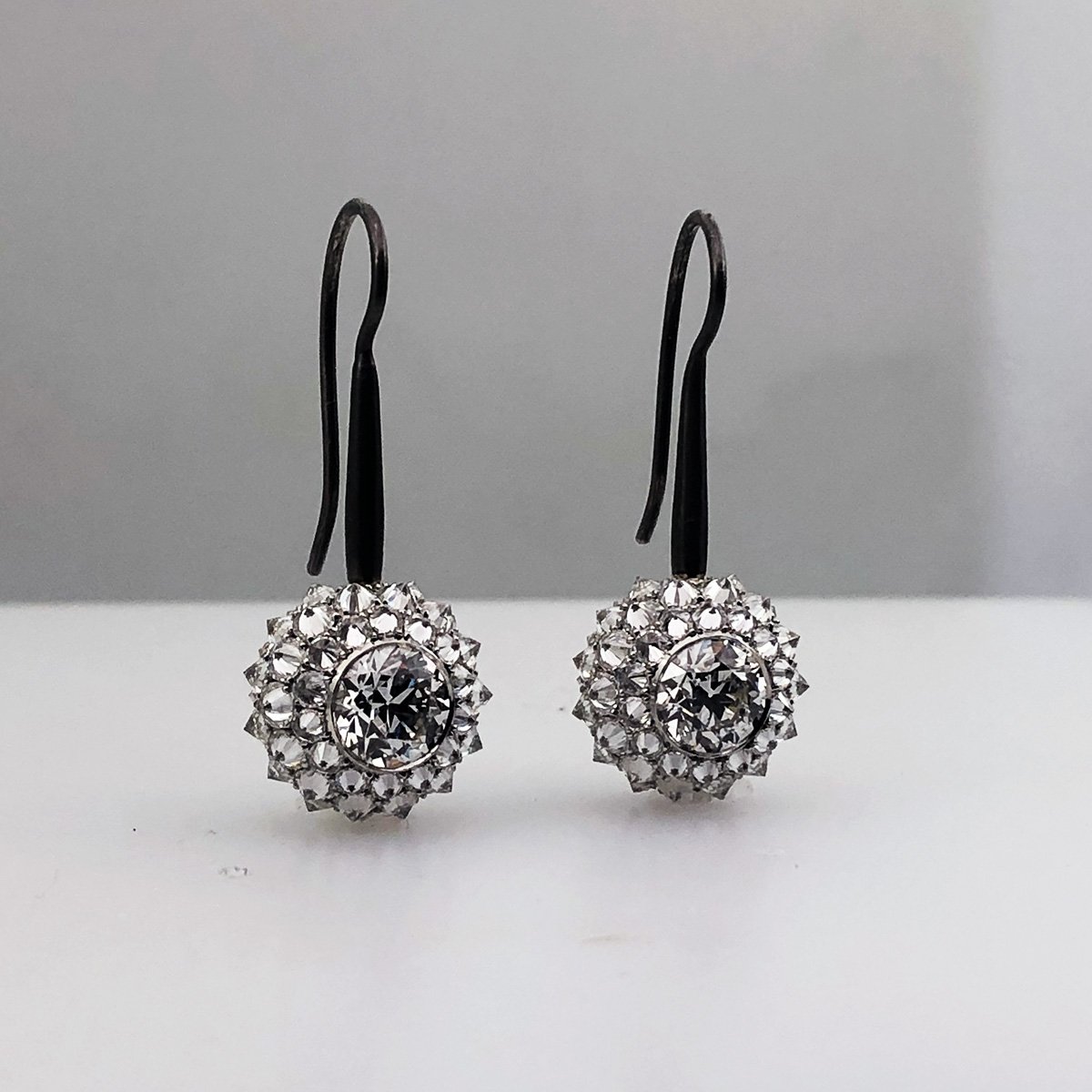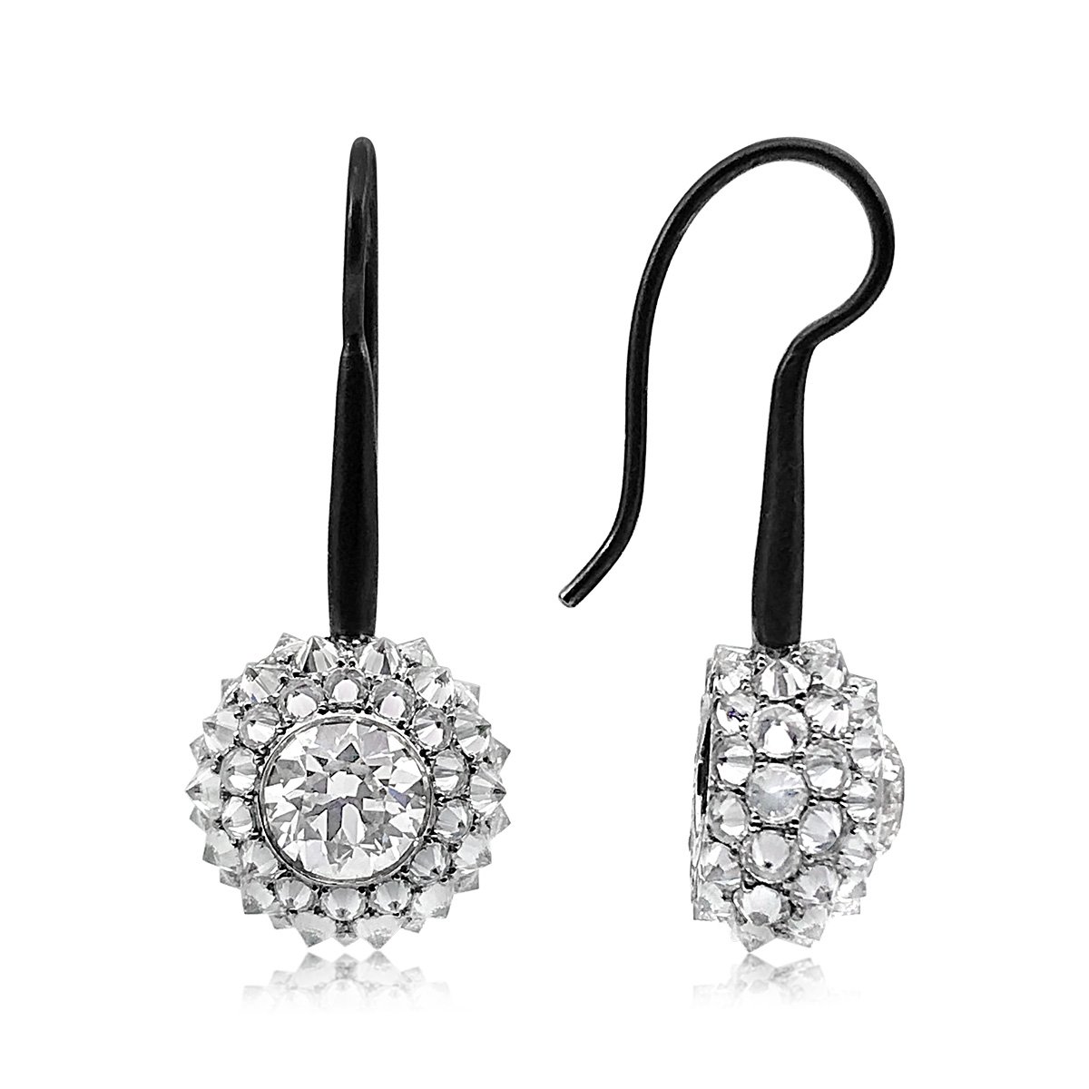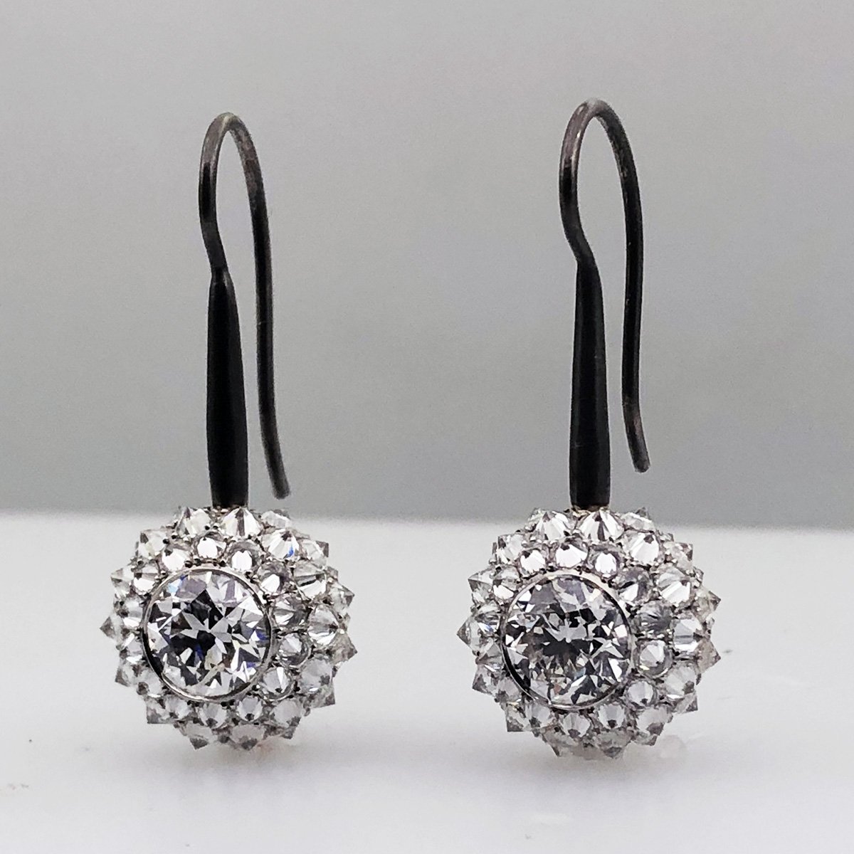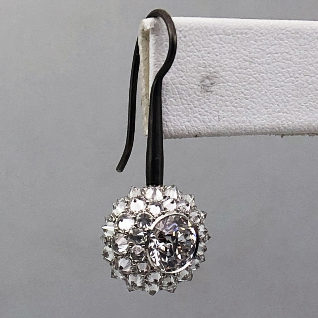 One Of A Kind Diamond Drops, with Bezel Set Centerstones Surrounded By Culet Up Round Diamonds.