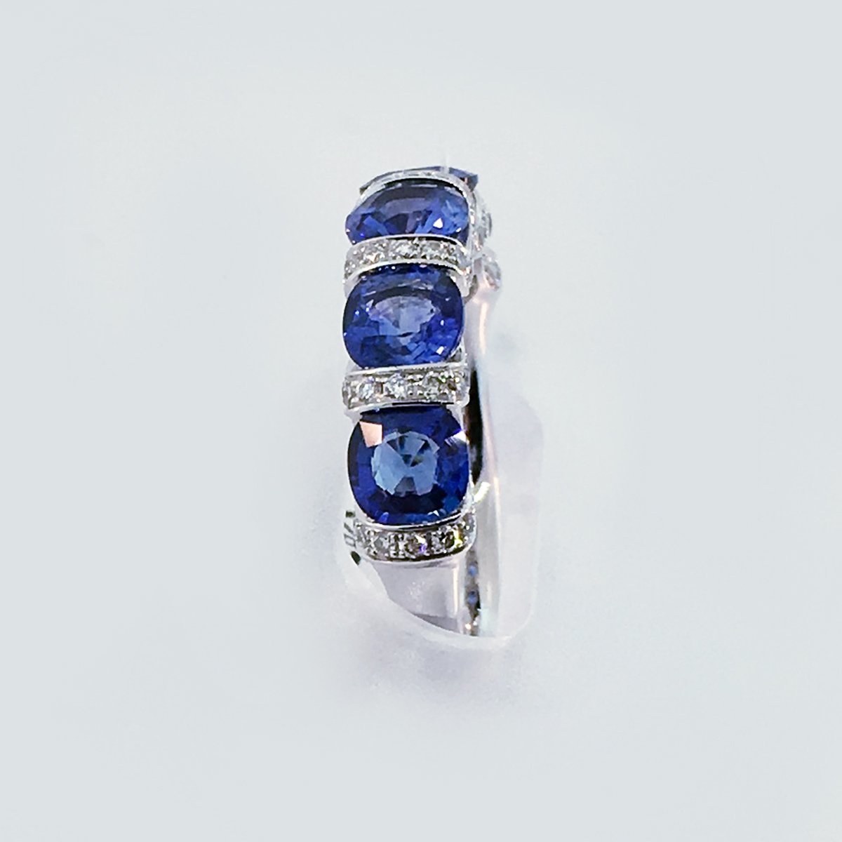 18k White gold and five blue Sapphires set side by side in diamond encrusted channels.
