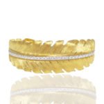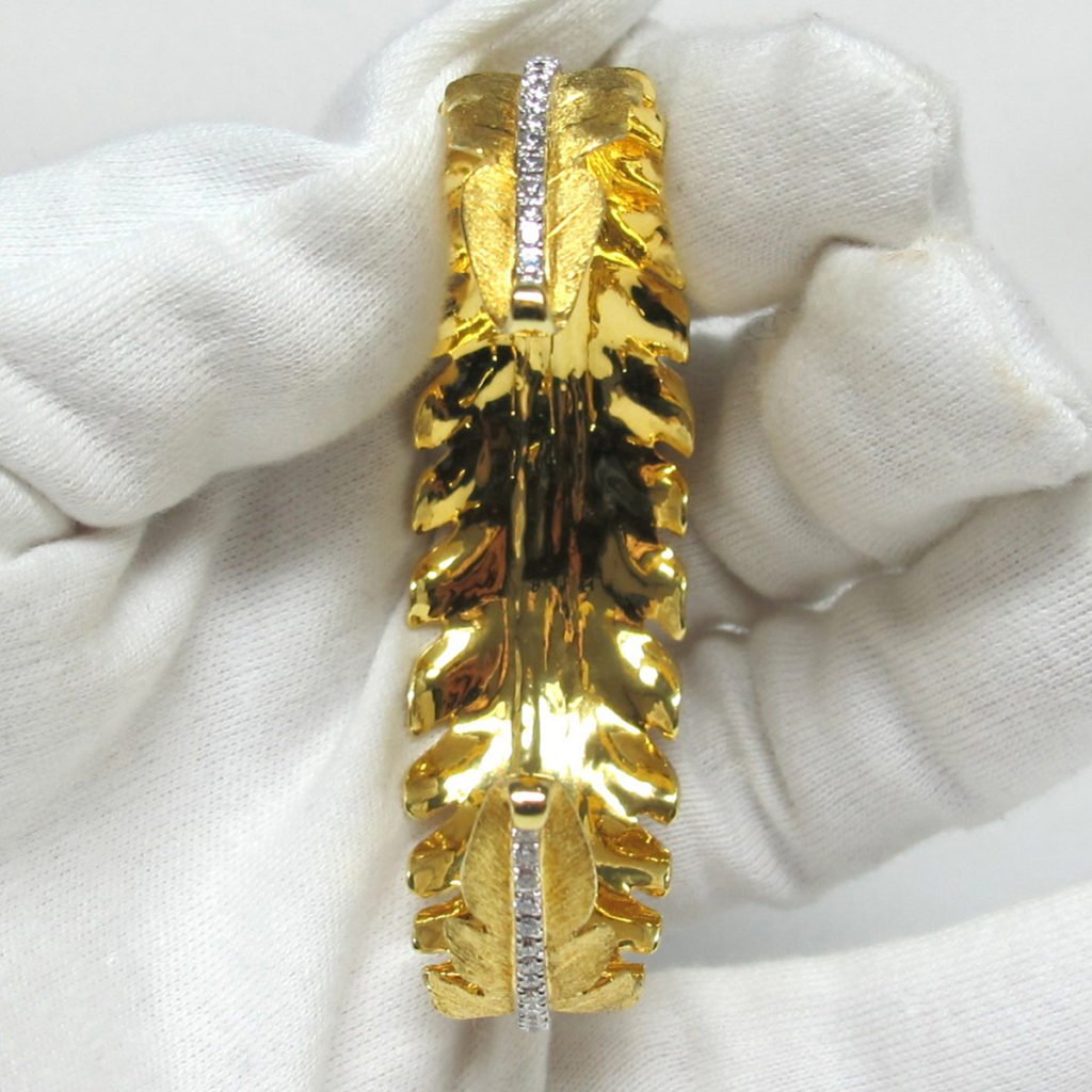 This 18 K Yellow Gold bangle bracelet features a retro leaf design with a center diamond band accent.