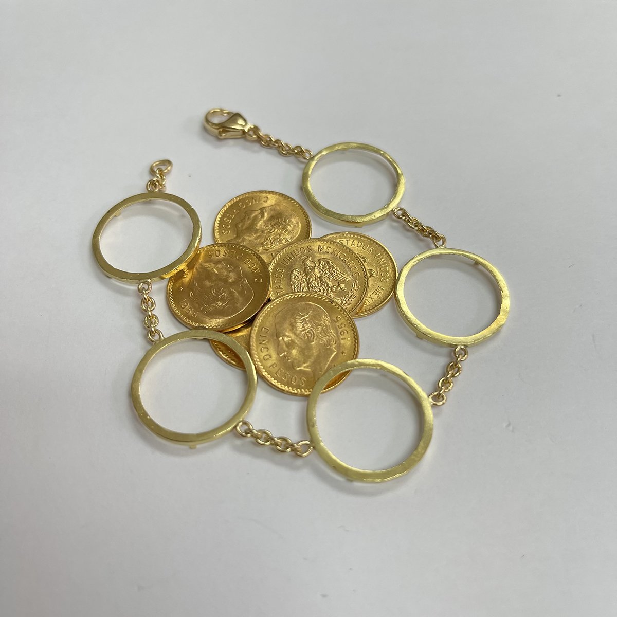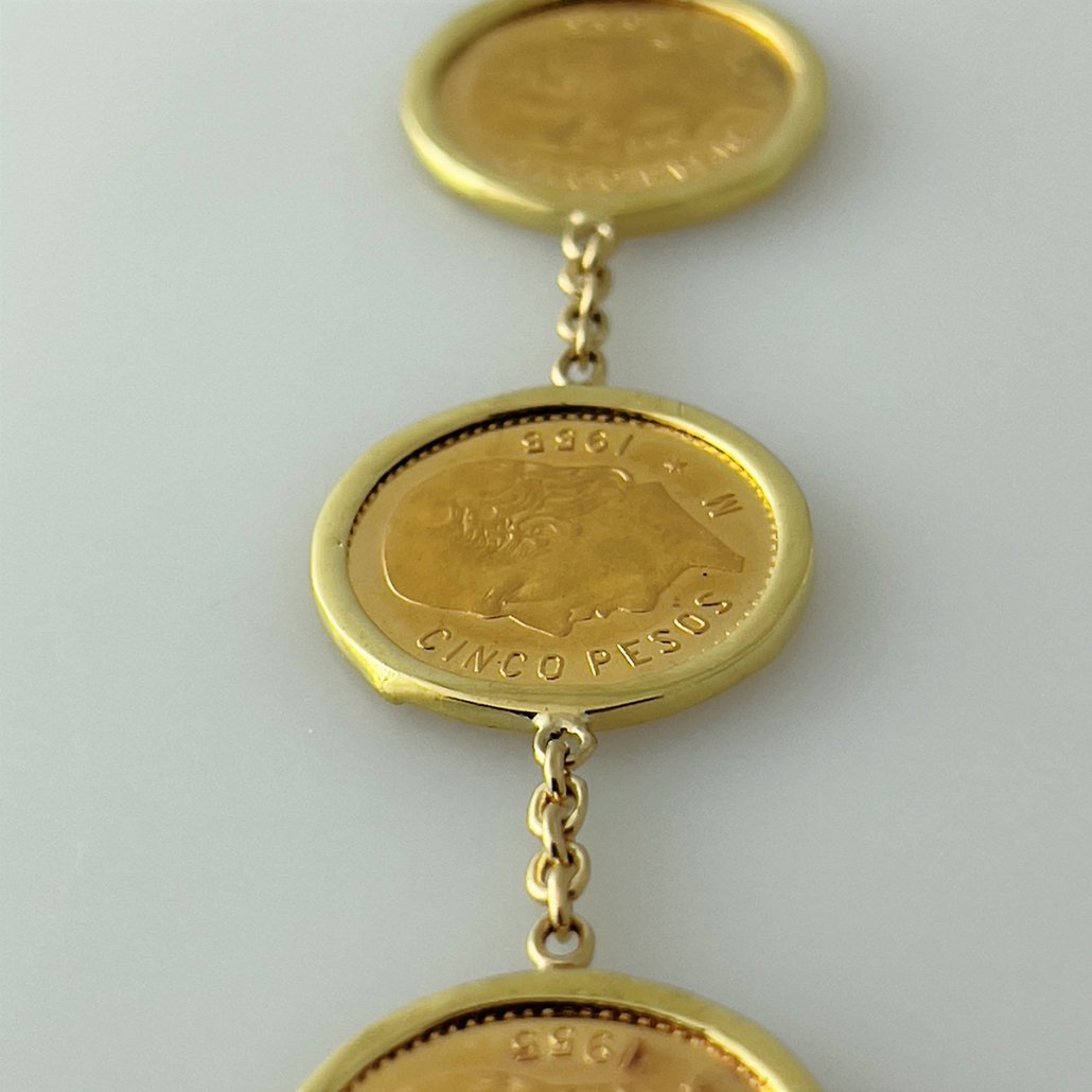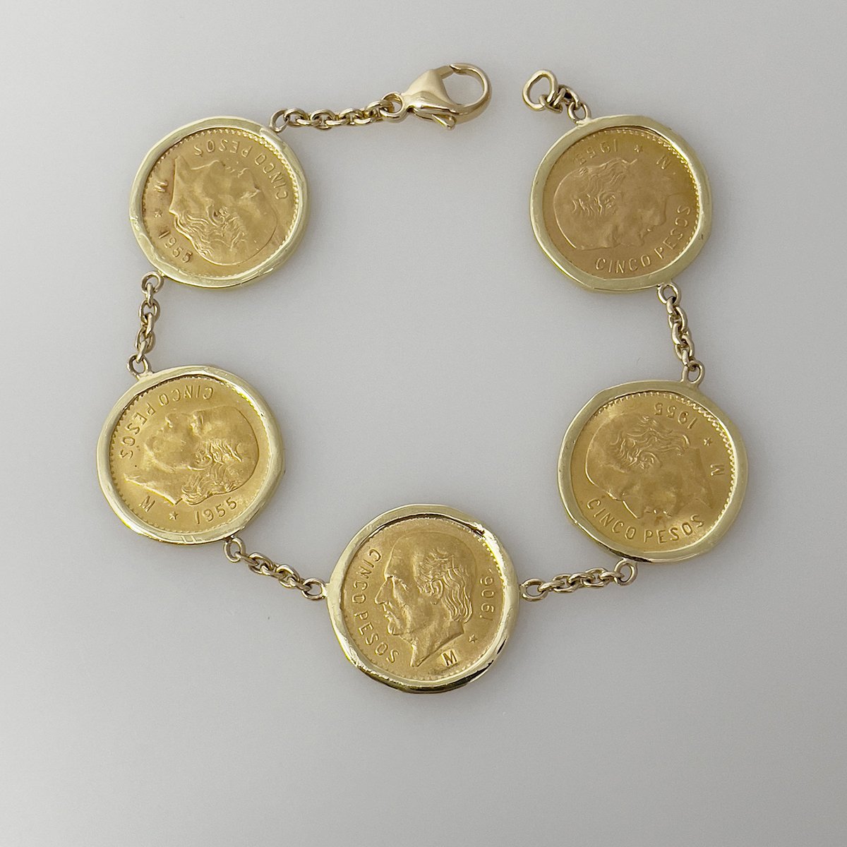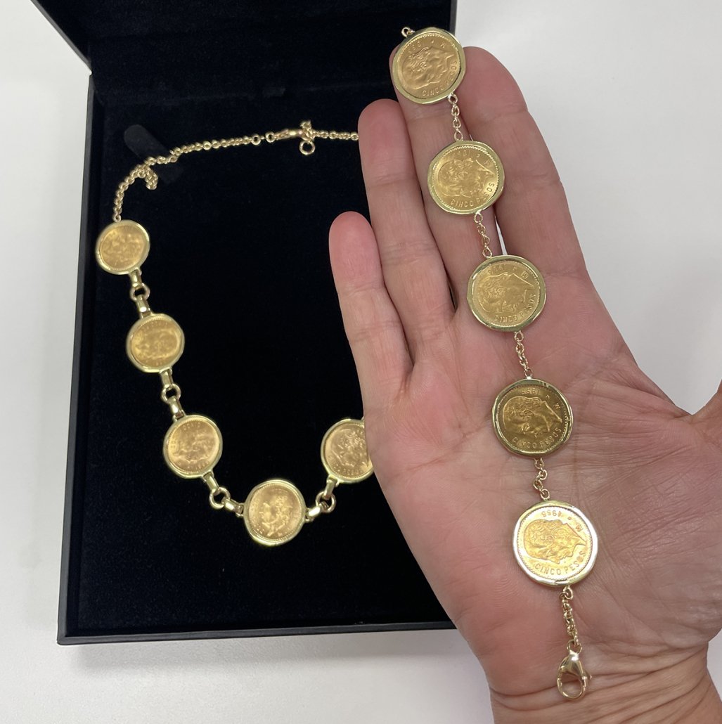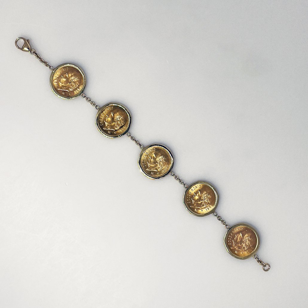 The bracelet is custom made and a one-of-a-kind design. It contains five solid gold Mexican Cinco Peso coins in custom, handmade frames.