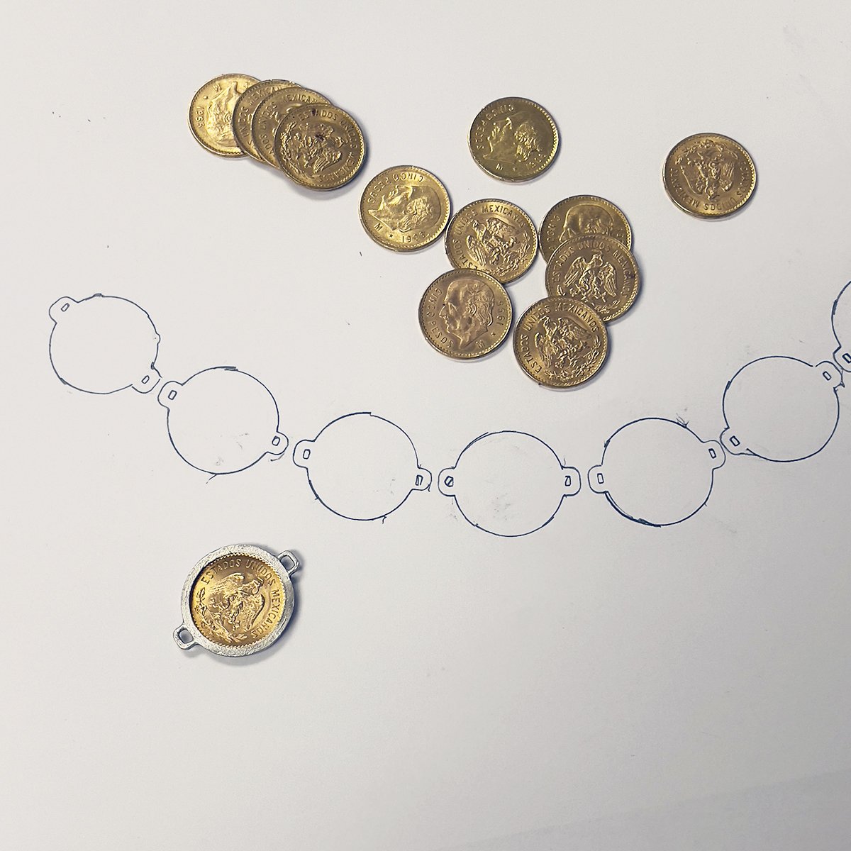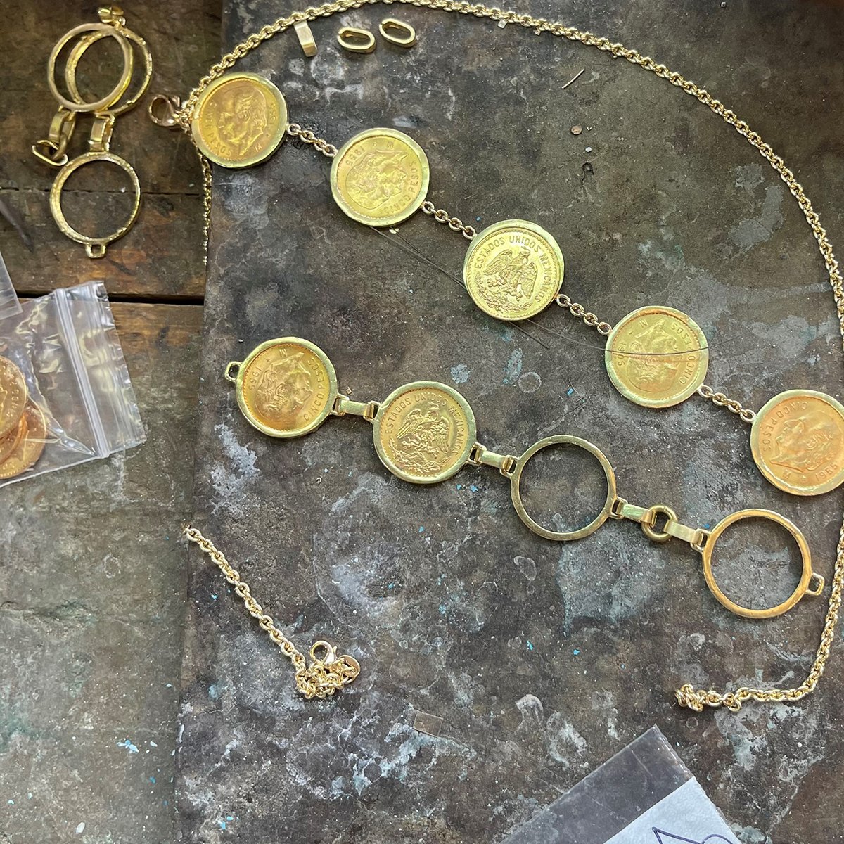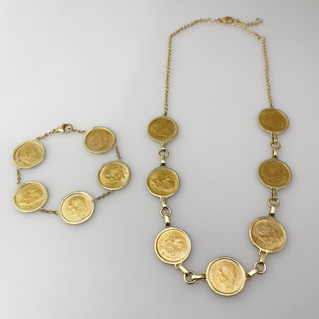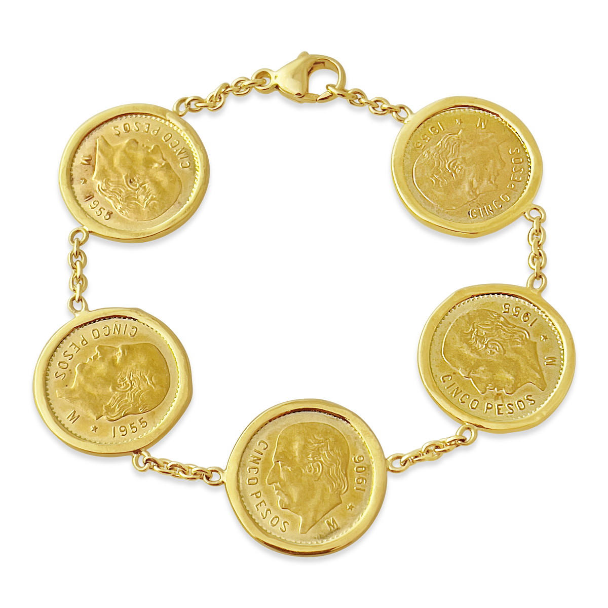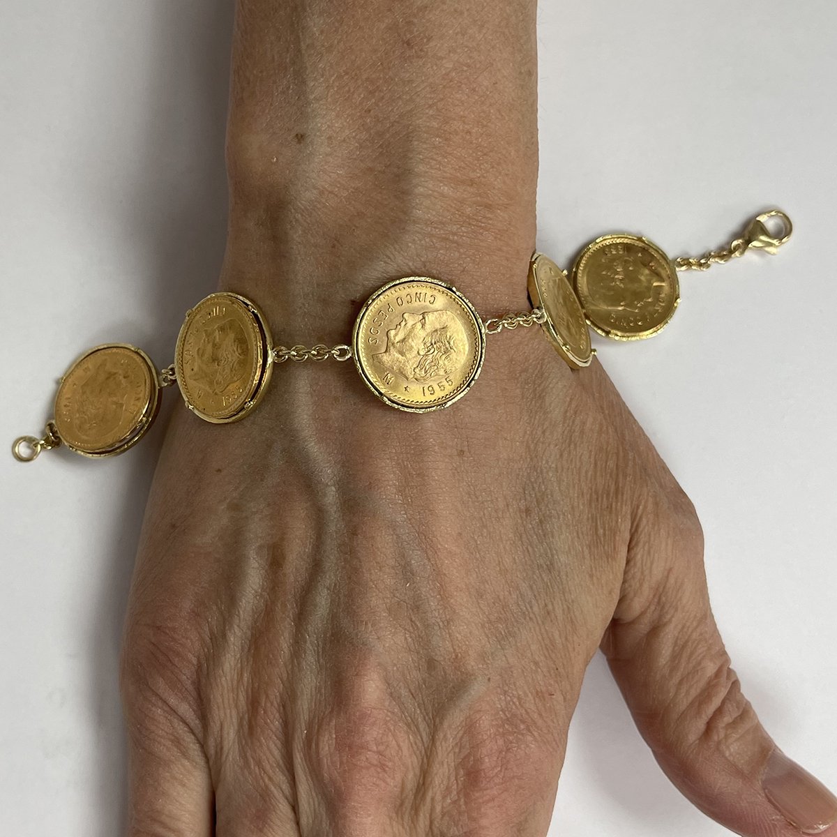 The bracelet is custom made and a one-of-a-kind design. It contains five solid gold Mexican Cinco Peso coins in custom, handmade frames.