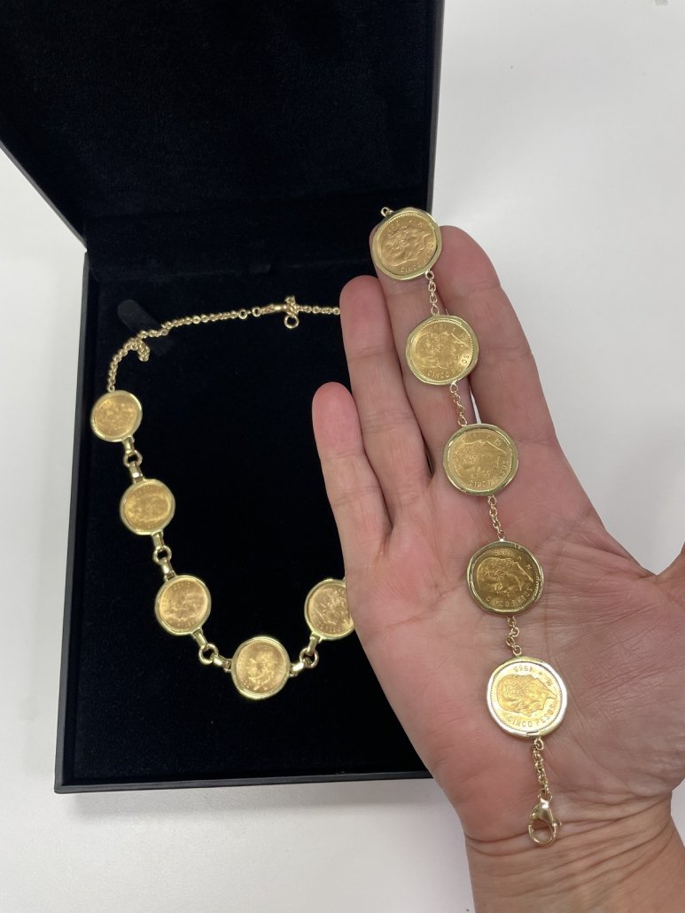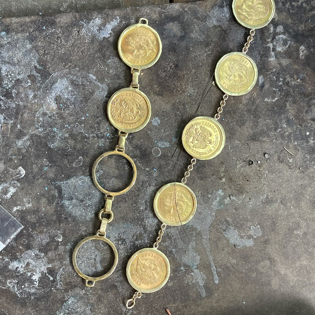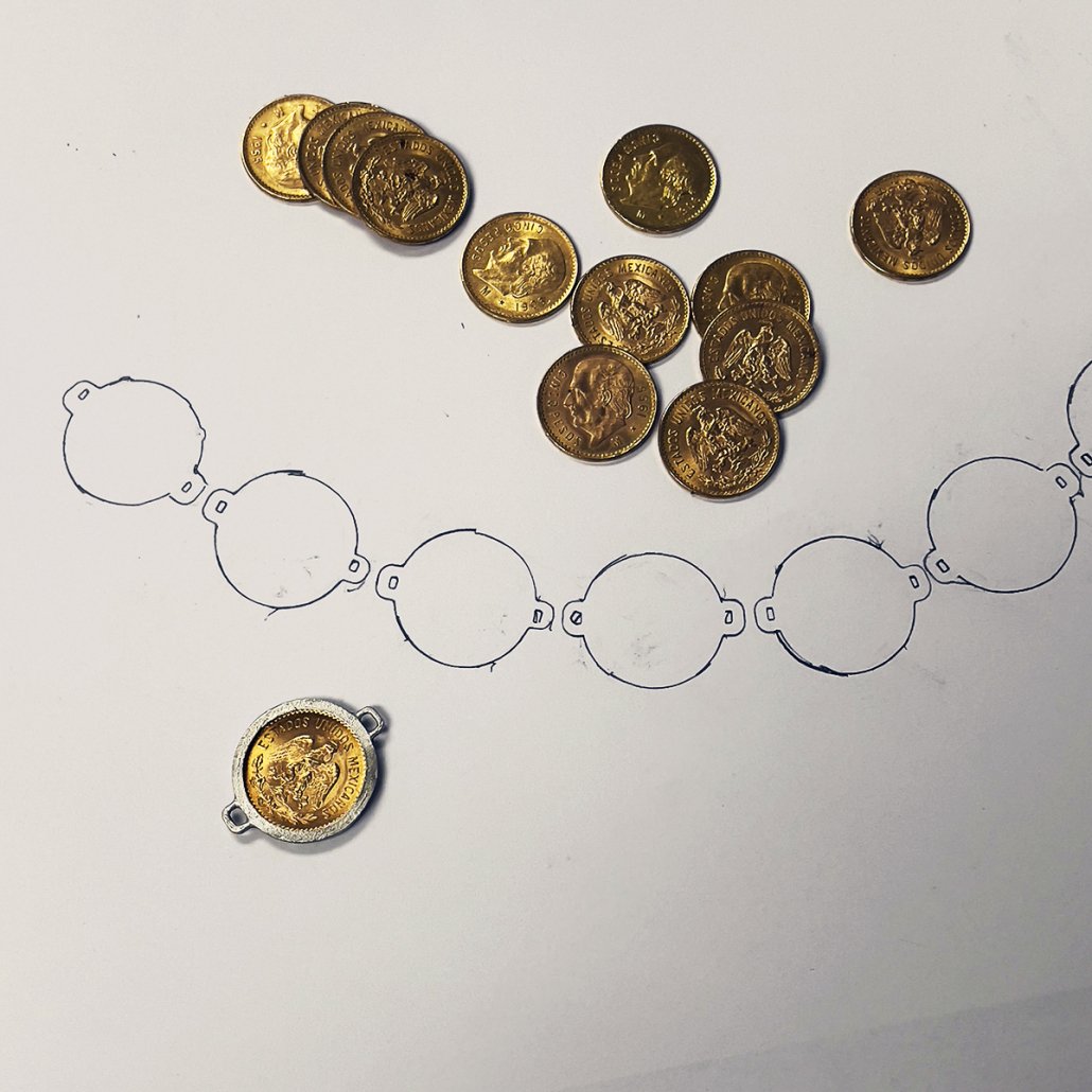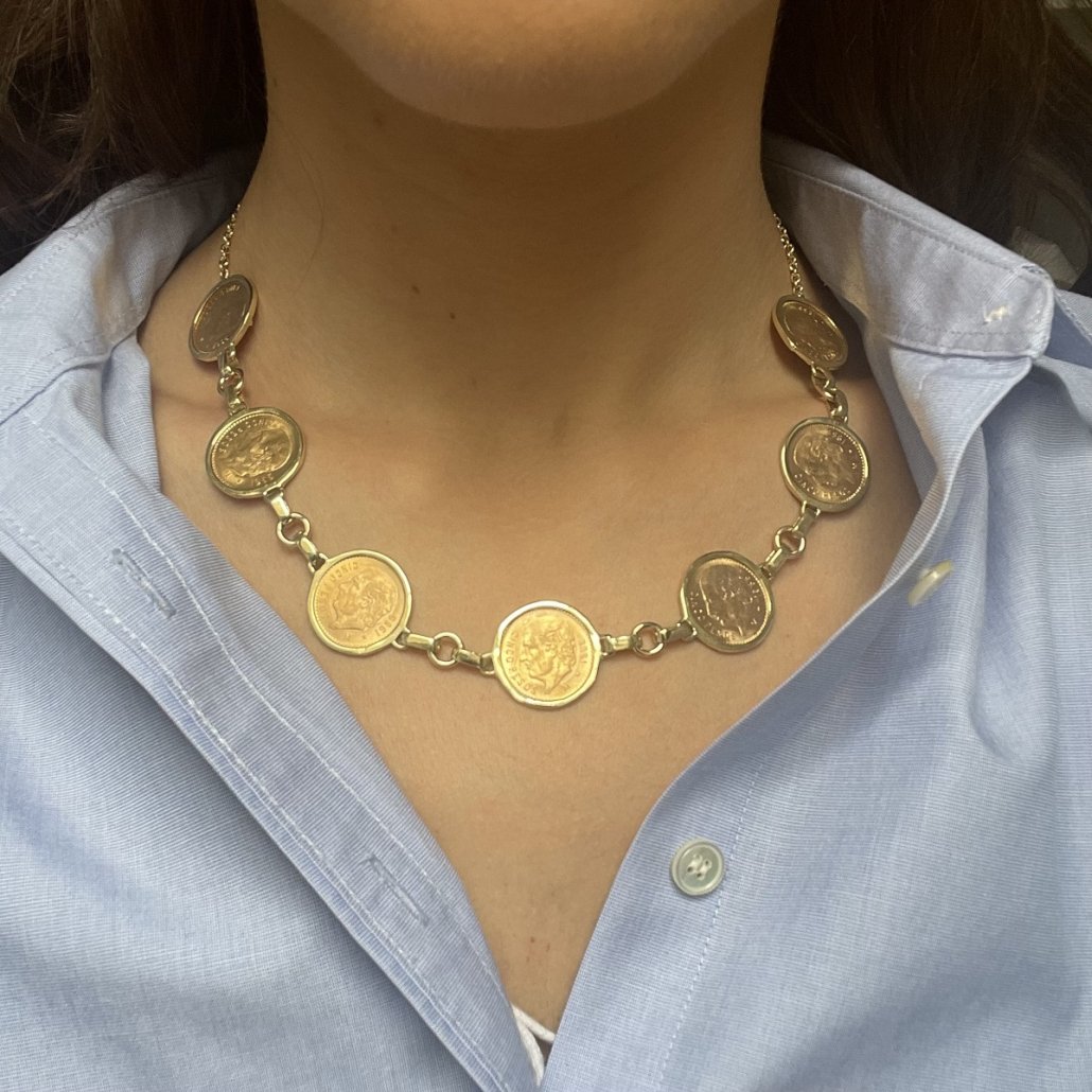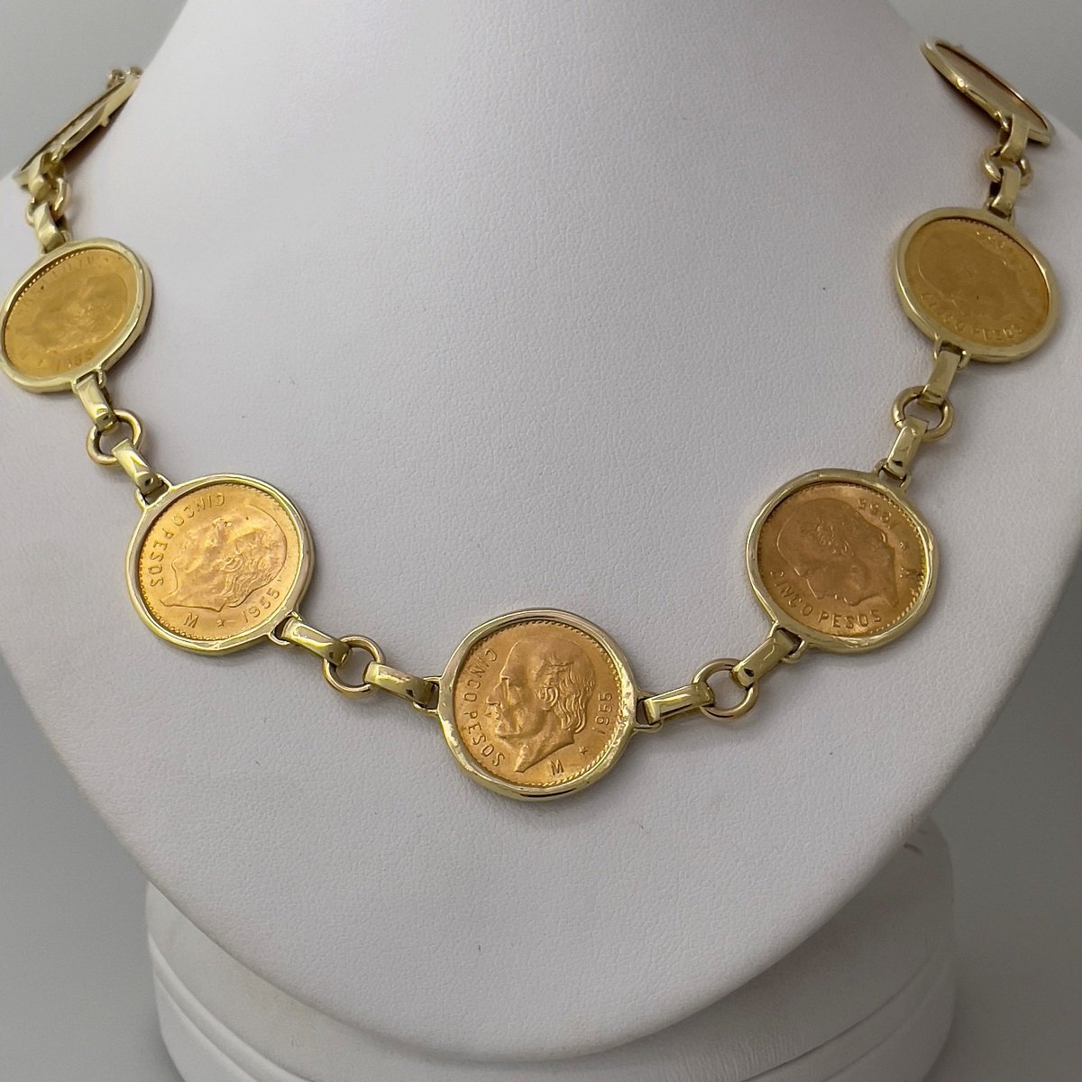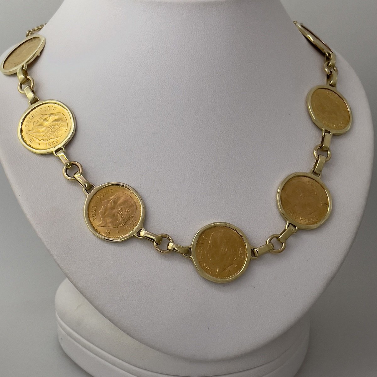The necklace is custom made and a one-of-a-kind design. It contains seven gold Mexican Cinco Peso coins.