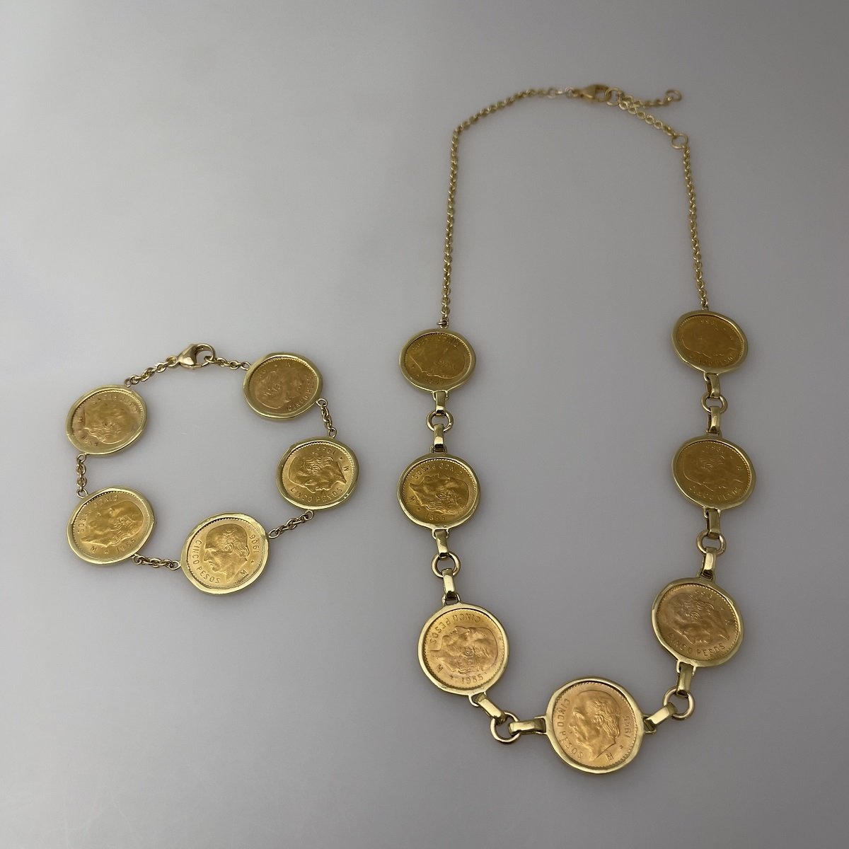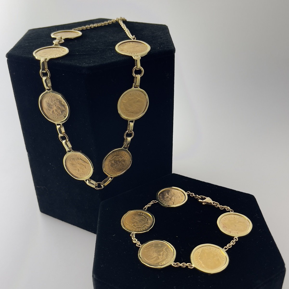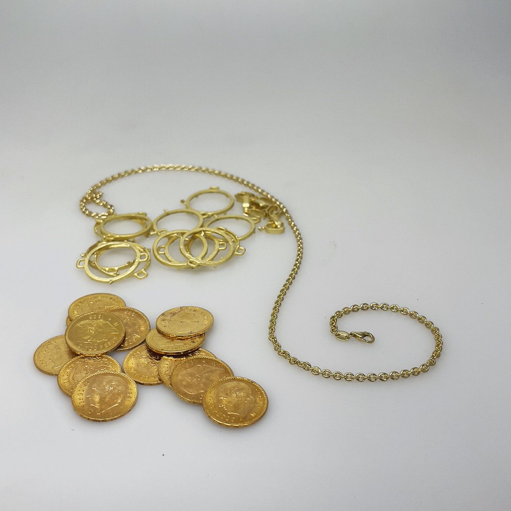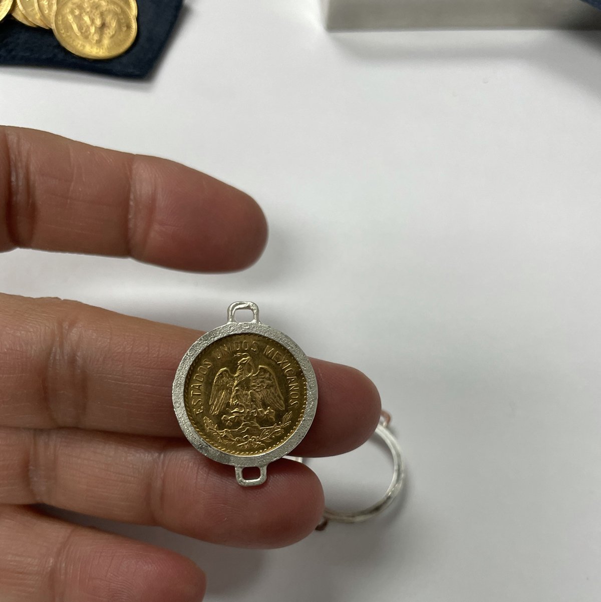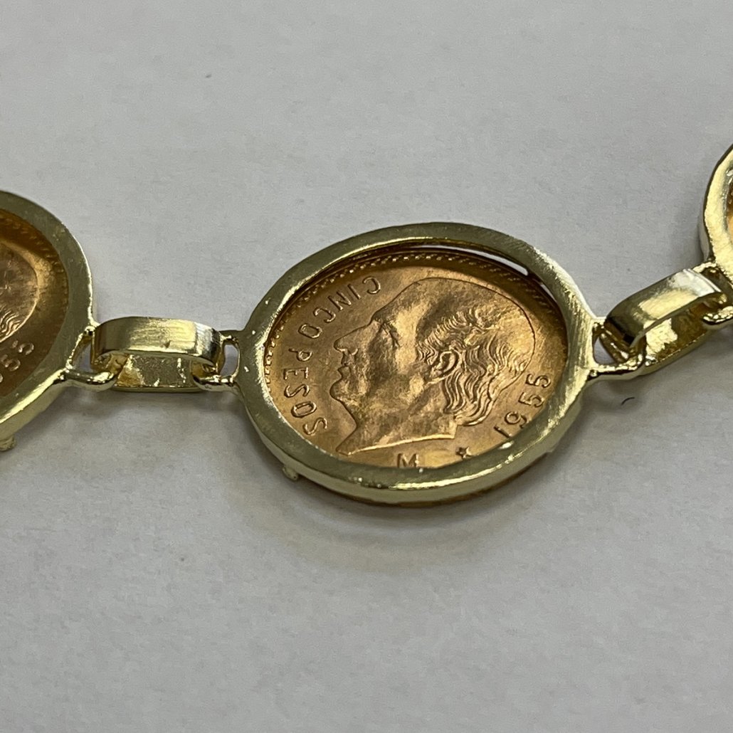 The necklace is custom made and a one-of-a-kind design. It contains seven gold Mexican Cinco Peso coins.