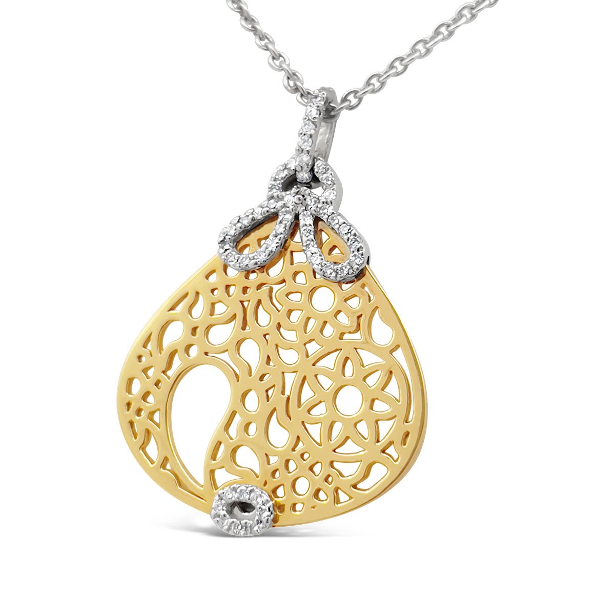 Open geometric design lets the light shine through the pendant, while diamonds sparkle atop the swirls.