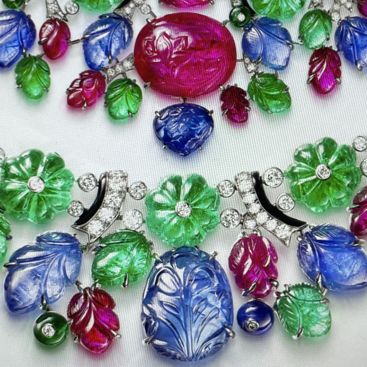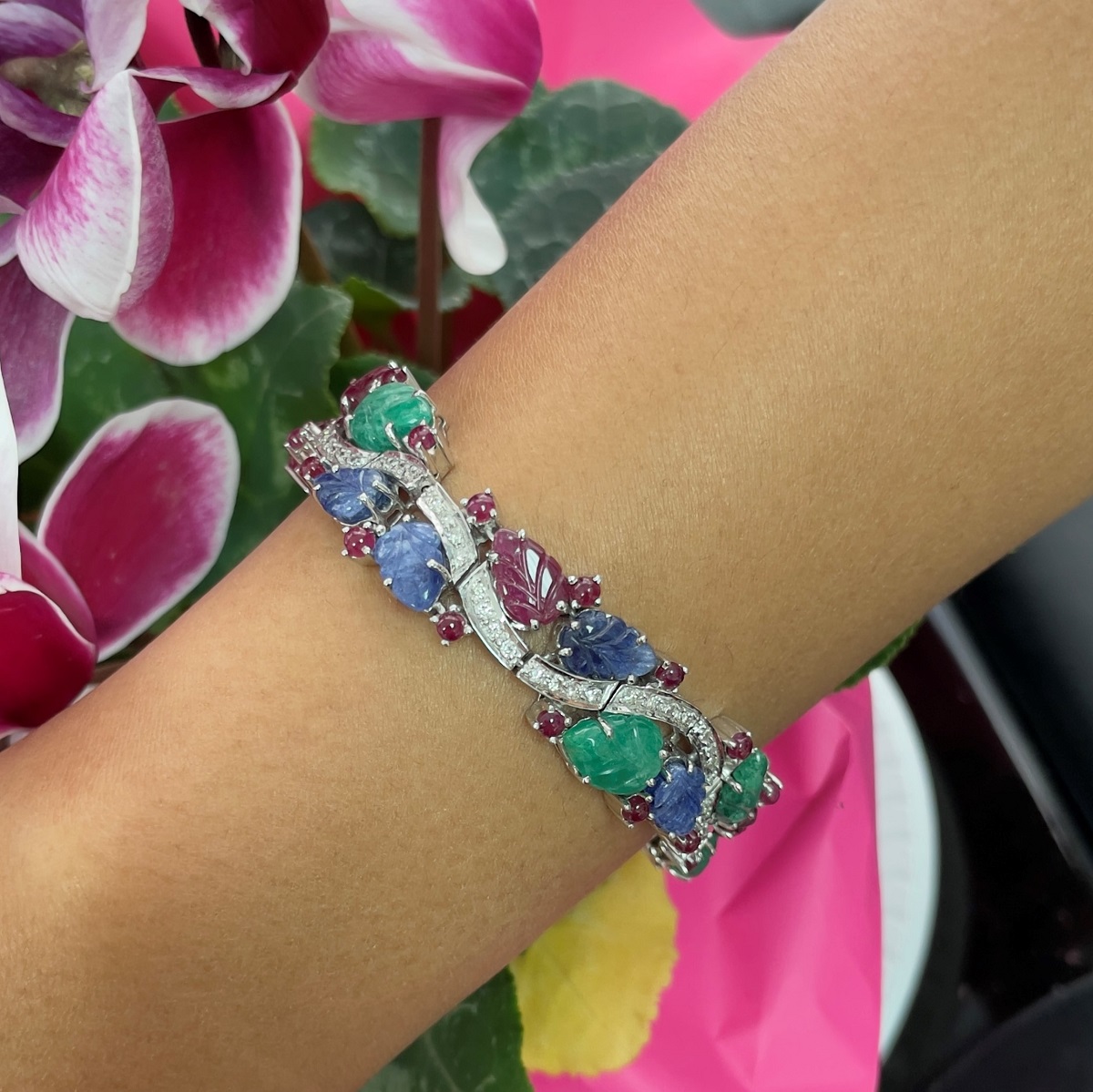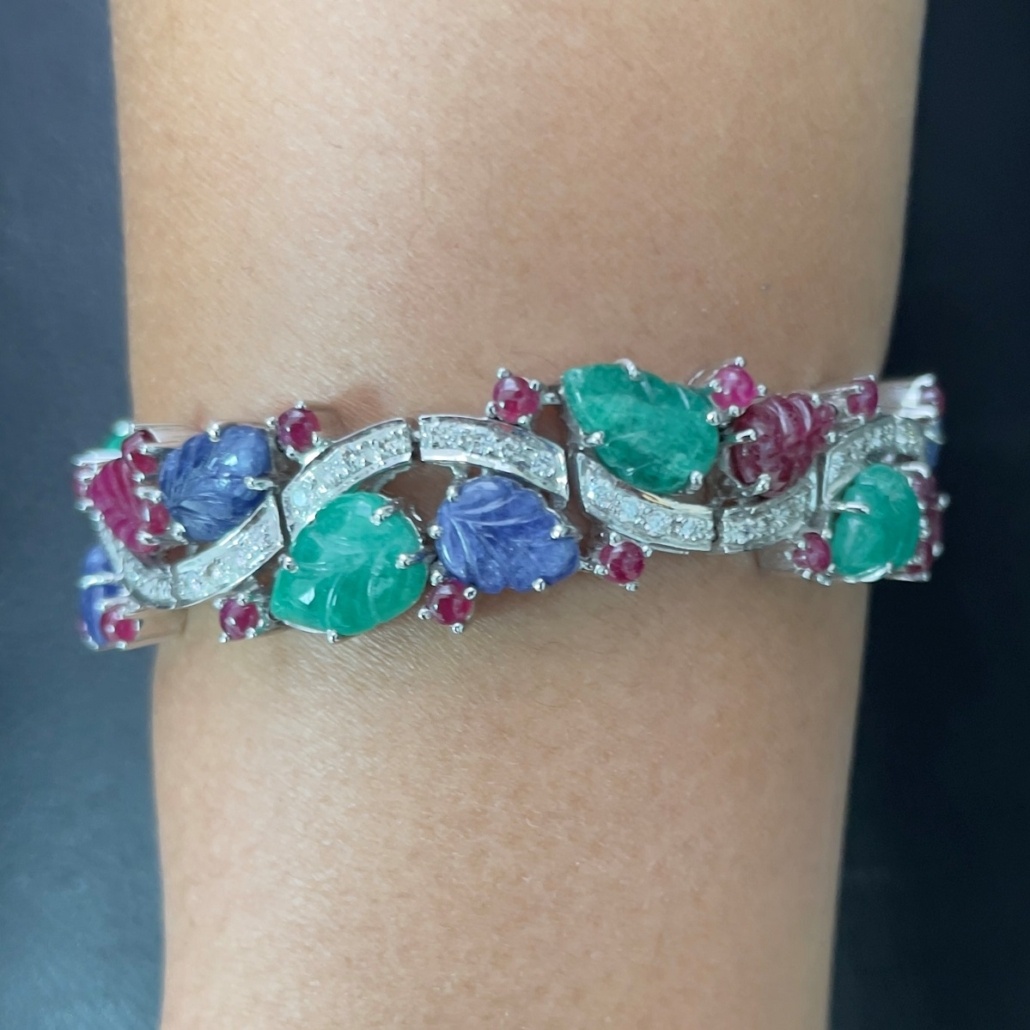 Tutie fruitie art deco jewelry from 1923 is highly sought after and can be quite valuable. This tutie fruitie art deco bracelet features geometric designs, brightly colored gemstones carved into leaves and berries.