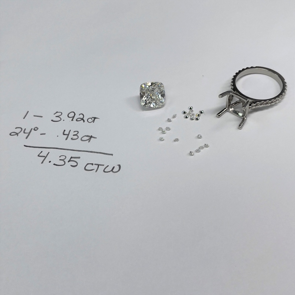 This Ring Is Made Of 95% Pure Platinum And 5% Iridium, And It weighs 5 grams. The Ring Contains One Natural Cushion Cut Diamond Weighing 3.92 Carats. The Ring Resign Is A Four-Prong Open Basket With A Cathedral Shank.