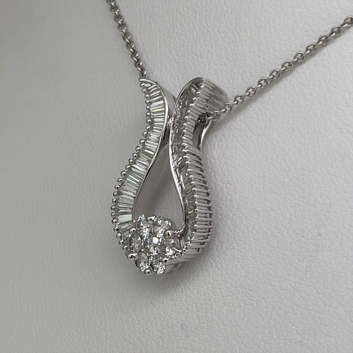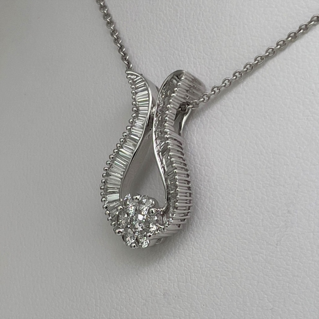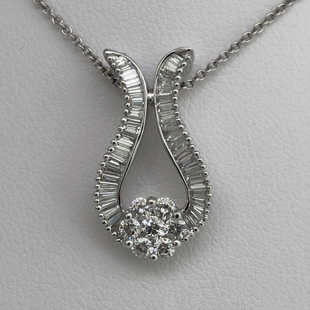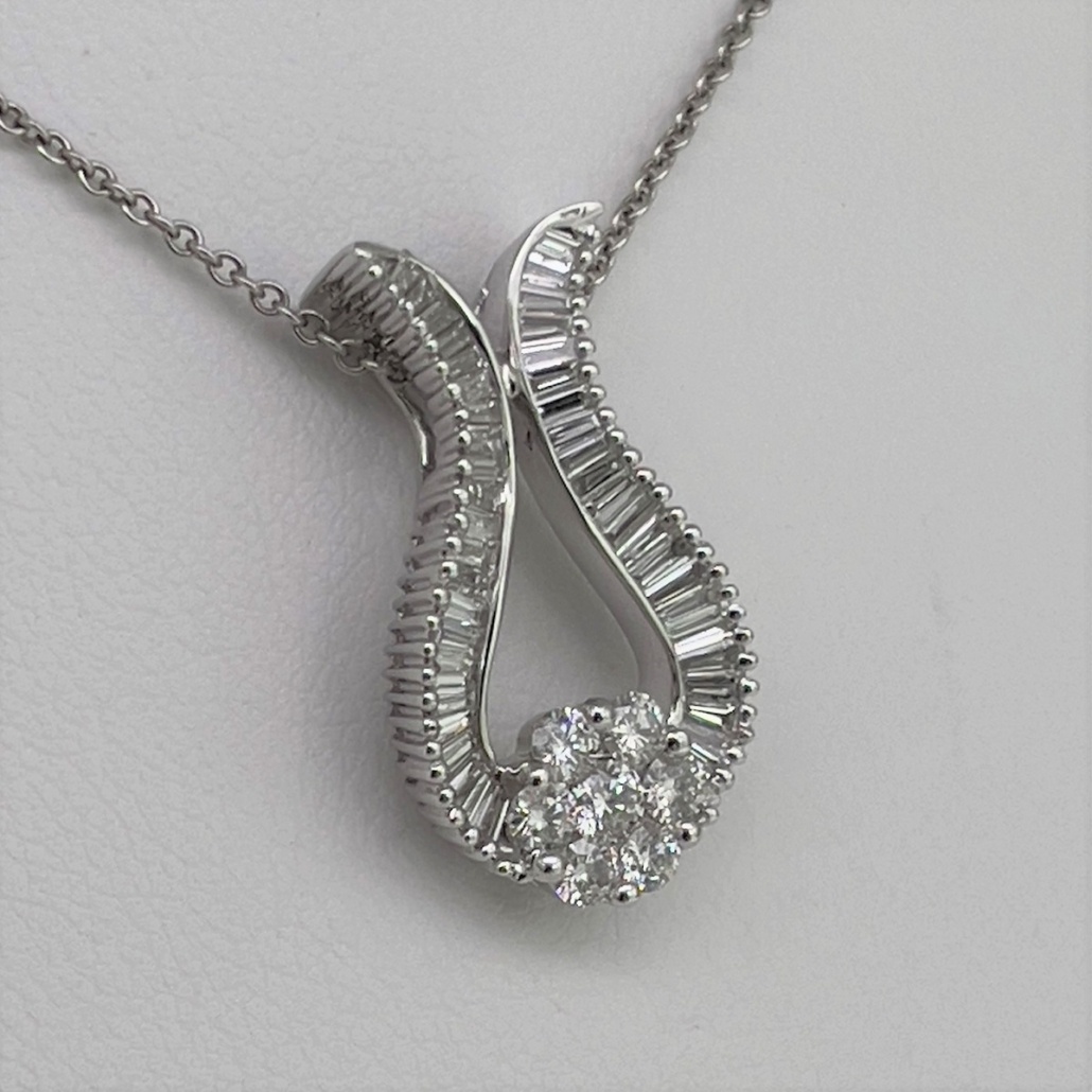Uniquely shaped 18k White Gold Pendant with baguettes and brilliant round diamonds.