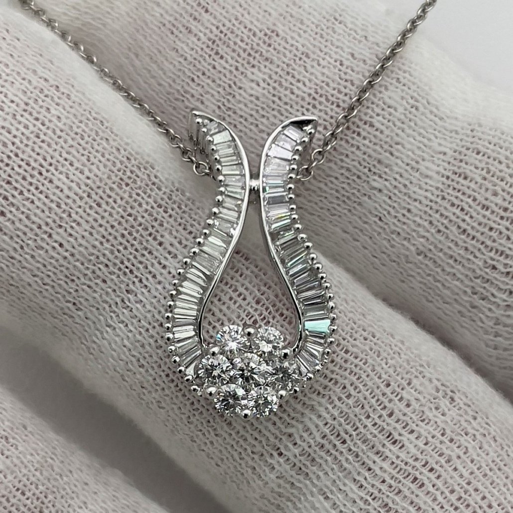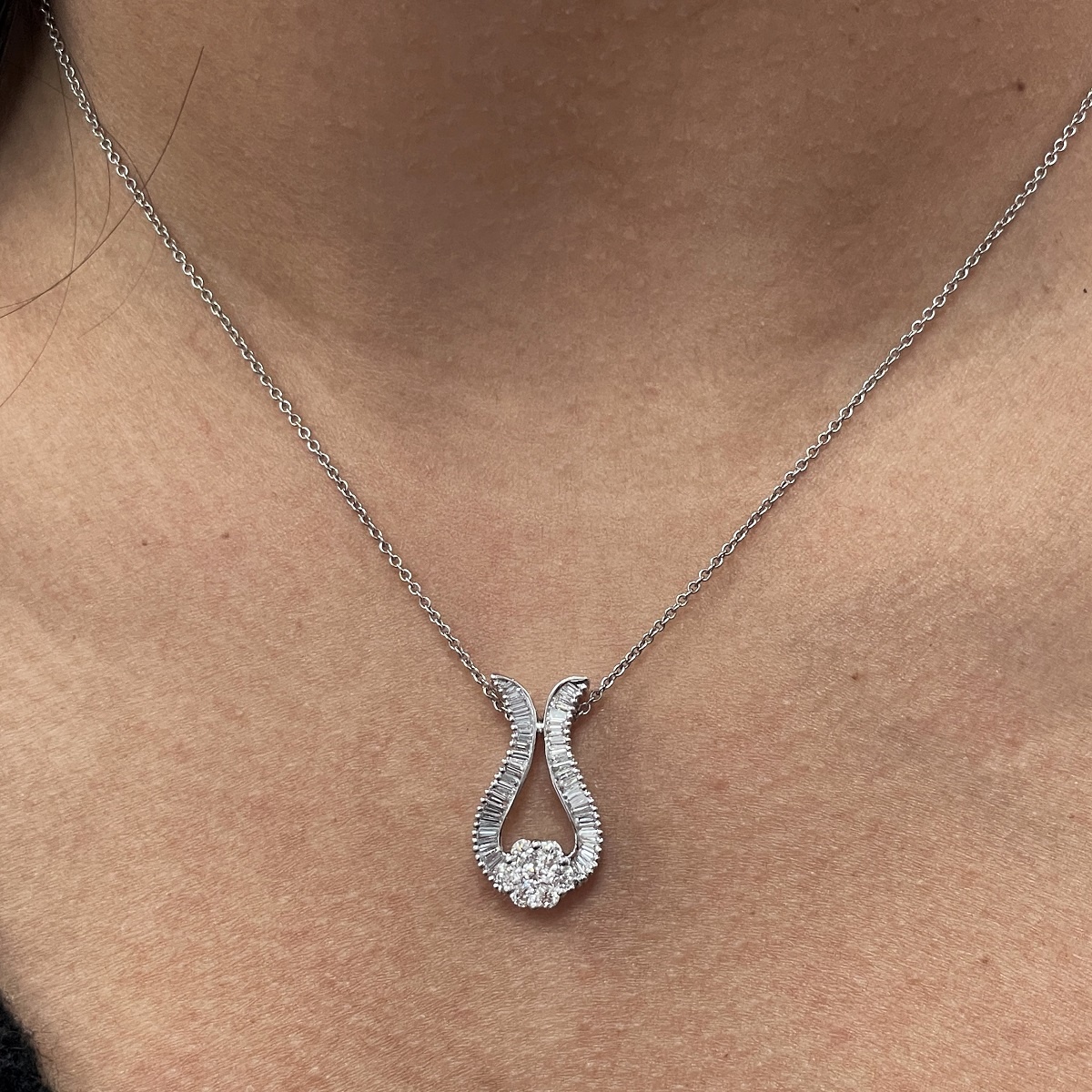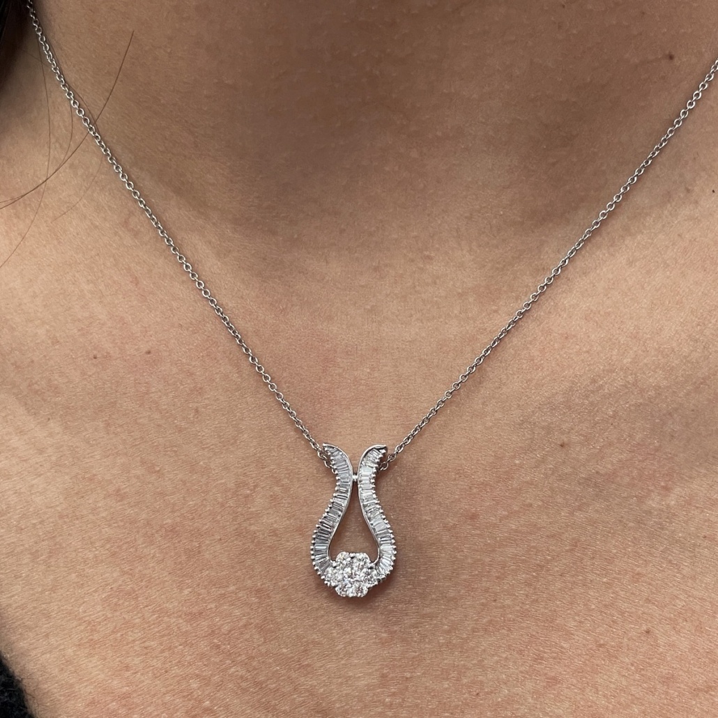 Uniquely shaped 18k White Gold Pendant with baguettes and brilliant round diamonds.