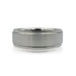 This wedding band contains twenty two natural round brilliant diamonds. The cut, polish and symmetry of the diamonds are excellent.  The stones are set side by side with shared prongs. The gallery holding the stones is solid with grooved detail outlining the prongs.