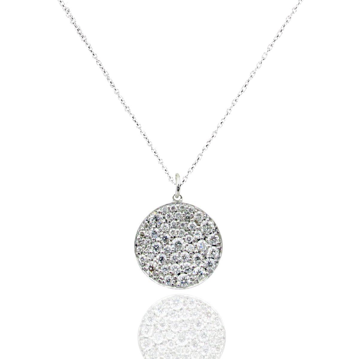 This pendant is made with 14k plumb white gold pendant is a concave circle and set with natural round brilliant diamonds.