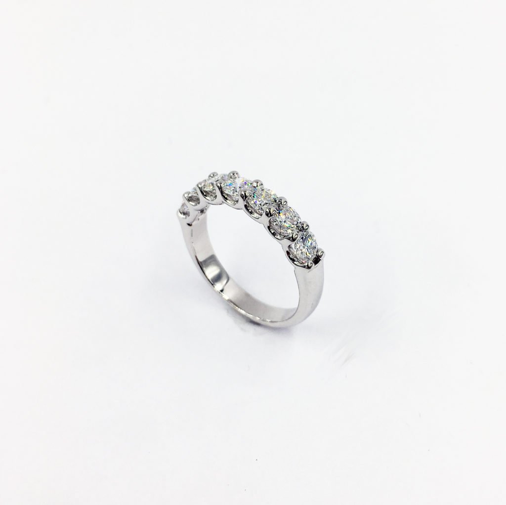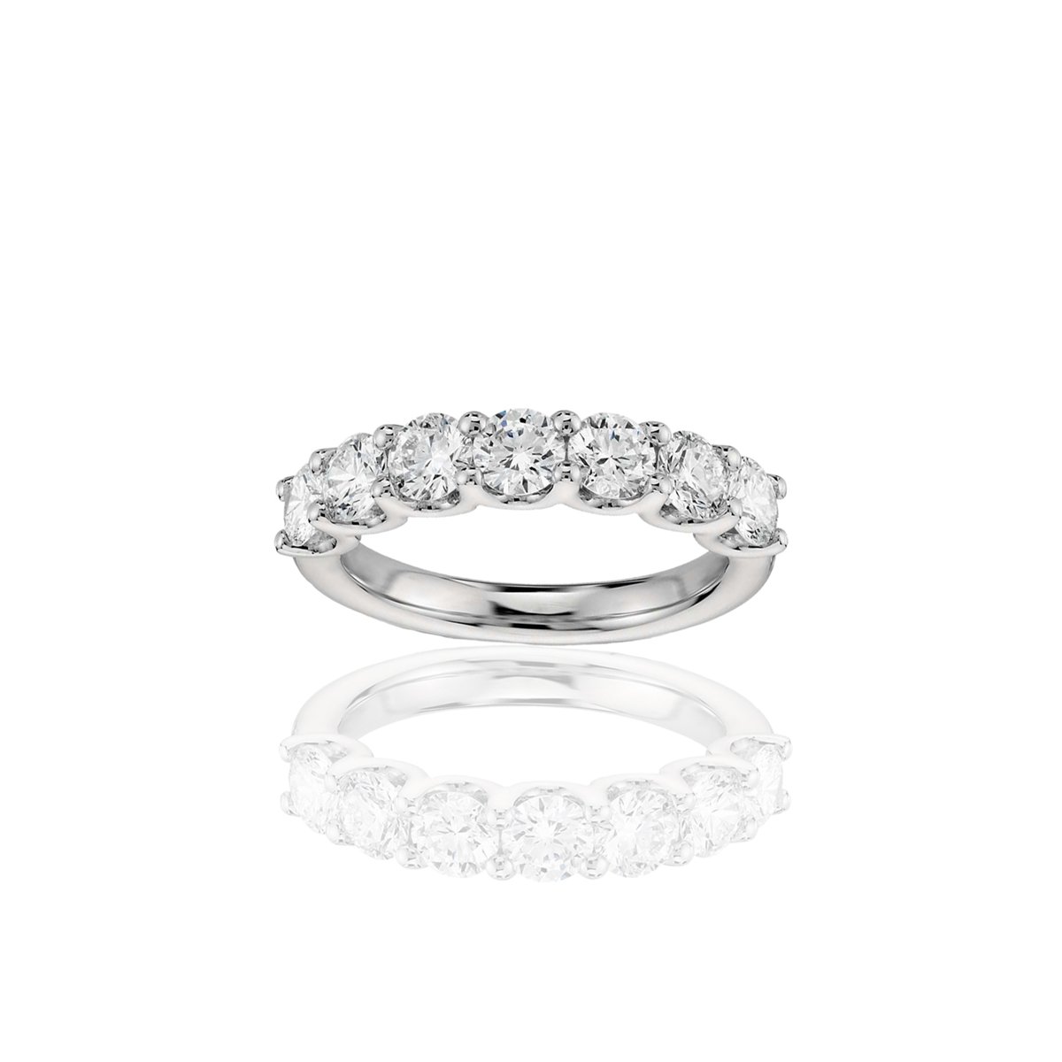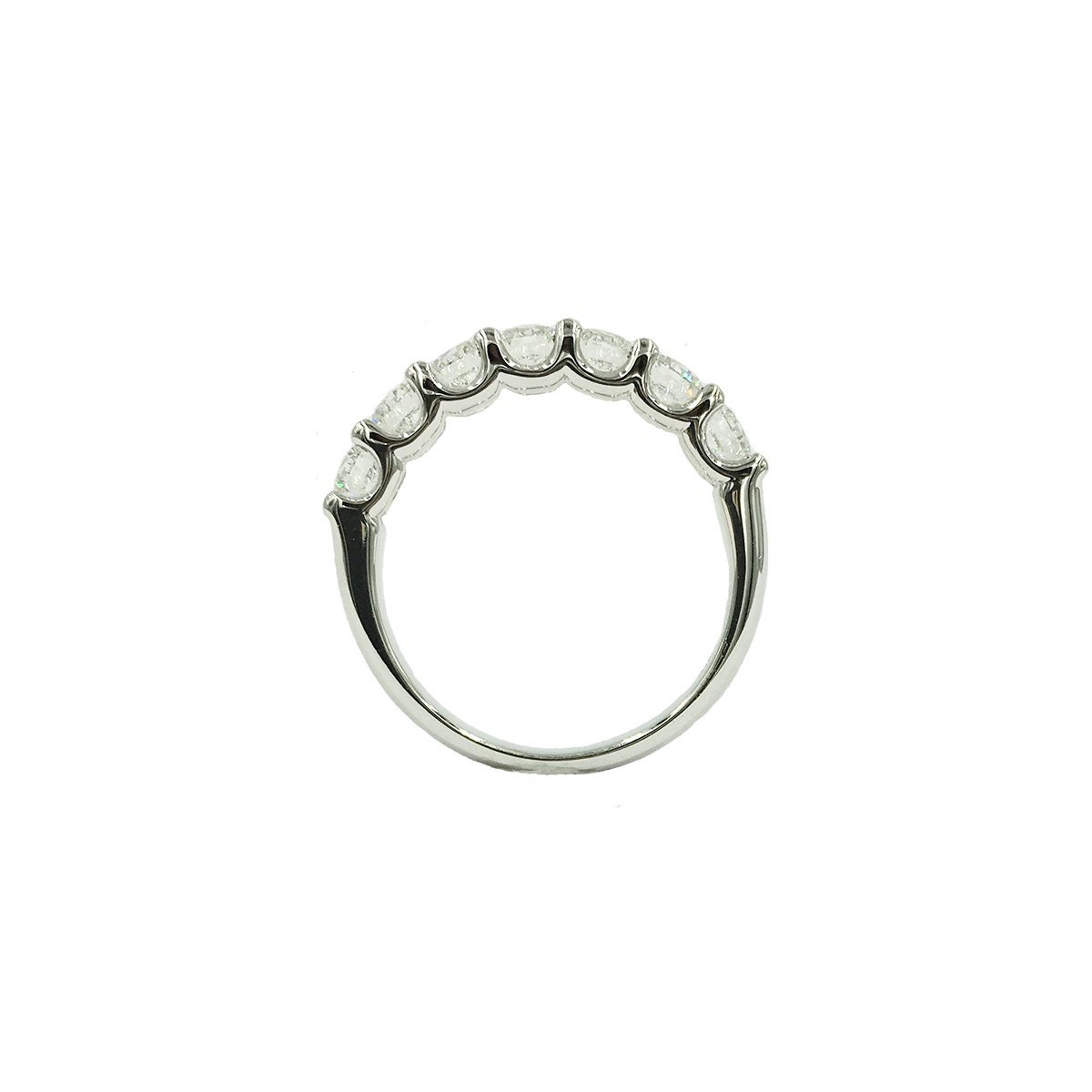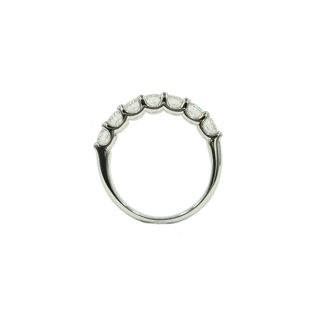 This 18k white gold wedding band is set with seven natural round brilliant diamonds in a u-shaped shared prongs.