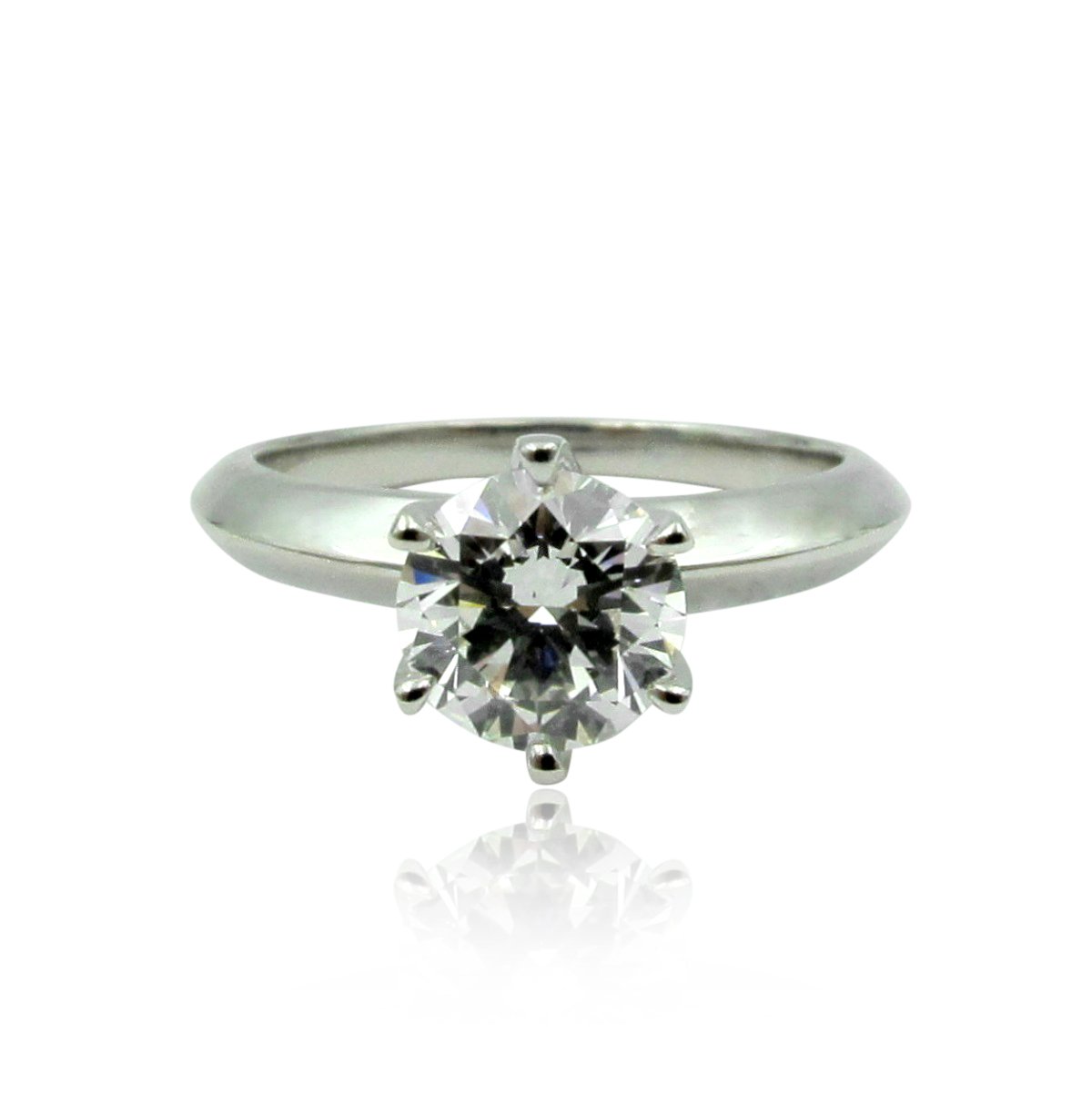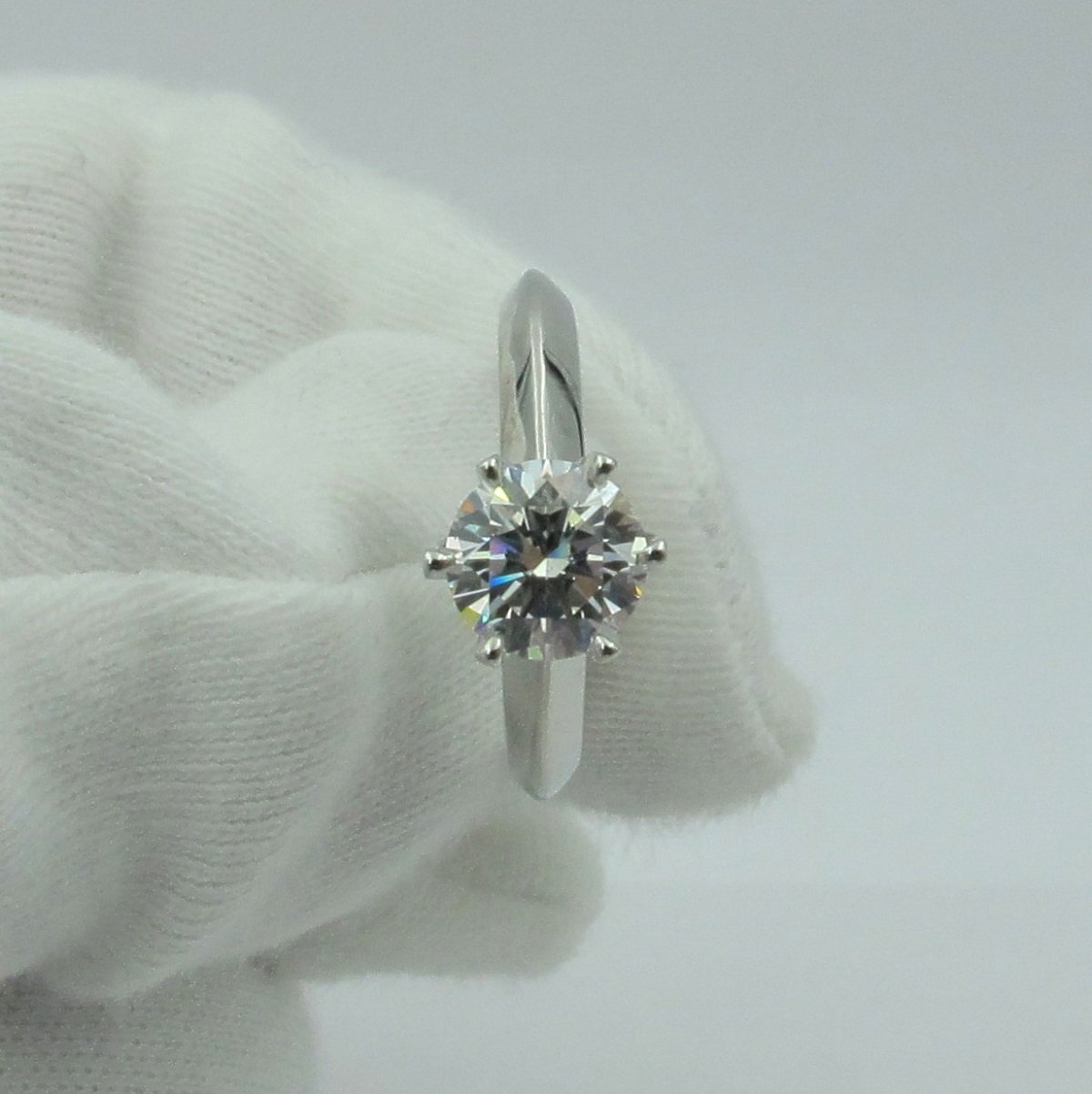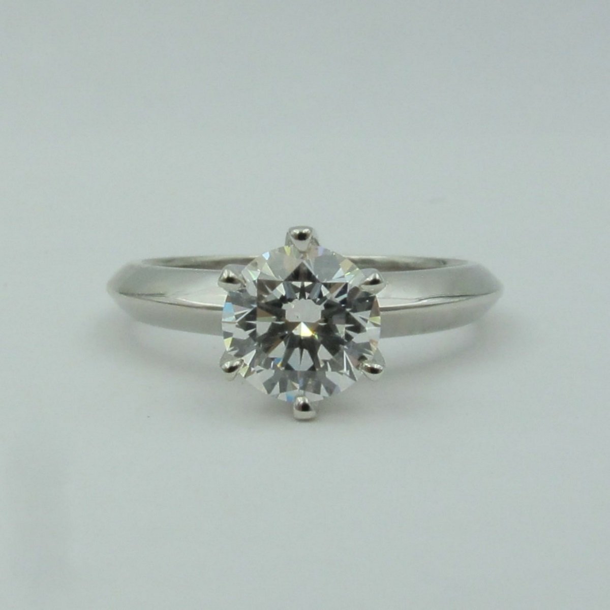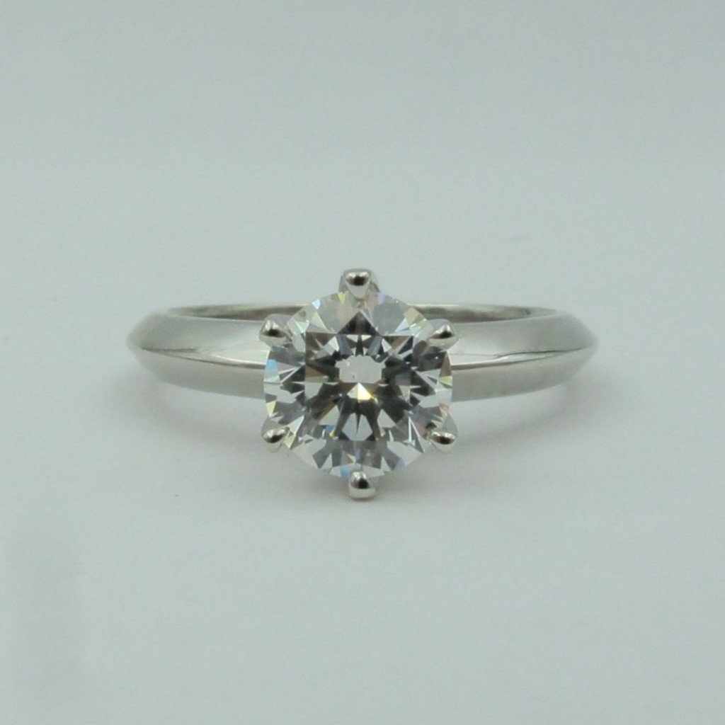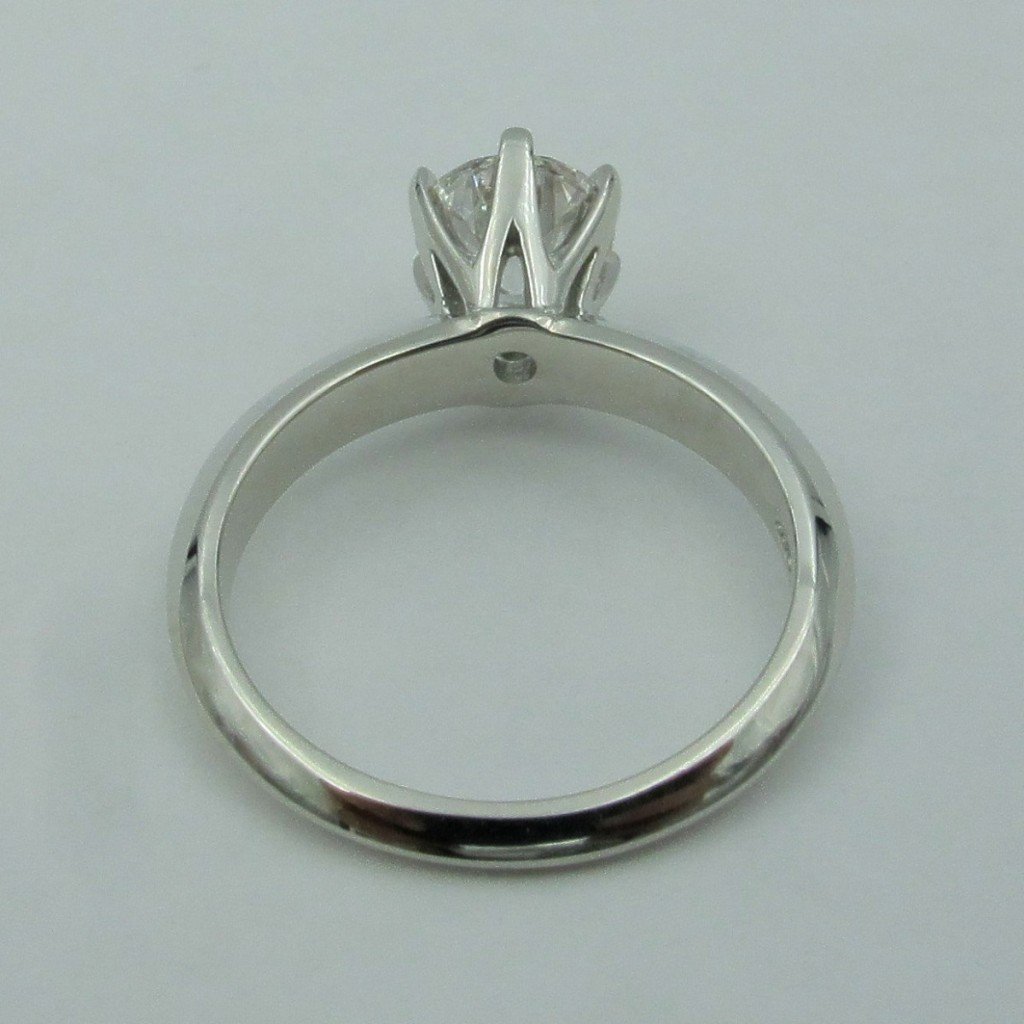 18K White Gold Solitaire Engagement Ring with a six prong set diamond crown top mounted on a knife edge shank.