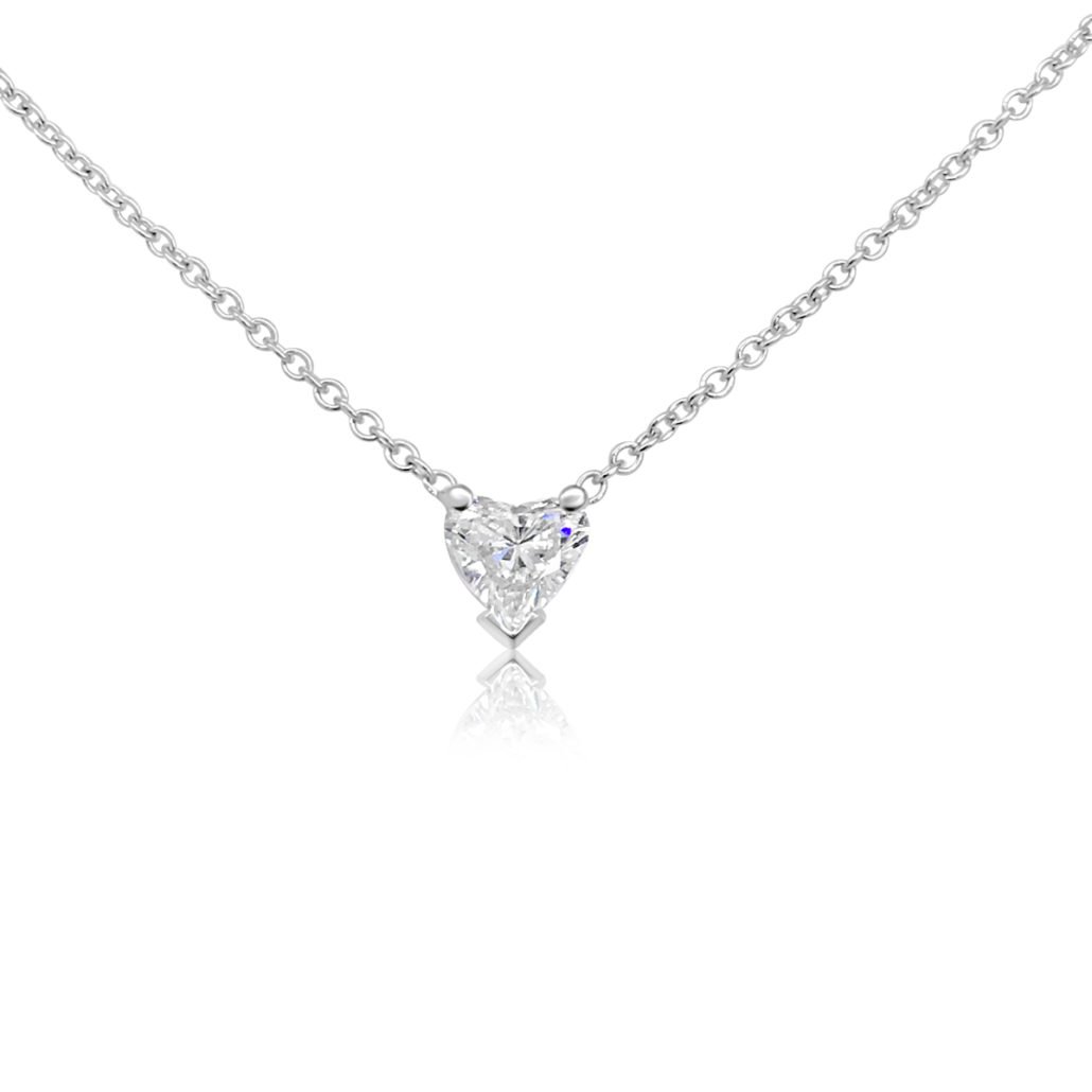 This solitaire pendant contains a beautiful heart shaped diamond that weighs .33carat. The heart shape diamond is 4mm wide and 5mm long. The color grade is G and the clarity grade is I1. The setting is an open basket with a V prong. The pendant is permanently attached to a cable link chain measuring 16” long. The necklace is secured with a lobster clasp.