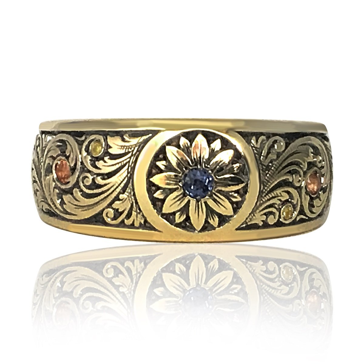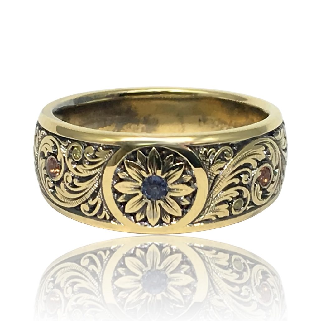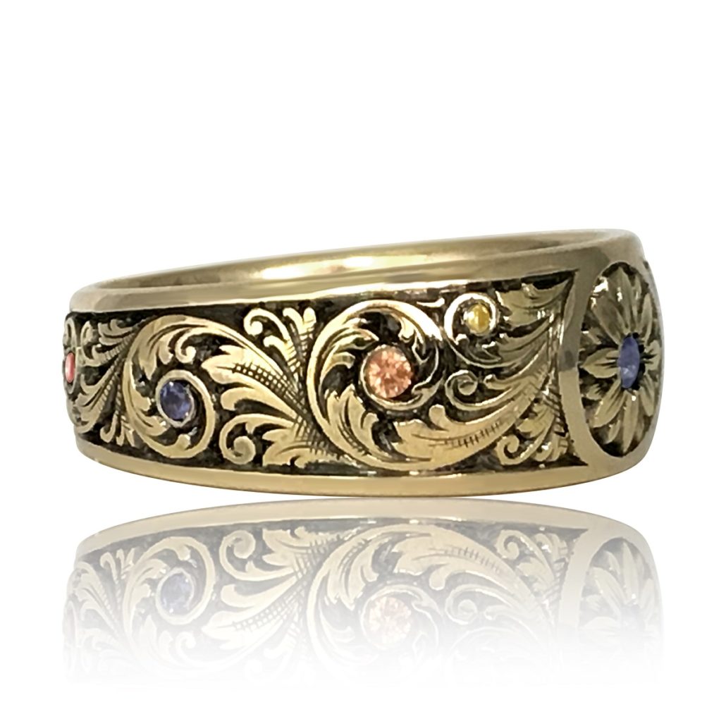 This is an intricately hand carved wedding ring made with 14k yellow gold and handcrafted feather like design. Burnished set with natural color diamonds, natural sapphires and rubies.