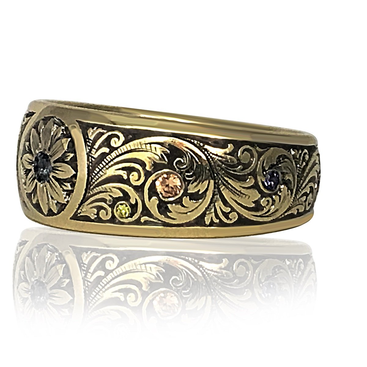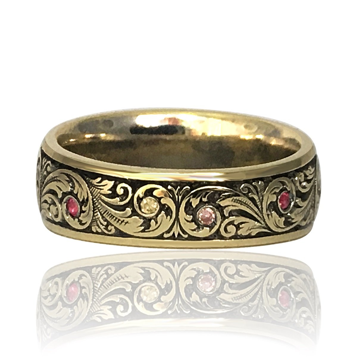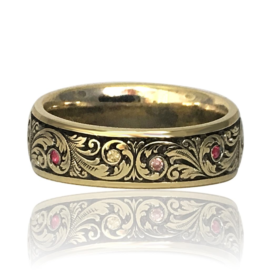 This is an intricately hand carved wedding ring made with 14k yellow gold and handcrafted feather like design. Burnished set with natural color diamonds, natural sapphires and rubies.