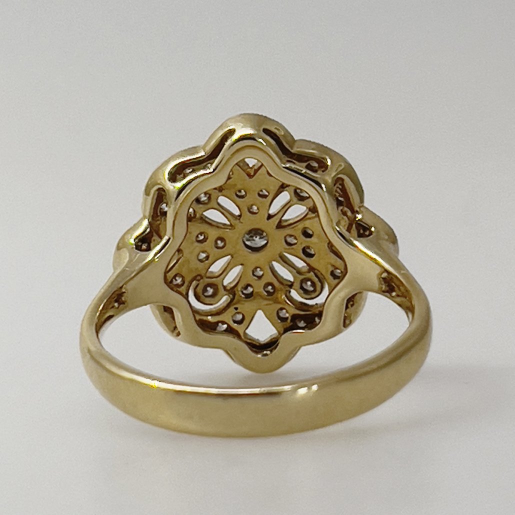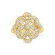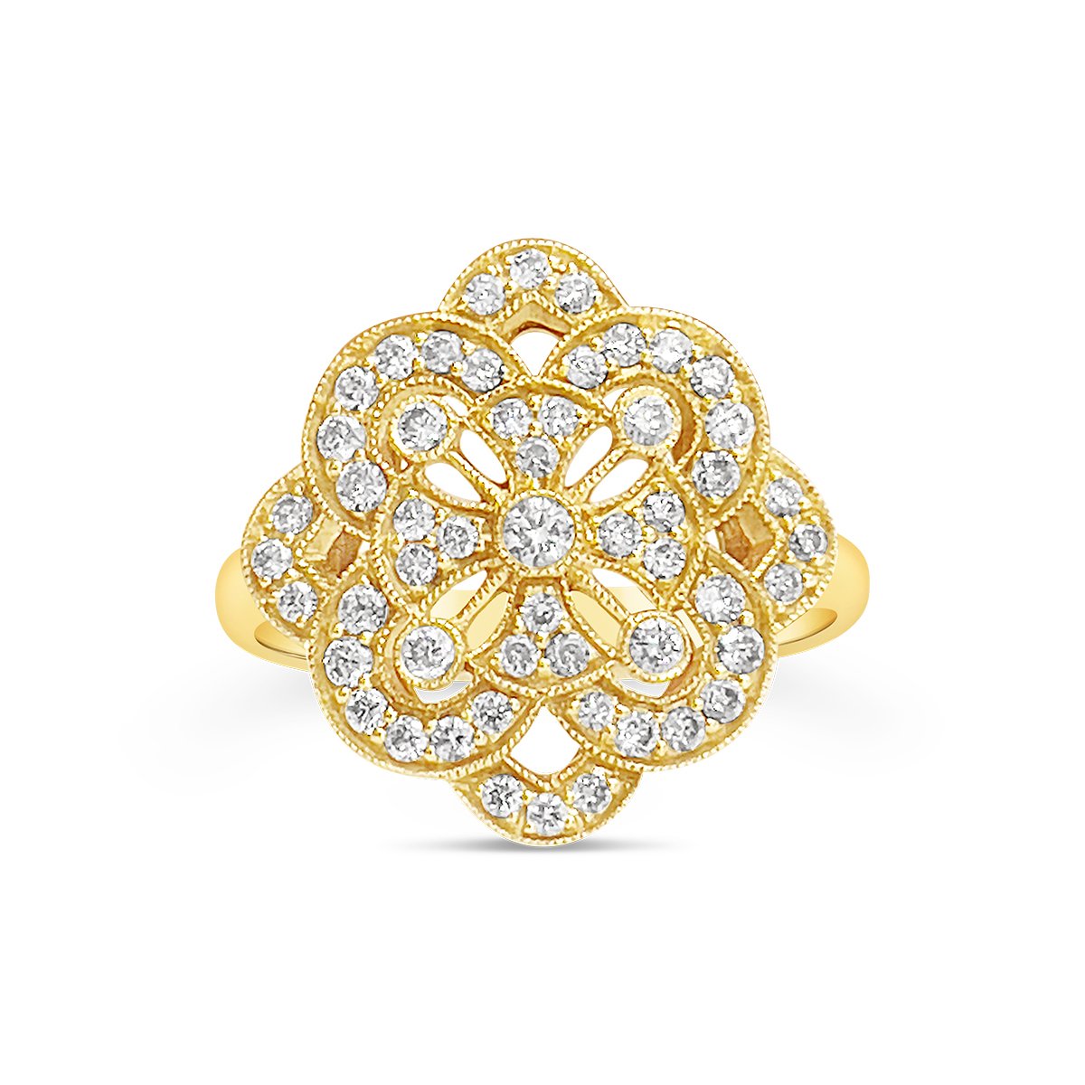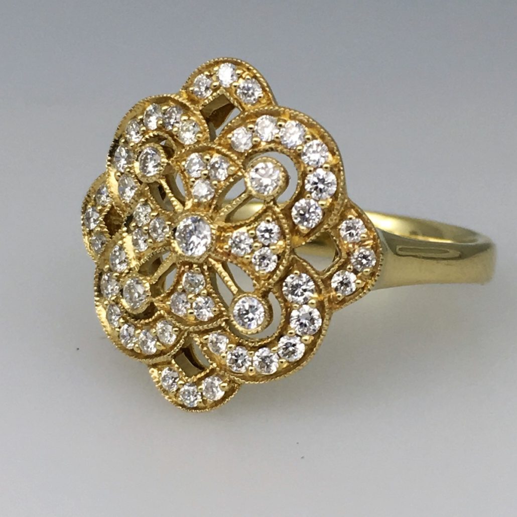 This yellow gold and diamond floral ring is part-antique, part-statement, and 100% style! Made with 14k yellow gold