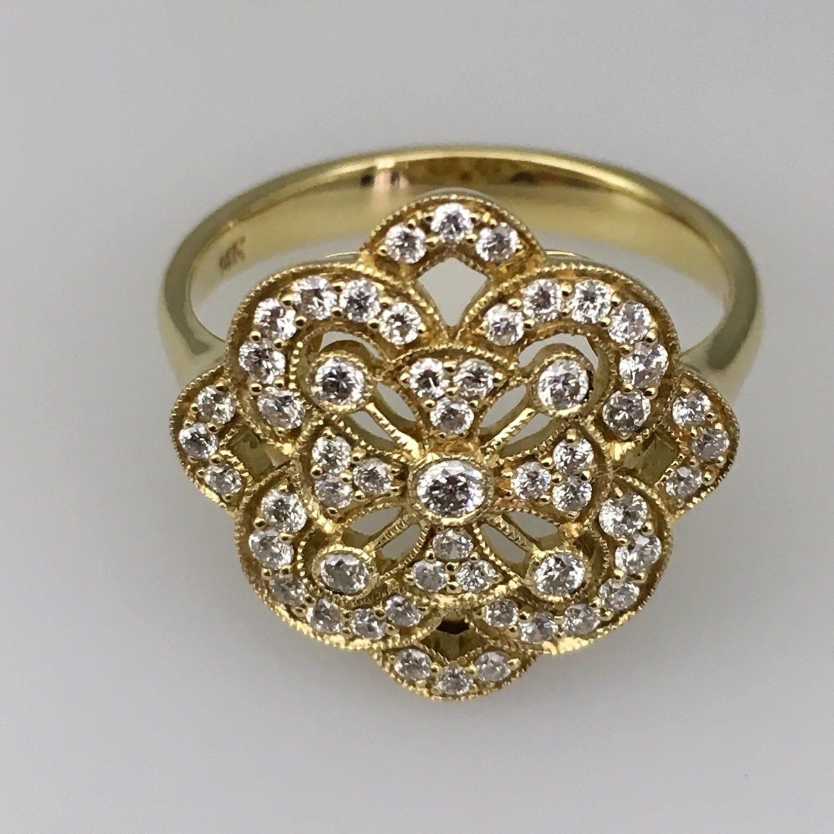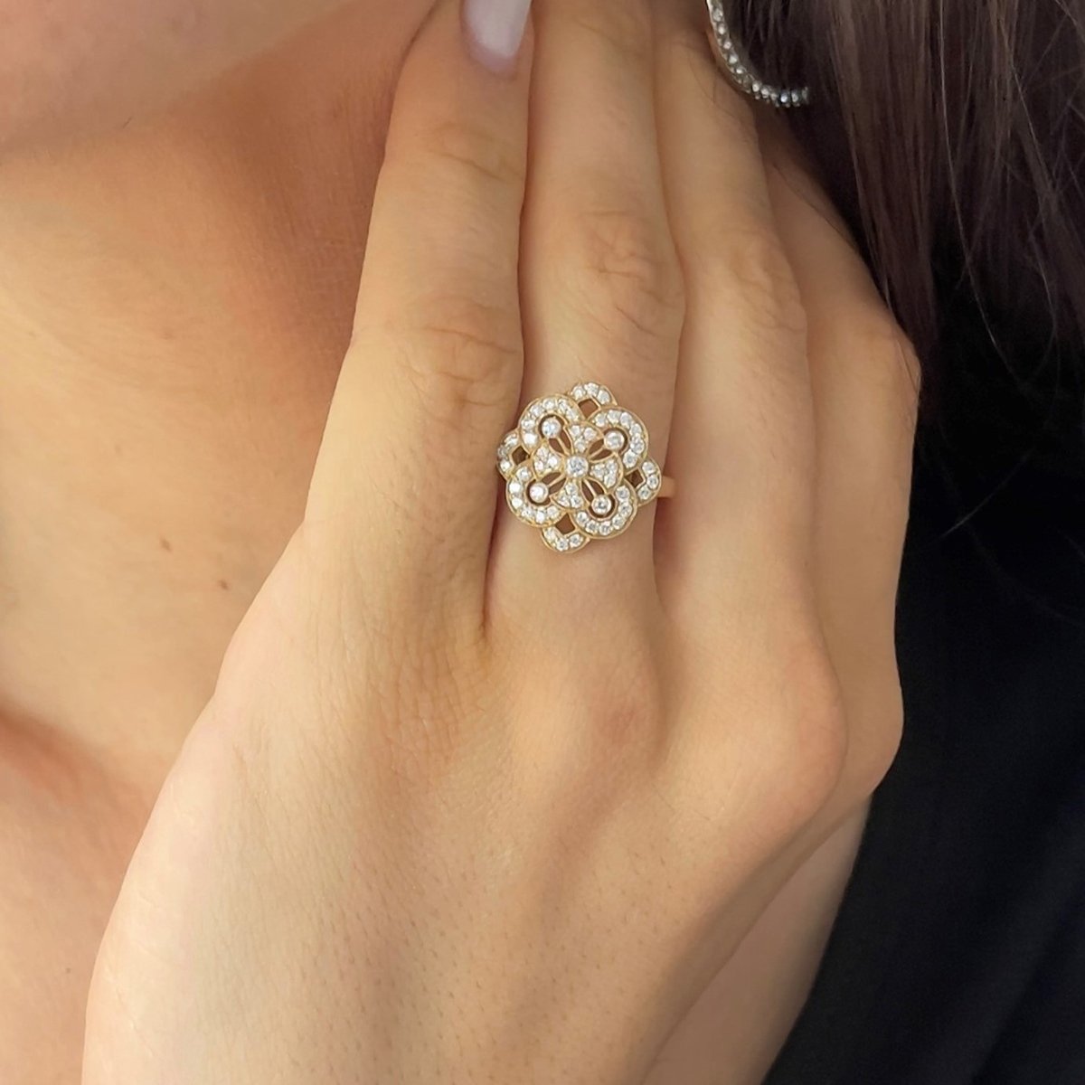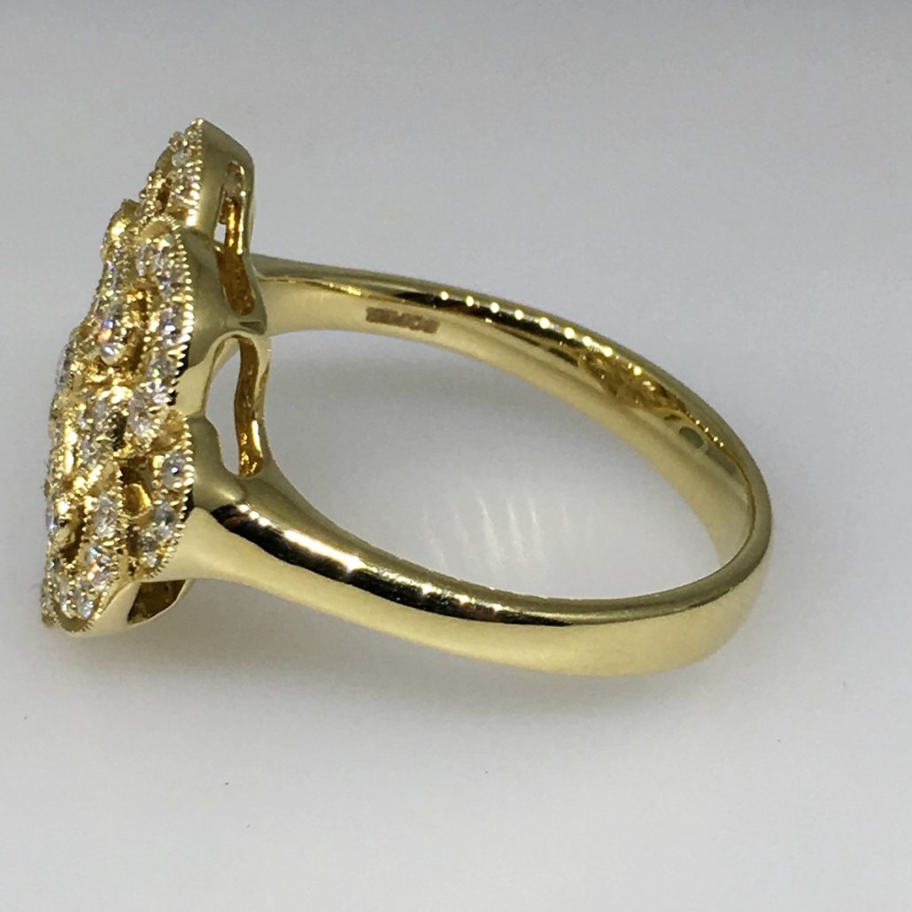 This yellow gold and diamond floral ring is part-antique, part-statement, and 100% style! Made with 14k yellow gold