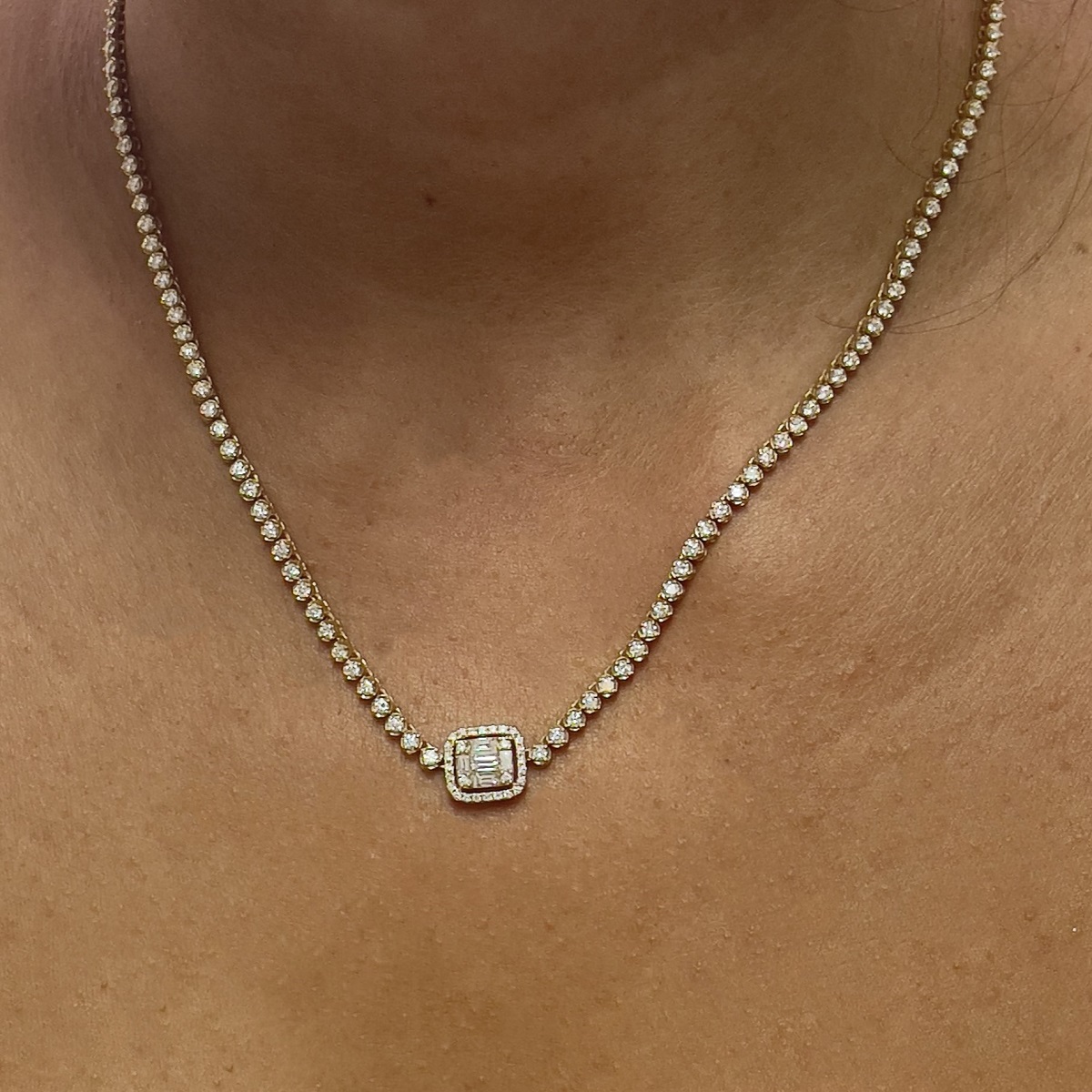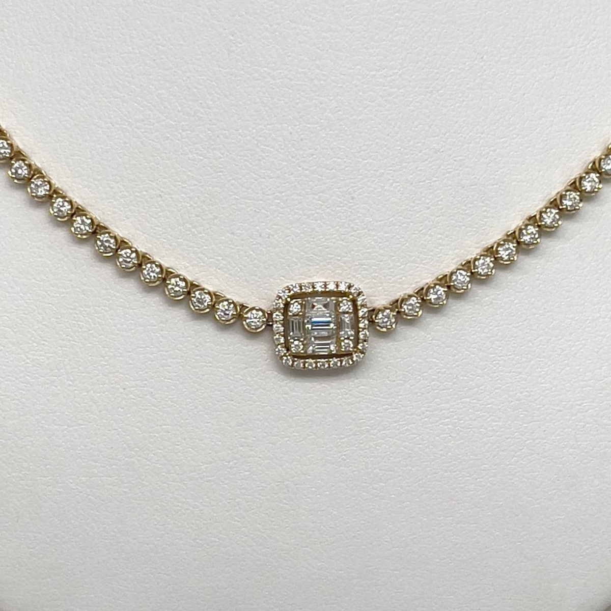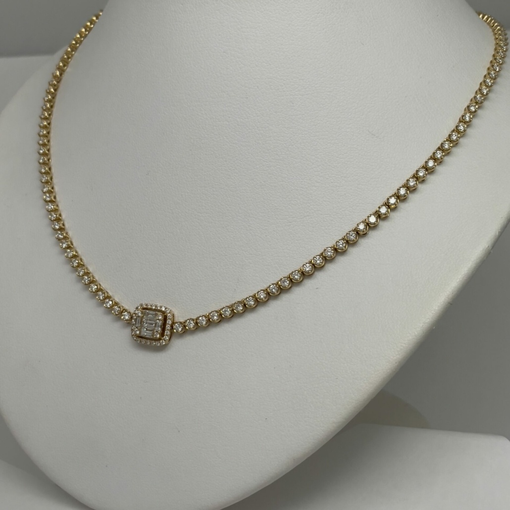 This necklace is made with 18k yellow gold. Each link is a four prong set round brilliant diamond . The center of the necklace is a baquette crown – a cluster of diamonds made with small baguette cut diamonds surrounded by small round brilliant cut diamonds.