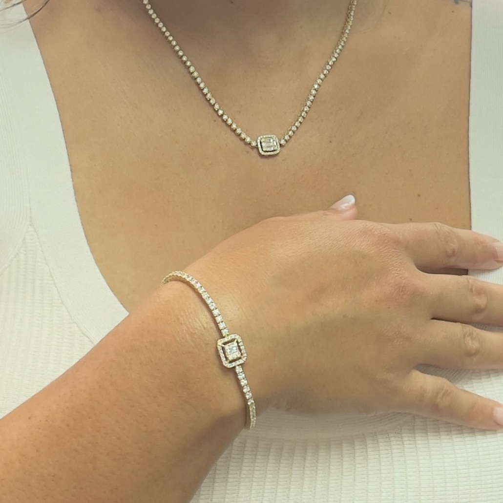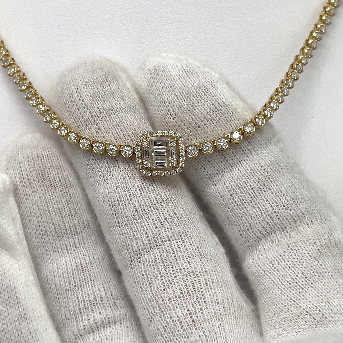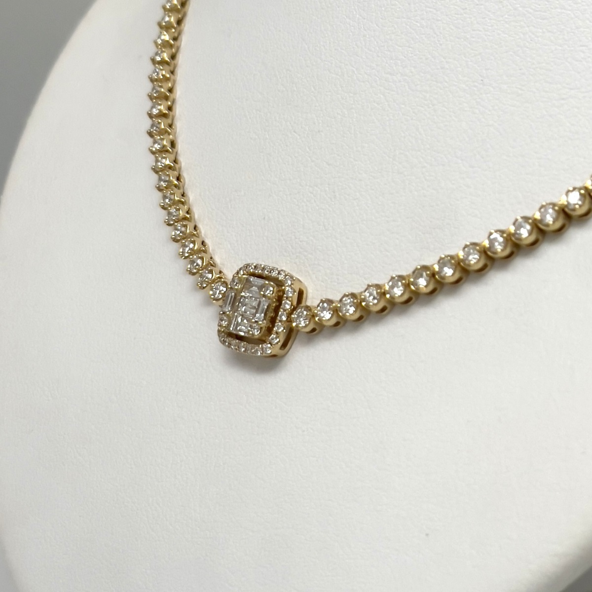 This necklace is made with 18k yellow gold. Each link is a four prong set round brilliant diamond . The center of the necklace is a baquette crown – a cluster of diamonds made with small baguette cut diamonds surrounded by small round brilliant cut diamonds.