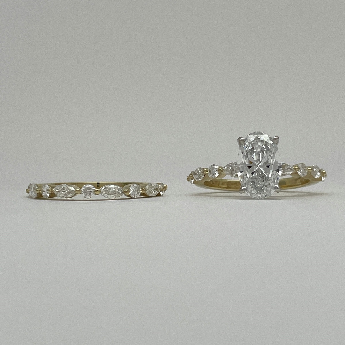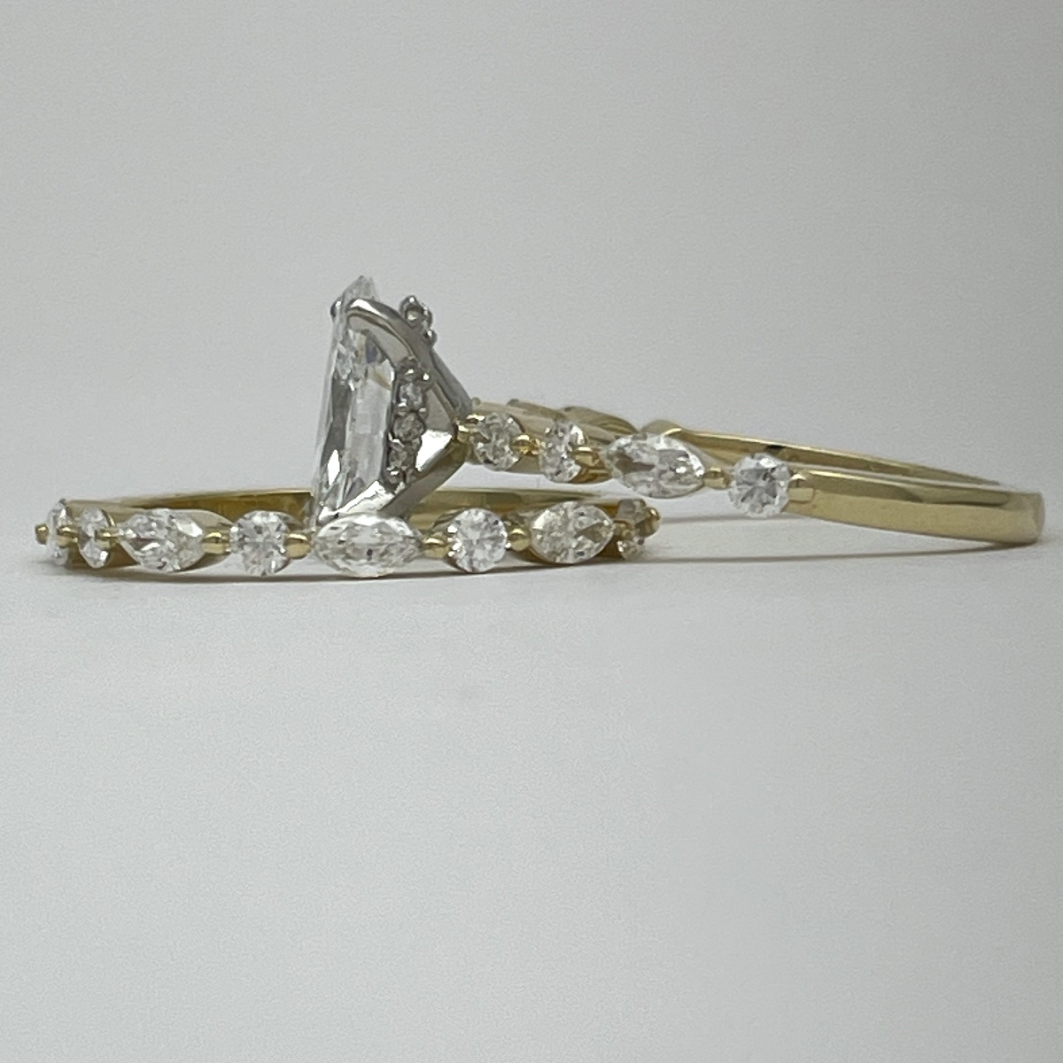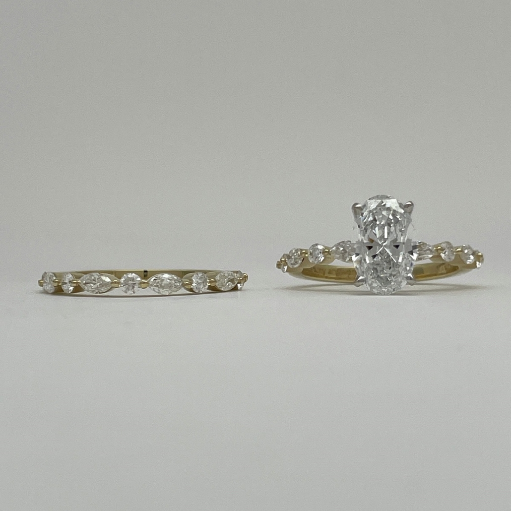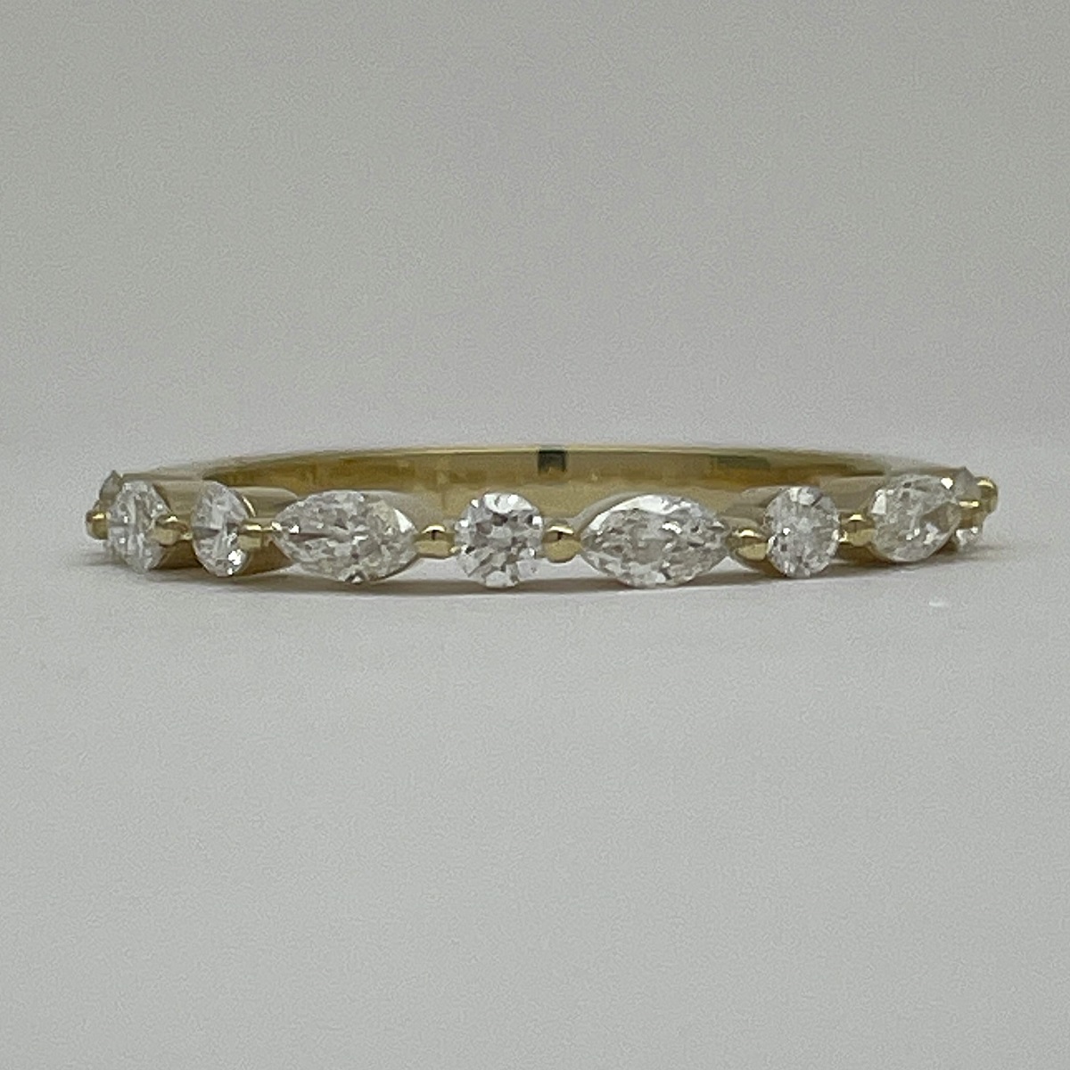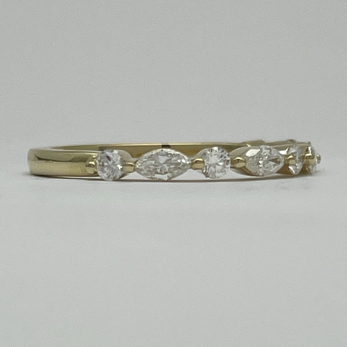 Each diamond—round and marquise—dances in balance along a lustrous yellow gold band, catching light the way love catches us: unexpectedly, beautifully, forever.