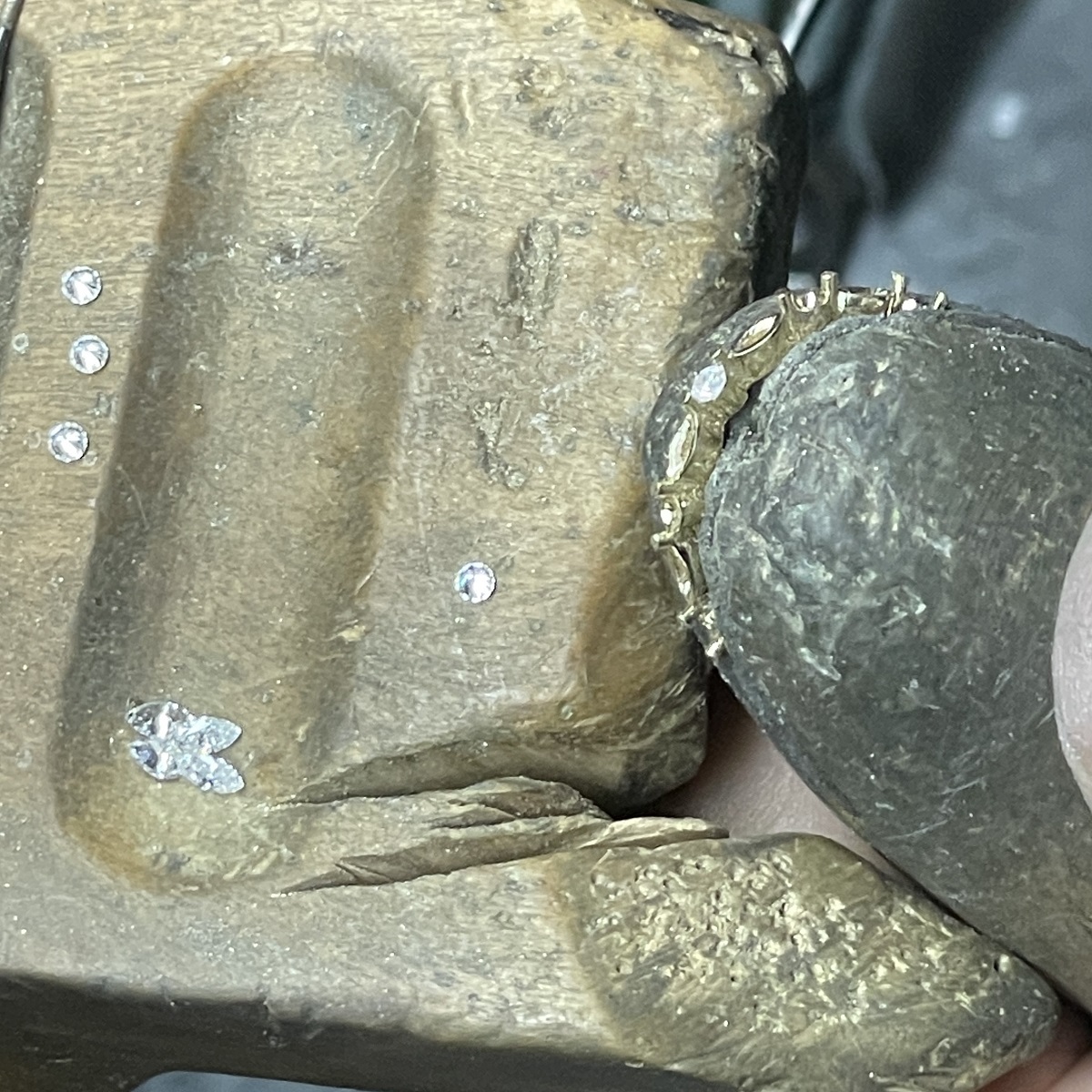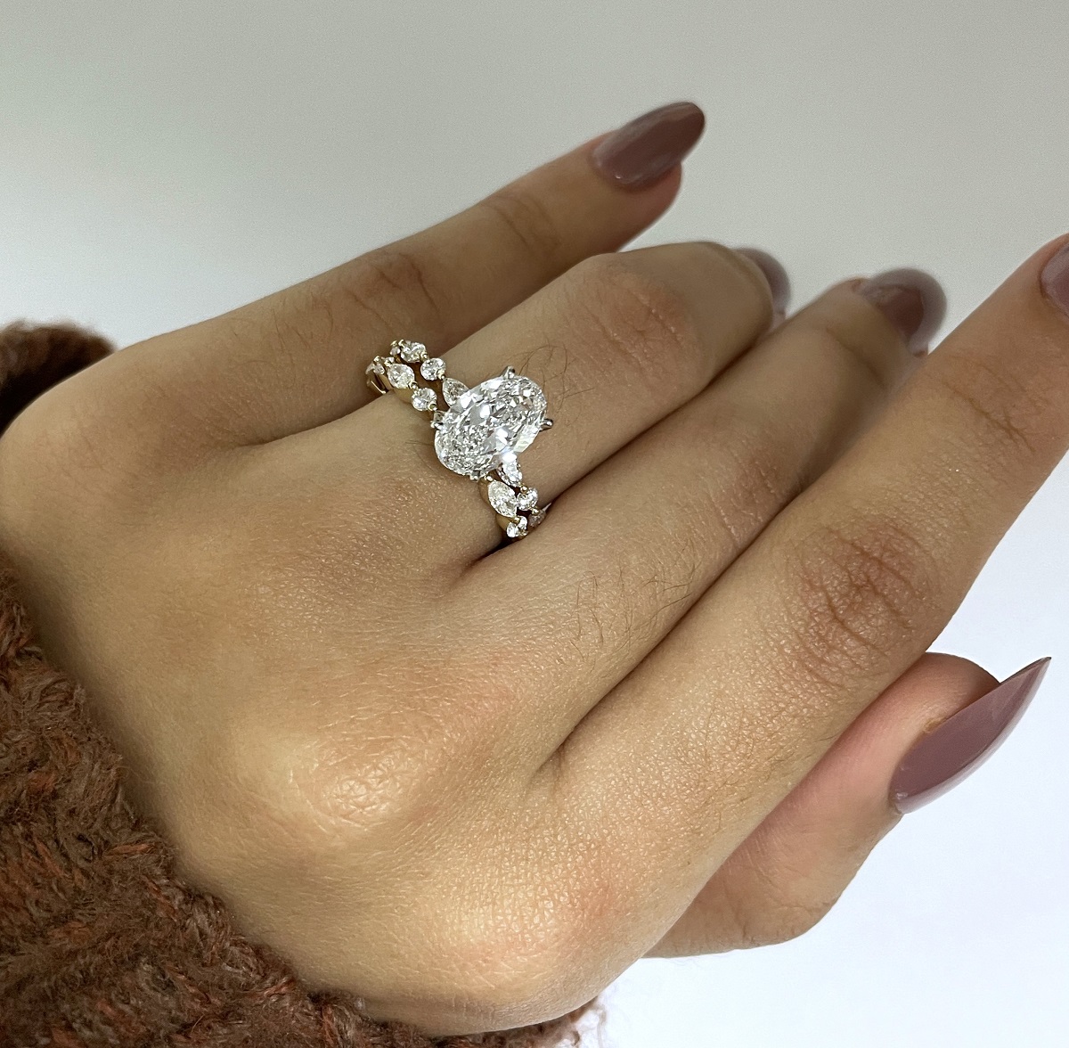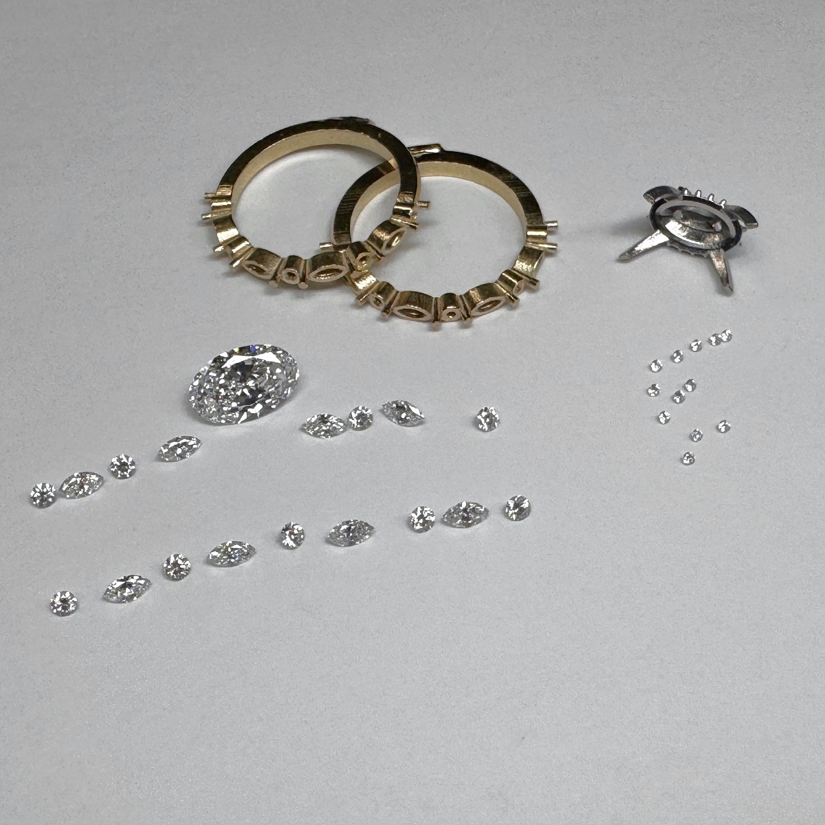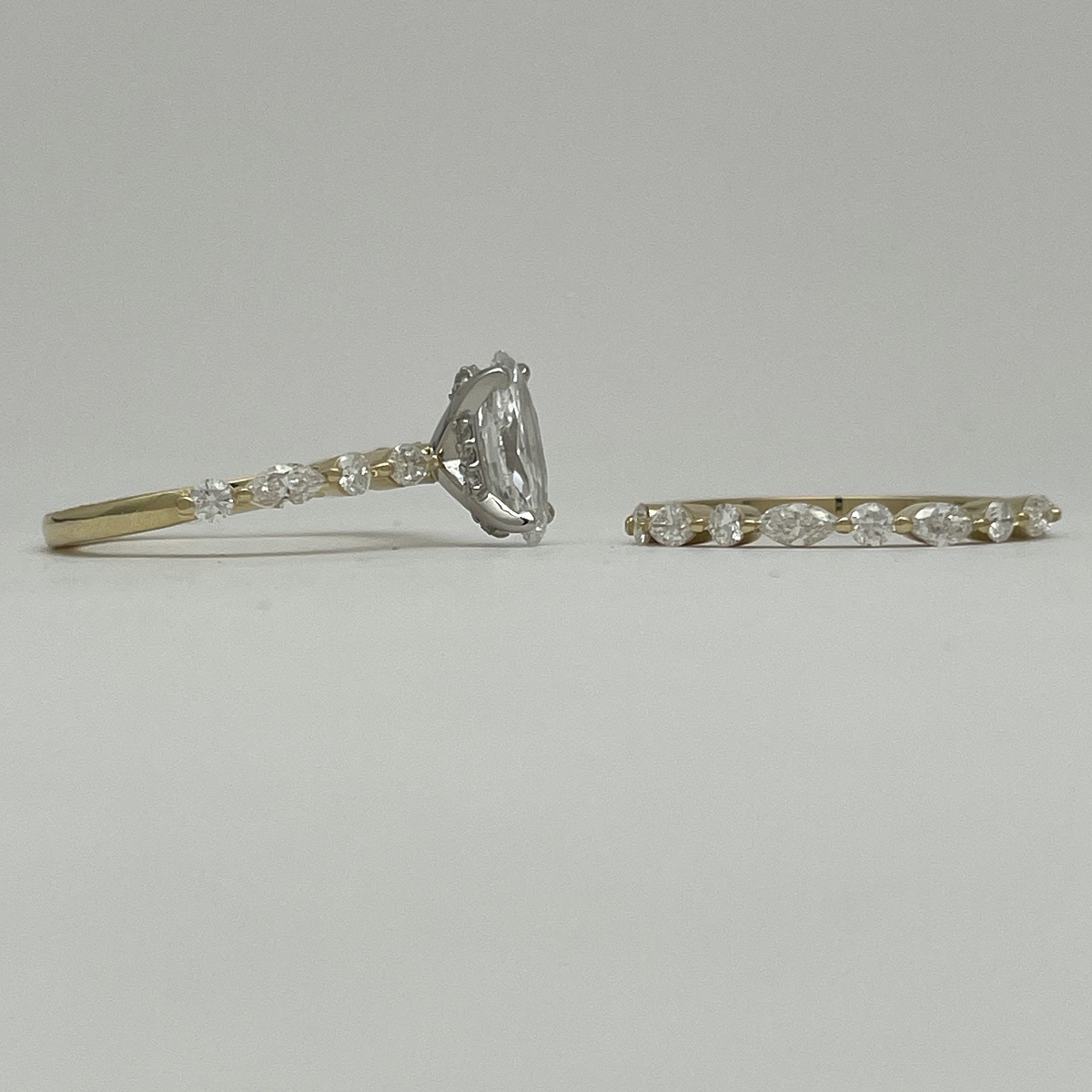 Each diamond—round and marquise—dances in balance along a lustrous yellow gold band, catching light the way love catches us: unexpectedly, beautifully, forever.