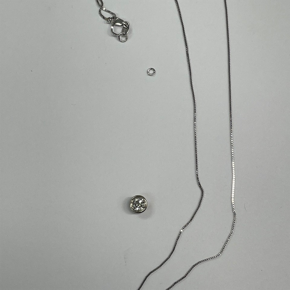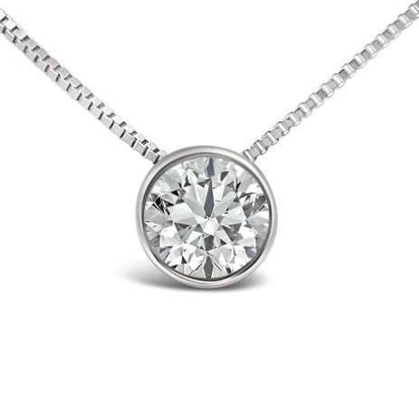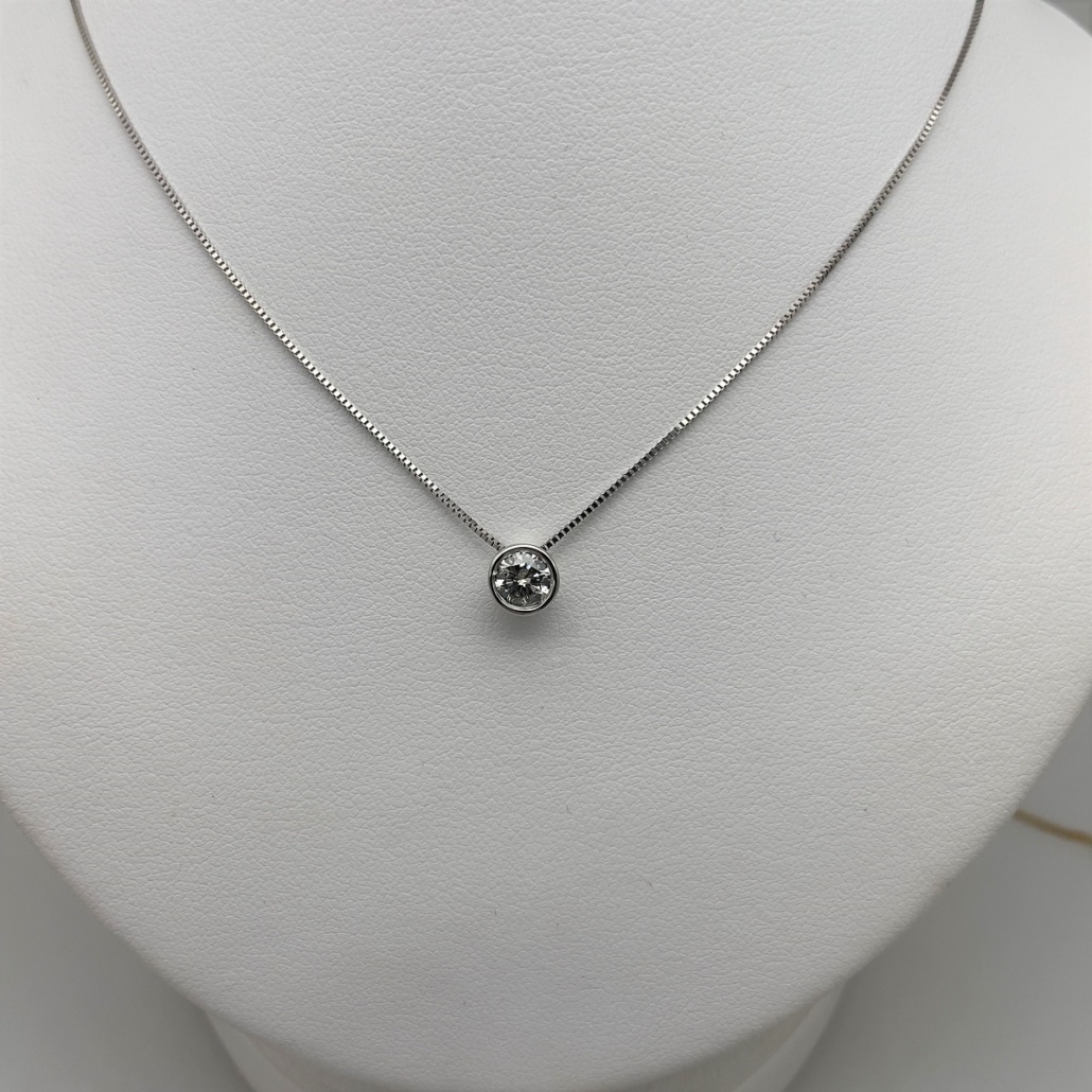 Round Brilliant Diamond Set In 14K White Gold Bezel. Sliding On A Box Chain