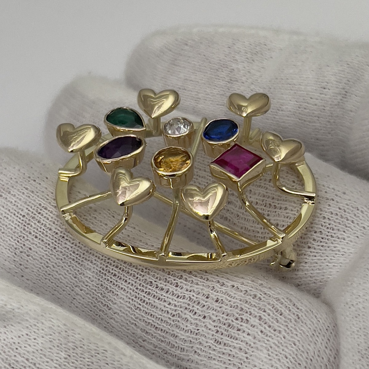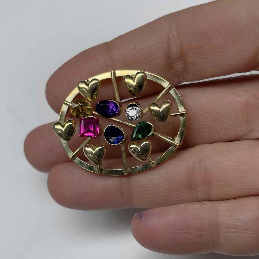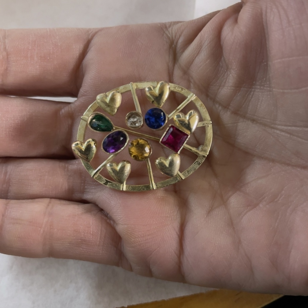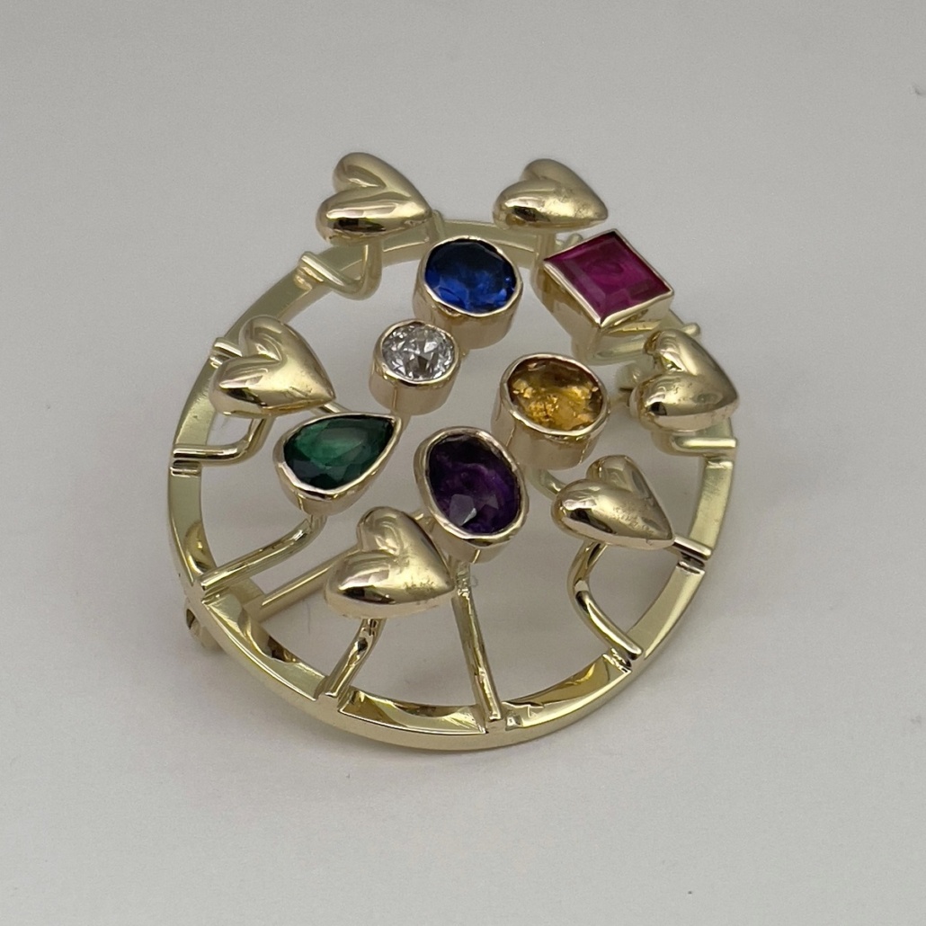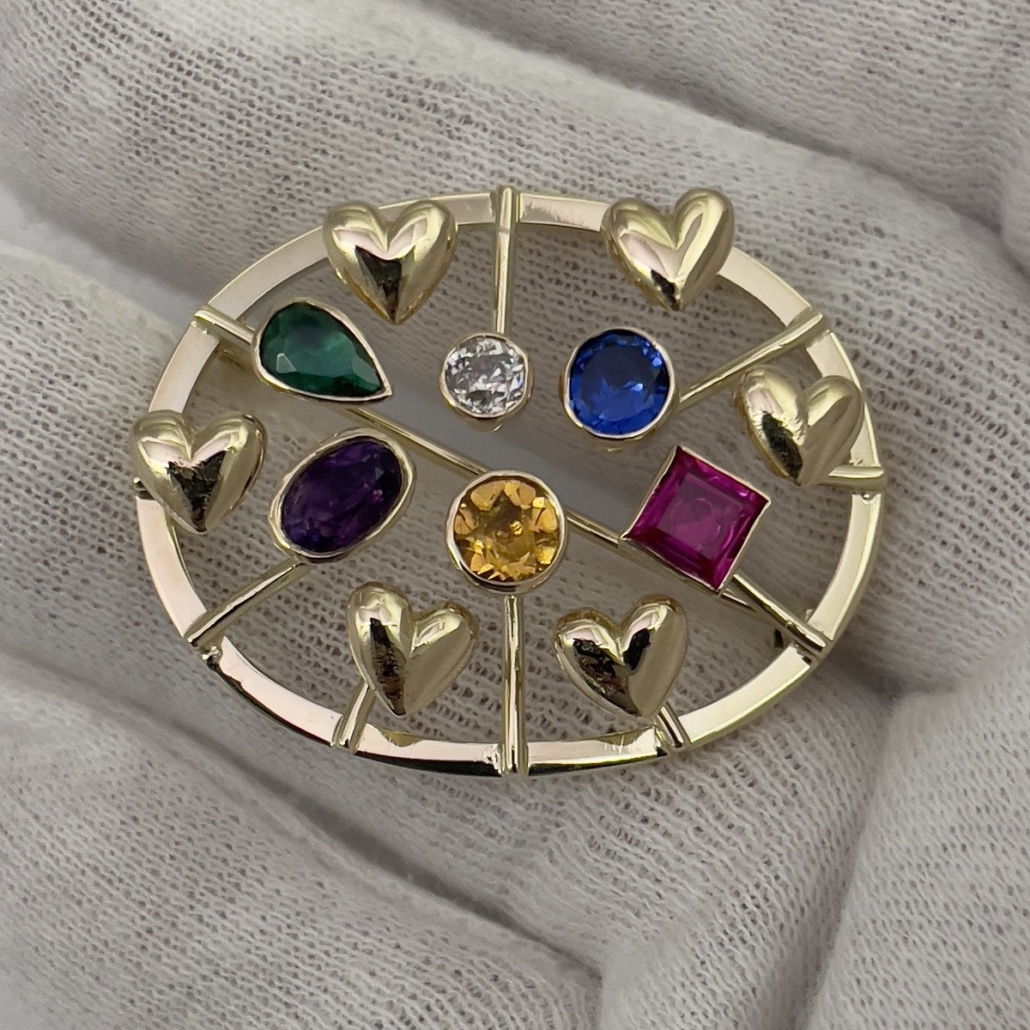 14k yellow gold family heirloom of teeth brooch redesigned with emerald, ruby, sapphire, amethyst, citrine, and a diamond.