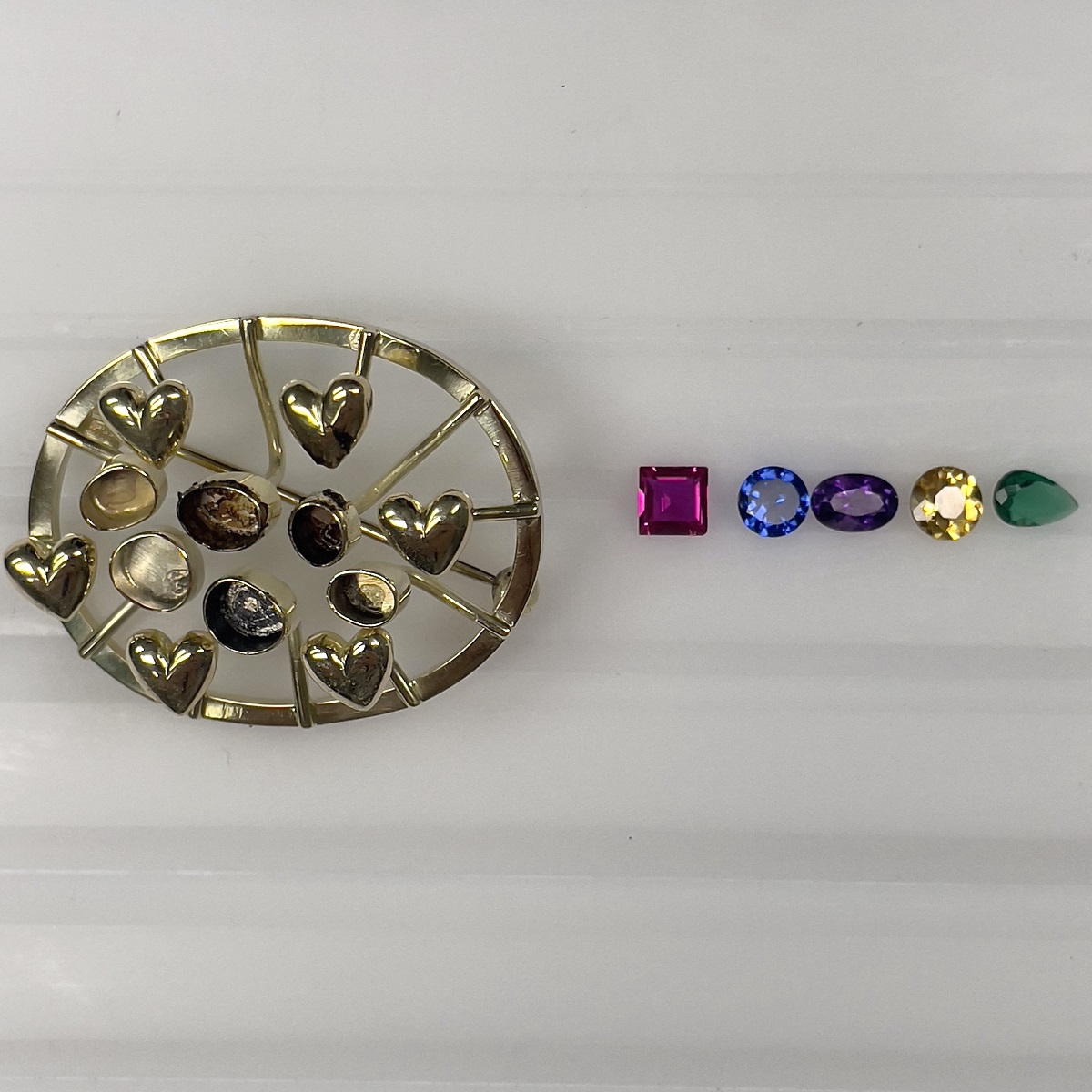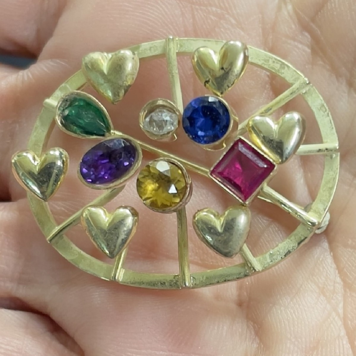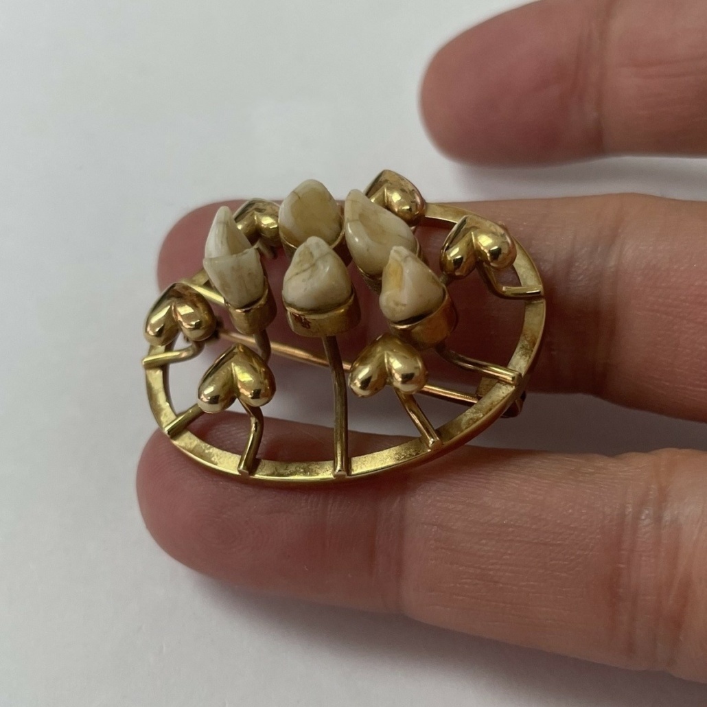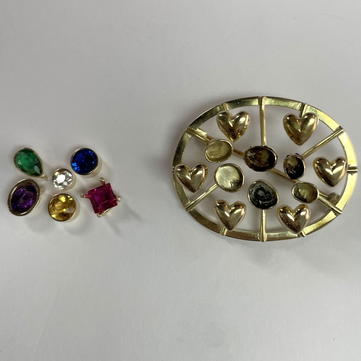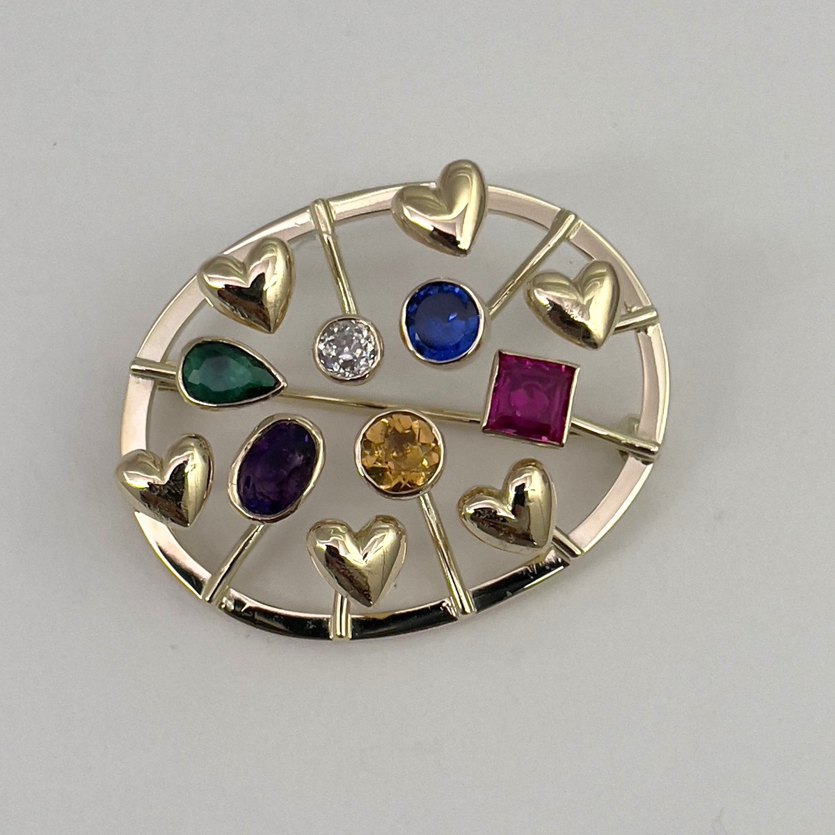 14k yellow gold family heirloom of teeth brooch redesigned with emerald, ruby, sapphire, amethyst, citrine, and a diamond.